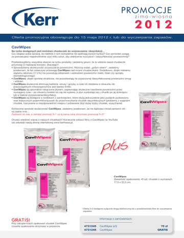 PROMOCJE zima-wiosna 2012 Oferta promocyjna obowiàzuje do 15 maja 2012 r. lub do wyczerpania zapasów. CaviWipes Na rynku dost´pnych jest mnóstwo chusteczek do oczyszczania i dezynfekcji… Czy zdajesz sobie spraw´, ˝e niektóre z nich kompletnie nie spe∏niajà swoich funkcji? Czy zwróci∏eÊ uwag´, ˝e potrzebujesz niejednokrotnie u˝yç kilku sztuk, aby efektywnie wyczyÊciç i zdezynfekowaç powierzchni´? PrzetestowaliÊmy wszystkie obecne na rynku produkty i jesteÊmy pewni, ˝e to w∏aÊnie nasze chusteczki przyniosà Ci najwi´cej korzyÊci. Dlaczego? • SprawdziliÊmy skutecznoÊç oczyszczenia powierzchni. Ró˝nic´ widaç „go∏ym okiem”. JesteÊmy przekonani, ˝e te˝ zobaczysz przewag´ CaviWipes nad innymi chusteczkami. Dodatkowo, dzi´ki niskiemu st´˝eniu alkoholu (17,2%) nie powodujà odbarwieƒ i uszkodzeƒ powierzchni mebli, foteli czy sprz´tu stomatologicznego! • CaviWipes, dzi´ki spoistej strukturze, nie pozostawiajà na czyszczonej /dezynfekowanej powierzchni smug i w∏ókien. • CaviWipes skutecznie eliminujà bakterie, wirusy i grzyby, a czas ich dzia∏ania w stosunku do poszczególnych mikroorganizmów jest bardzo krótki. • CaviWipes sà optymalnie nasàczone p∏ynem, zapewniajàc skuteczne nawil˝enie powierzchni przez wymagany czas – po otwarciu torebki nic si´ nie wylewa, a p∏yn wydostaje si´ z chustki po jej ÊciÊni´ciu lub w trakcie oczyszczania/dezynfekcji. • CaviWipes sà dost´pne w torebkach z zamkni´ciem, które s∏u˝à jednoczeÊnie jako podajnik pozbawiony wad klasycznych pojemników/puszek do przechowywania chustek dezynfekcyjnych (problemy z wyj´ciem chustek, rozrywanie w nieodpowiednim miejscu i pobieranie zbyt du˝ej liczby chustek, wysychanie) Koniecznie sprawdê skutecznoÊç CaviWipes. JesteÊmy przekonani, ˝e nie b´dziesz chcia∏ zamieniç ich na ˝adne inne… Zadzwoƒ do nas, a zamiast promocji 3+1 za t´ samà cen´ otrzymasz promocj´ 3+3!* Chcesz wiedzieç wi´cej o naszych chustkach? Koniecznie zobacz filmy o CaviWipes na YouTube lub odwiedê naszà stron´ internetowà www.kerrhawe.pl. CaviWipes ZawartoÊç opakowania: 45 szt. chustek o wymiarach 17,5 x 22,5 cm. * Oferta 3+3 dost´pna wy∏àcznie drogà telefonicznà lub u przedstawiciela Kerr do wyczerpania zapasów. GRATIS! Przy zakupie trzech opakowaƒ chustek CaviWipes czwarte opakowanie otrzymasz w prezencie. Informacja o zamówieniach: 4731245 CaviWipes (x3) 4731245 CaviWipes 75 z∏ GRATIS Premise Materia∏ kompozytowy o najlepszej estetyce Premise Syringe Standard Kit ZawartoÊç opakowania: 8 x 4 g strzykawek z materia∏em w odcieniach: Enamel A2, A3, A3.5, B2, Dentine A2, A3, A3.5, Translucent Clear; 1 x 5 ml butelka OptiBond XTR Primer; 1 x 5 ml butelka OptiBond XTR Adhesive; 50 aplikatorów; KerrHawe Polishing Kit; instrukcja u˝ycia. GRATIS! Przy zakupie Premise Syringe Standard Kit otrzymasz w prezencie dwie strzykawki z materia∏em Premise w dowolnym odcieniu! Informacja o zamówieniach: 35457 32712-32741 remise Syringe Standard Kit P Premise, strzykawka z materia∏em w dowolnym odcieniu (x2) 980 z∏ GRATIS Premise – pojedyncze strzykawki Dost´pne odcienie: – szkliwne: A1 (32712), A2 (32713), A3 (32714), A3.5 (32715), A4 (32716), B1 (32717), B2 (32718), B3 (32719), B4 (32720), C1 (32721), C2 (32722), C3 (32723), C4 (32724), D2 (32725), D3 (32726), D4 (32727), XL1 (32728), XL2 (32729), – z´binowe A2 (32730), A3 (32731), A3.5 (32732), A4 (32733), B1 (32734), B2 (32735), C2 (32736), D2 (32737), – translucentne: Amber (32738), Grey (32739), Clear (32740), Super Clear (32741). 95 z∏ Specjalna cena! Premise ZawartoÊç opakowania: 1 x 4 g strzykawka z materia∏em w wybranym odcieniu. Informacja o zamówieniach: 32712-32741 Premise, strzykawka z materia∏em w dowolnym odcieniu 95 z∏ Herculite XRV Niezawodny klasyk – najd∏u˝sze badania kliniczne wÊród materia∏ów kompozytowych. Herculite XRV Custom Kit ZawartoÊç opakowania: 4 x 5 g strzykawki z materia∏em w odcieniach szkliwnych A1, A2, A3, B2; 2 x 5 g strzykawki z materia∏em w odcieniach z´binowych A2, A3; 1 x 5 ml butelka OptiBond Solo Plus; 1 x 3 g strzykawka z wytrawiaczem Kerr Gel Etchant; 10 jednorazowych koƒcówek aplikacyjnych do wytrawiacza; 25 jednorazowych tacek do systemów wià˝àcych; 50 jednorazowych aplikatorów. GRATIS! Przy zakupie Herculite XRV Custom Kit otrzymasz w prezencie dwie strzykawki z materia∏em Herculite XRV w dowolnym odcieniu! Informacja o zamówieniach: 62811 7722859-7723392 Herculite XRV Custom kit Herculite XRV Syringe Refill (x2) 650 z∏ GRATIS Herculite XRV Syringe Refill – pojedyncze strzykawki Dost´pne odcienie: – odcienie szkliwne (Enamel), strzykawki 5 g: A1 (7722859), A2 (7722860), A3 (7722861), A3.5 (7722862), A4 (7722863), B1 (7722864), B2 (7722865), B3 (7722866), B4 (7722867), C1 (7722868), C2 (7722869), C3 (7722870), C4 (7722871), D2 (7722872), D3 (7722873), D4 (7722874), – odcienie z´binowe (Dentine), strzykawki 5 g: A1 (23391), A2 (7722875), A3 (7722876), A3.5 (7722877), A4 (23390), B1 (7722878), B2 (7722879), B3 (7723389), C1 (7723387), C2 (7722880), C3 (7723386), D2 (7722881), D3 (7723384). 69 z∏ Specjalna cena! Informacja o zamówieniach: 7722859-7723392 Herculite XRV Syringe Refill 69 z∏ OptiDisc Krà˝ki do opracowania wst´pnego i polerowania wype∏nieƒ Opakowania uzupe∏niajàce ZawartoÊç opakowania: – krà˝ki Coarse/Medium, Fine i Extra, Fine: 100 szt., – krà˝ki Extra Coarse: 80 szt. 82 z∏ Specjalna cena! Numery katalogowe uzupe∏nieƒ krà˝ków OptiDisc Rodzaj krà˝ka\Êrednica 9,6 mm 12,6 mm 15,9 mm Extra-Coarse 4197 4198 4199 Coarse/Medium 4181 4184 4191 Fine 4182 4185 4192 Extra-Fine 4183 4186 4193 Informacja o zamówieniach: 4181-4183 4184-4186 4191-4193 4197-4199 OptiDisc 9,6 mm, 100 szt. OptiDisc 12,6 mm,100 szt. OptiDisc 15,9 mm, 100 szt. OptiDisc Extra-Coarse, 80 szt. 82 82 82 82 z∏ z∏ z∏ z∏ Vertise Flow Samoadhezyjny materia∏ kompozytowy Ve