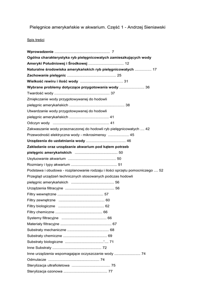 Pielęgnice amerykańskie w akwarium. Część 1 - Andrzej Sieniawski Spis treści Wprowadzenie ..................................................... 7 Ogólna charakterystyka ryb pielęgnicowatych zamieszkujących wody Ameryki Południowej i Środkowej .................................. 12 Naturalne środowiska amerykańskich ryb pielęgnicowatych ................ 17 Zachowanie pielęgnic ............................................... 25 Wielkość rewiru i ilość wody ......................................... 31 Wybrane problemy dotyczące przygotowania wody ........................ 36 Twardość wody ..................................................... 37 Zmiękczanie wody przygotowywanej do hodowli pielęgnic amerykańskich ..................................................... 38 Utwardzanie wody przygotowywanej do hodowli pielęgnic amerykańskich ...................................... 41 Odczyn wody ...................................................... 41 Zakwaszanie wody przeznaczonej do hodowli ryb pielęgnicowatych .... 42 Przewodność elektryczna wody - mikrosimensy .................... 45 Urządzenia do uzdatniania wody ...................................... 46 Zakładanie oraz urządzanie akwarium pod kątem potrzeb pielęgnic amerykańskich ......................................... 50 Usytuowanie akwarium .............................................. 50 Rozmiary i typy akwarium ............................................ 51 Podstawa i obudowa - rozplanowanie rodzaju i ilości sprzętu pomocniczego .... 52 Przegląd urządzeń technicznych stosowanych podczas hodowli pielęgnic amerykańskich ......................................... 56 Urządzenia filtracyjne ............................................... 56 Filtry wewnętrzne ............................................ 57 Filtry zewnętrzne ............................................ 60 Filtry biologiczne ............................................ 62 Filtry chemiczne ............................................. 66 Systemy filtracyjne ........................................... 66 Materiały filtracyjne ................................................. 67 Substraty mechaniczne ........................................ 68 Substraty chemiczne .......................................... 69 Substraty biologiczne .....................................'.... 71 Inne Substraty ............................................... 72 Inne urządzenia wspomagające oczyszczanie wody ......................... 74 Odmulacze ................................................. 74 Sterylizacja ultrafioletowa ..................................... 75 Sterylizacja ozonowa .......................................... 77 Urządzenia napowietrzające do akwarium ............................... 79 Materiały słuŜące do rozpylania powietrza ............................... 82 Systemy ogrzewania wody w akwarium .................................. 84 Oświetlenie w akwarium ............................................. 87 Urządzenia współpracujące z oświetleniem ........................ 90 Materiały dekoracyjne stosowane do urządzania akwarium dla pielęgnic ..... 92 Urządzanie akwarium .............................................. 96 Akwarium higieniczne ............................................... 97 Akwarium dekoracyjne .............................................. 98 Rola roślin wodnych w akwarium .................................... 103 Przegląd wybranych gatunków roślin wodnych .......................... 106 Rośliny wysokie o duŜych ilościach .................................... 107 Rośliny wysokie o wąskich liściach ..................................... 109 Rośliny średniej wysokości, które moŜna skracać i przycinać ................ 111 Rośliny, które trzeba przyczepiać do korzeni i kamieni .................... 113 Rośliny niskie do sadzenia w przedniej części akwarium ................... 114 Rośliny pływające .................................................. 116 Dezynfekcja roślin .................................................117 Dobór ryb do akwarium ............................................ 119 Ocena zakupywanych ryb ............................................ 122 Kwarantanna - sposób przeprowadzenia ............................... 126 Przegląd i charakterystyka wybranych gatunków pielęgnic amerykańskich ... 130 Acarichthys (Eigenmann, 1912) - kopiki............................... 131 Acaronia (Myers, 1940) - akaronie ................................... 133 Aeąuidens (Eigenmann i Bray, 1894) - akary ............................ 135 Amphilophus (Agassiz, 1858) ......................................... 146 Archocentrus (Gil i Bransford, 1877) ................................... 158 Astatheros ........................................................ 167 Astronotus (Swainson, 1839) – oskary ................................. 167 Batrachops (Heckel, 1840) - pielegnice grzebieniaste ..................... 170 Biotodoma (Eigenmann i Kennedy, 1903) - grzebce..................... 171 Bujurąuina (Kullander, 1986)......................................... 173 Caąuetaia (Fowler, 1945) ............................................ 178 Chaetobranchopsis (Steindachner, 1875) ................................ 181 Chaetobranchus (Heckel, 1840) ....................................... 183 Chuco (Fernandez-Yepez, 1969) ...................................... 184 Cichla (Bloch i Schneider, 1801) ...................................... 185 Cichlasoma (Swainson, 1839)......................................... 187 Cleithracara (Kullander i Nijssen, 1989) - adry.......................... 194 Copora (Fernandez-Yepez, 1969) ..................................... 196 Crenicichla (Heckel, 1840) - grzebienice............................... 196 Ctyptoheros ....................................................... 212 Literatura ....................................................... 213 Indeks .............................