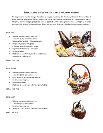 ŚWIĄTECZNE KOSZE PREZENTOWE Z POLSKIM WINEM! Na tegoroczne Święta Bożego Narodzenia przygotowaliśmy dla Państwa, Waszych Pracowników i Kontrahentów oryginalne kosze świąteczne pełne produktów regionalnych i tradycyjnych łakoci. Chcemy, abyście mogli spróbować wina z polskich winnic oraz przetworów z winogron, a także przypomnieli sobie smaki dzieciństwa dzięki pierniczkom, śliwce w czekoladzie i innym przysmakom… KOSZ DUŻY • • • • • Wino gronowe z polskich winnic: 2 butelki (0,7l)- czerwone i białe Winnica Płochockich i Winnica Adoria Oryginalny ocet winny (0,5l) i Owoce w winie z Winnicy Kinga Wyśmienite konfitury z winogron Herbata i kawa Słodycze (3 op.: Krówki, śliwki w czekoladzie, żurawina w czekoladzie) CENA 249 PLN KOSZ ŚREDNI • • • • • Wino gronowe z polskich winnic 1 butelka (0,7l)- do wyboru Ocet winny (0,5l) lub owoce w winie Konfitury z winogron Herbata lub kawa Słodycze (2 op.: krówki i śliwki w czekoladzie) CENA 169 PLN KOSZ MAŁY • • • Wino gronowe z polskich winnic 1 butelka (0,7l)- do wyboru Konfitury z winogron Słodycze (2 op.: krówki i śliwki w czekoladzie) CENA 99 PLN WIĘCEJ PRZYJEMNOŚCI TO LEPSZA CENA! • • Chcesz obdarować więcej osób? Proponujemy Świąteczny Zestaw Winokultury dla Twojej firmy i bliskich. Zestaw zawiera 5 koszy pełnych wysokiej jakości produktów, skomponowanych pod najbardziej wymagające gusta. Wszystko elegancko i smacznie spakowane! (2 małe + 2 średnie +1 duży) CENA 699 PLN W KAŻDYM KOSZU DODATKOWO ZNAJDZIECIE PAŃSTWO MINI-STROIK ŚWIĄTECZNY ORAZ PIERNICZKI DO POWIESZENIA NA CHOINCE CENY NIE ZAWIERAJĄ PODATKU VAT I KOSZTÓW DOSTAWY. Na specjalne zamówienia skomponujemy kosze tematyczne: z eko-produktami lub z winami z innych regionów winiarskich, a także wypełnimy zestawy wybranymi przez Państwa produktami… Zapraszamy! KONTAKT: Aleksander Sucharda (+48) 884 800 023 [email protected] www.WinoKultura.pl