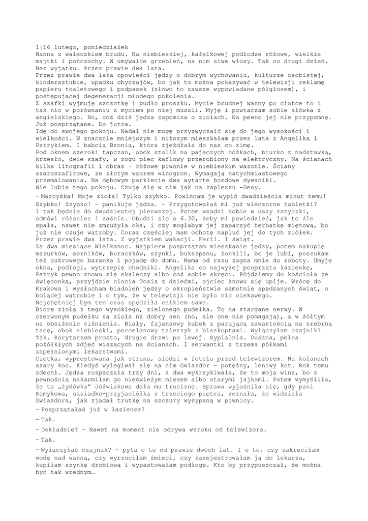 1|16 lutego, poniedziałek Wanna z wałeczkiem brudu. Na niebieskiej, kafelkowej podłodze różowe, wielkie majtki i pończochy. W umywalce grzebień, na nim siwe włosy. Tak co drugi dzień. Bez wyjątku. Przez prawie dwa lata. Przez prawie dwa lata opowieści jędzy o dobrym wychowaniu, kulturze osobistej, kindersztubie, upadku obyczajów, bo jak to można pokazywać w telewizji reklamę papieru toaletowego i podpasek (słowo to zawsze wypowiadane półgłosem), i postępującej degeneracji młodego pokolenia. Z szafki wyjmuję szczotkę i pudło proszku. Mycie brudnej wanny po ciotce to i tak nic w porównaniu z myciem po niej muszli. Myję i powtarzam sobie słówka z angielskiego. No, coś dziś jędza zapomina o ziołach. Na pewno jej nie przypomnę. Już posprzątane. Do jutra. Idę do swojego pokoju. Nadal nie mogę przyzwyczaić się do jego wysokości i wielkości. W znacznie mniejszym i niższym mieszkałam przez lata z Angeliką i Patrykiem. I babcią Bronią, która zjeżdżała do nas co zimę. Pod oknem szeroki tapczan, obok stolik na pajęczych nóżkach, biurko z nadstawką, krzesło, dwie szafy, w rogu piec kaflowy przerobiony na elektryczny. Na ścianach kilka litografii i obraz – różowe piwonie w niebieskim wazonie. Ściany szaroszafirowe, ze złotym wzorem winogron. Wymagają natychmiastowego przemalowania. Na dębowym parkiecie dwa wytarte bordowe dywaniki. Nie lubię tego pokoju. Czuję się w nim jak na zapleczu -Desy. – Marcyśka! Moje zioła! Tylko szybko. Powinnam je wypić dwadzieścia minut temu! Szybko! Szybko! – panikuje jędza. – Przygotowałaś mi już wieczorne tabletki? I tak będzie do dwudziestej pierwszej. Potem wsadzi sobie w uszy zatyczki, odmówi różaniec i zaśnie. Obudzi się o 6.30, żeby mi powiedzieć, jak to źle spała, nawet nie zmrużyła oka, i czy mogłabym jej zaparzyć herbatkę miętową, bo już nie czuje wątroby. Coraz częściej mam ochotę napluć jej do tych ziółek. Przez prawie dwa lata. Z wyjątkiem wakacji. Ferii. I świąt. Za dwa miesiące Wielkanoc. Najpierw posprzątam mieszkanie jędzy, potem nakupię mazurków, serników, buraczków, szynki, bukszpanu, żonkili, bo je lubi, poszukam też cukrowego baranka i pojadę do domu. Mama od razu zagna mnie do roboty. Umyję okna, podłogi, wytrzepię chodniki. Angelika co najwyżej posprząta łazienkę, Patryk pewno znowu się skaleczy albo coś sobie skręci. Pójdziemy do kościoła ze święconką, przyjdzie ciocia Tosia z dziećmi, ojciec znowu się upije. Wrócę do Krakowa i wysłucham biadoleń jędzy o okropieństwie samotnie spędzanych świąt, o bolącej wątrobie i o tym, że w telewizji nie było nic ciekawego. Najchętniej bym ten czas spędziła całkiem sama. Biorę zioła z tego wysokiego, zielonego pudełka. To na stargane nerwy. W czerwonym pudełku są zioła na dobry sen (no, ale one nie pomagają), a w żółtym na obniżenie ciśnienia. Biały, fajansowy kubek z parującą zawartością na srebrną tacę, obok niebieski, porcelanowy talerzyk z biszkoptami. Wyłączyłam czajnik? Tak. Korytarzem prosto, drugie drzwi po lewej. Sypialnia. Duszna, pełna pożółkłych zdjęć wiszących na ścianach. I serwantki z trzema półkami zapełnionymi lekarstwami. Ciotka, wyprostowana jak struna, siedzi w fotelu przed telewizorem. Na kolanach szary koc. Kiedyś wylegiwał się na nim Gwiazdor – potężny, leniwy kot. Rok temu zdechł. Jędza rozpaczała trzy dni, a dwa wykrzykiwała, że to moja wina, bo z pewnością nakarmiłam go nieświeżym mięsem albo starymi jajkami. Potem wymyśliła, że ta „żydówka” Jóźwiakowa dała mu truciznę. Sprawa wyjaśniła się, gdy pani Kamykowa, sąsiadko-przyjaciółka z trzeciego piętra, zeznała, że widziała Gwiazdora, jak zjadał trutkę na szczury wysypaną w piwnicy. – Posprzątałaś już w łazience? – Tak. – Dokładnie? – Nawet na moment nie odrywa wzroku od telewizora. – Tak. – Wyłączyłaś czajnik? – pyta o to od prawie dwóch lat. I o to, czy zakręciłam wodę nad wanną, czy wyrzuciłam śmieci, czy zarejestrowałam ją do lekarza, kupiłam szynkę drobiową i wypastowałam podłogę. Kto by przypuszczał, że można być tak wrednym… – Wyłączyłaś czajnik? – powtarza zniecierpliwiona. – Tak. – Na pewno? – Na pewno. – To dobrze. Jednej mojej znajomej dom się spalił. Zapomnieli wyłączyć żelazko. Wyjechali na parę dni. A jak wrócili, to już nie mieli nic. – Słyszałam tę historyjkę już z tysiąc razy. Stawiam tacę na okrągłym stoliku i przeciągam go w stronę fotela. – Znowu była reklama podpasek – szepcze teatralnie. – Takich dziwnych. Z jednej strony to tak cienkie, że ich prawie nie było. Ale miały motylki. – Skrzydełka – poprawiam bezwiednie. – Zaraz będzie film. Ten o miłości. Pooglądasz ze mną? – Nie mogę. – Nigdy nie masz dla mnie czasu! – w głosie pretensja, usta w podkowę, wszędzie zmarszczki, wzrok obrażony. Wygląda to komicznie. Naraz mam ochotę podrażnić się z nią. – A może przełączymy na inny program? – pytam z grzecznym uśmiechem. – Na jakiś film dokumentalny? – Ale ja chcę romans. – Film dokumentalny to bym obejrzała. Jędza myśli. Albo romans solo, albo dokument ze mną. I wtedy ma do kogo mówić. A tego jej cały czas brakuje. Przerzuca kanały. Patrzę na nią ukradkiem. To kiedyś musiała być piękna kobieta. Mama mówiła, że z ciotki zawsze była niezła dziwaczka. Wyjechała z Miąsowej do Krakowa szukać pracy. Znalazła ją jako służąca, a potem znalazła męża. Jakiegoś Henryka, urzędnika pocztowego, starszego od niej o dziesięć lat. Henryk umarł zaraz po wojnie, ciotka została sama. Te zdjęcia na ścianach to właśnie jego. Chudy, ponury mężczyzna ze śmiesznymi wąsami. – Oj, dobrze, niech już będzie. Tylko nie o wojnie – zastrzega. – O wojnie nie. Nie kręć się. Aha. Podaj mi poduszkę. Podłożę sobie pod plecy. Nie, nie n
