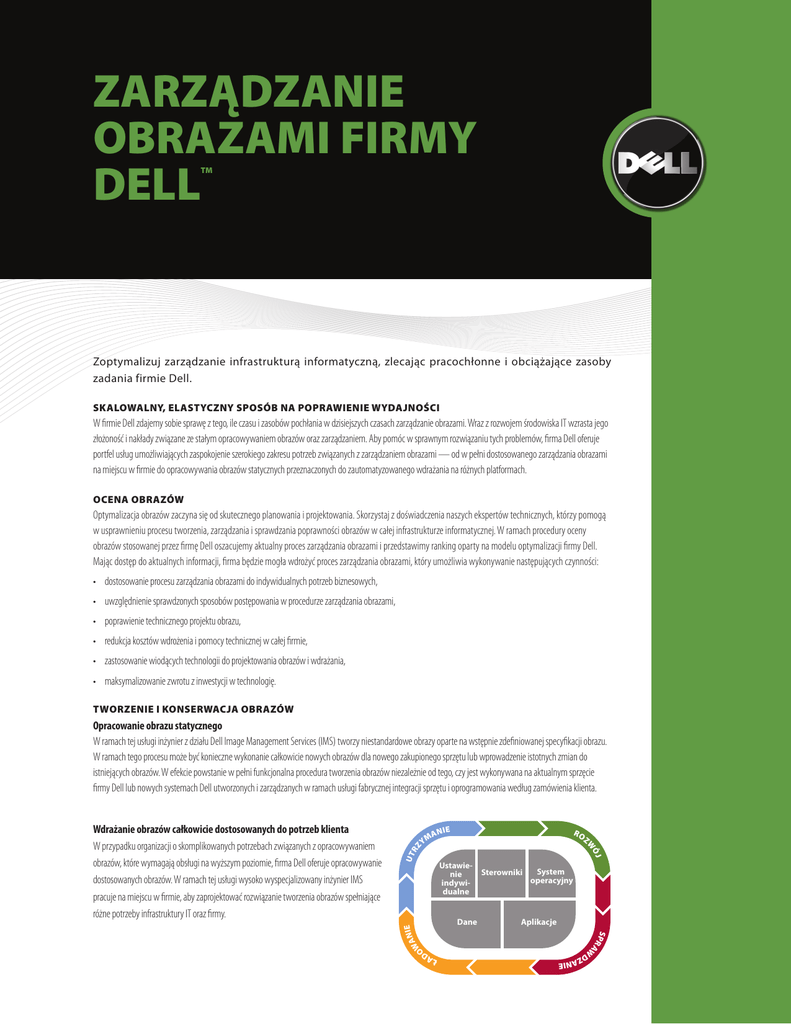 ZARZĄDZANIE OBRAZAMI FIRMY DELL TM Zoptymalizuj zarządzanie infrastrukturą informatyczną, zlecając pracochłonne i obciążające zasoby zadania firmie Dell. SKALOWALNY, ELASTYCZNY SPOSÓB NA POPRAWIENIE WYDAJNOŚCI W firmie Dell zdajemy sobie sprawę z tego, ile czasu i zasobów pochłania w dzisiejszych czasach zarządzanie obrazami. Wraz z rozwojem środowiska IT wzrasta jego złożoność i nakłady związane ze stałym opracowywaniem obrazów oraz zarządzaniem. Aby pomóc w sprawnym rozwiązaniu tych problemów, firma Dell oferuje portfel usług umożliwiających zaspokojenie szerokiego zakresu potrzeb związanych z zarządzaniem obrazami — od w pełni dostosowanego zarządzania obrazami na miejscu w firmie do opracowywania obrazów statycznych przeznaczonych do zautomatyzowanego wdrażania na różnych platformach. OCENA OBRAZÓW Optymalizacja obrazów zaczyna się od skutecznego planowania i projektowania. Skorzystaj z doświadczenia naszych ekspertów technicznych, którzy pomogą w usprawnieniu procesu tworzenia, zarządzania i sprawdzania poprawności obrazów w całej infrastrukturze informatycznej. W ramach procedury oceny obrazów stosowanej przez firmę Dell oszacujemy aktualny proces zarządzania obrazami i przedstawimy ranking oparty na modelu optymalizacji firmy Dell. Mając dostęp do aktualnych informacji, firma będzie mogła wdrożyć proces zarządzania obrazami, który umożliwia wykonywanie następujących czynności: • dostosowanie procesu zarządzania obrazami do indywidualnych potrzeb biznesowych, • uwzględnienie sprawdzonych sposobów postępowania w procedurze zarządzania obrazami, • poprawienie technicznego projektu obrazu, • redukcja kosztów wdrożenia i pomocy technicznej w całej firmie, • zastosowanie wiodących technologii do projektowania obrazów i wdrażania, • maksymalizowanie zwrotu z inwestycji w technologię. tworzenie i konserwacja obrazów A YM NIE RO Z W UT ÓJ Ustawienie indywidualne System operacyjny Aplikacje A DZ AN W O S PR IE Dane Sterowniki W ANIE ŁA D Wdrażanie obrazów całkowicie dostosowanych do potrzeb klienta W przypadku organizacji o skomplikowanych potrzebach związanych z opracowywaniem obrazów, które wymagają obsługi na wyższym poziomie, firma Dell oferuje opracowywanie dostosowanych obrazów. W ramach tej usługi wysoko wyspecjalizowany inżynier IMS pracuje na miejscu w firmie, aby zaprojektować rozwiązanie tworzenia obrazów spełniające różne potrzeby infrastruktury IT oraz firmy. RZ Opracowanie obrazu statycznego W ramach tej usługi inżynier z działu Dell Image Management Services (IMS) tworzy niestandardowe obrazy oparte na wstępnie zdefiniowanej specyfikacji obrazu. W ramach tego procesu może być konieczne wykonanie całkowicie nowych obrazów dla nowego zakupionego sprzętu lub wprowadzenie istotnych zmian do istniejących obrazów. W efekcie powstanie w pełni funkcjonalna procedura tworzenia obrazów niezależnie od tego, czy jest wykonywana na aktualnym sprzęcie firmy Dell lub nowych systemach Dell utworzonych i zarządzanych w ramach usługi fabrycznej integracji sprzętu i oprogramowania według zamówienia klienta. imagedirect: kontrola w Twoich rękach Dzięki interfejsowi internetowemu online ImageDirect możesz tworzyć, ładować i zarządzać obrazami niestandardowymi w zakupionych systemach klienckich Dell w bezpiecznym środowisku. Usługa ImageDirect jest w pełni zintegrowana z systemami produkcyjnymi firmy Dell, dzięki czemu utworzone obrazy mogą być bezproblemowo wdrożone na komputerach klienta podczas procesu produkcyjnego. Ponadto pozwalając klientowi skupić się na zarządzaniu pojedynczym obrazem, który działa na różnych platformach i w różnych działach, i znacząco automatyzując znaczną część związanej z tym pracy, usługa ImageDirect upraszcza zarządzanie obrazami i umożliwia tworzenie bardziej niezawodnych obrazów. uprość zarządzanie obrazami Oparte o interfejs złożony z ikon narzędzie umożliwia importowanie i tworzenie obrazów oraz zarządzanie nimi, przesyłanie składników i zarządzanie nimi oraz pobieranie obrazów i sterowników. Ponadto można pobierać obrazy w celu kontroli poprawności ich pracy w docelowym środowisku. • J eden obraz dla aktualnych i przyszłych systemów klienckich — ImageDirect umożliwia opracowanie jednego obrazu głównego i stosowanie go na wszystkich nowych platformach i grupach użytkowników, co niezwykle ułatwia zarządzanie obrazami. • R elacja polegająca na hierarchii elementów nadrzędnych i podrzędnych — obraz nadrzędny zawiera system operacyjny i wszystkie standardowe aplikacje, a obrazy podrzędne zawierają aplikacje właściwe dla określonych działów; zmiany w obrazie nadrzędnym są replikowane w obrazach podrzędnych, co skraca pracochłonność wdrożenia. • A plikacja jest instalowana ze źródła klienta lub z biblioteki firmy Dell — możesz przesłać swoje własne aplikacje lub wybrać aplikację z biblioteki firmy Dell. Zapewnia to elastyczność wyboru i świadomość, że możesz szybko zastosować najnowsze aplikacje. • Ł atwe zarządzanie sterownikami — dzięki jednemu obrazowi dla wszystkich aktualnych oraz przyszłych systemów Dell Precision,™ OptiPlex™ i Latitude™ zarządzanie sterownikami jest uproszczone. • S prawdzanie poprawności obrazów i ich testowanie — przed wdrożeniem obrazu firma Dell sprawdza poprawność obrazu, korzystając ze swojej wiedzy i doświadczenia. Pozwala to zapewnić jego integralność, brak wirusów oraz instalację najnowszych składników i wybranych przez klienta poprawek zabezpieczeń. Działanie oparte na ikonach Utwórz obraz Importuj obraz Prześlij składniki Zarządzaj obrazami Zarządzaj składnikami Pobierz obrazy i sterowniki dodatkowe usługi zarządzania obrazami W ramach kompletnej oferty opracowywania obrazów firma Dell może pomóc pracownikom IT Twojej firmy w stałej konserwacji 