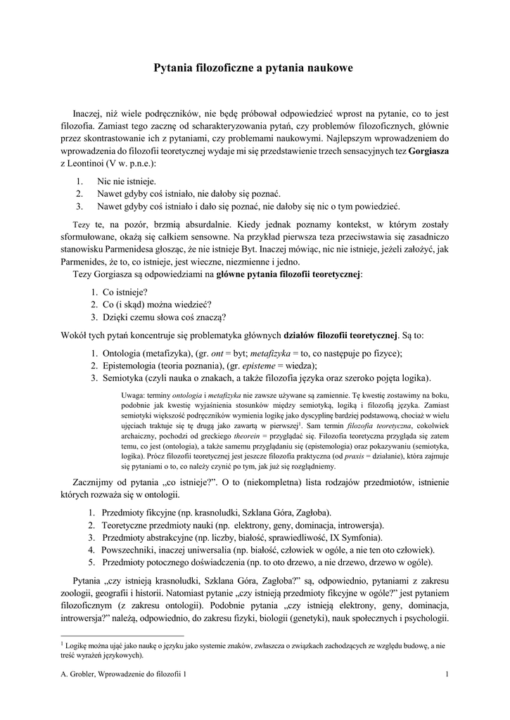 Pytania filozoficzne a pytania naukowe Inaczej, niż wiele podręczników, nie będę próbował odpowiedzieć wprost na pytanie, co to jest filozofia. Zamiast tego zacznę od scharakteryzowania pytań, czy problemów filozoficznych, głównie przez skontrastowanie ich z pytaniami, czy problemami naukowymi. Najlepszym wprowadzeniem do wprowadzenia do filozofii teoretycznej wydaje mi się przedstawienie trzech sensacyjnych tez Gorgiasza z Leontinoi (V w. p.n.e.): 1. 2. 3. Nic nie istnieje. Nawet gdyby coś istniało, nie dałoby się poznać. Nawet gdyby coś istniało i dało się poznać, nie dałoby się nic o tym powiedzieć. Tezy te, na pozór, brzmią absurdalnie. Kiedy jednak poznamy kontekst, w którym zostały sformułowane, okażą się całkiem sensowne. Na przykład pierwsza teza przeciwstawia się zasadniczo stanowisku Parmenidesa głosząc, że nie istnieje Byt. Inaczej mówiąc, nic nie istnieje, jeżeli założyć, jak Parmenides, że to, co istnieje, jest wieczne, niezmienne i jedno. Tezy Gorgiasza są odpowiedziami na główne pytania filozofii teoretycznej: 1. Co istnieje? 2. Co (i skąd) można wiedzieć? 3. Dzięki czemu słowa coś znaczą? Wokół tych pytań koncentruje się problematyka głównych działów filozofii teoretycznej. Są to: 1. Ontologia (metafizyka), (gr. ont = byt; metafizyka = to, co następuje po fizyce); 2. Epistemologia (teoria poznania), (gr. episteme = wiedza); 3. Semiotyka (czyli nauka o znakach, a także filozofia języka oraz szeroko pojęta logika). Uwaga: terminy ontologia i metafizyka nie zawsze używane są zamiennie. Tę kwestię zostawimy na boku, podobnie jak kwestię wyjaśnienia stosunków między semiotyką, logiką i filozofią języka. Zamiast semiotyki większość podręczników wymienia logikę jako dyscyplinę bardziej podstawową, chociaż w wielu ujęciach traktuje się tę drugą jako zawartą w pierwszej1. Sam termin filozofia teoretyczna, cokolwiek archaiczny, pochodzi od greckiego theorein = przyglądać się. Filozofia teoretyczna przygląda się zatem temu, co jest (ontologia), a także samemu przyglądaniu się (epistemologia) oraz pokazywaniu (semiotyka, logika). Prócz filozofii teoretycznej jest jeszcze filozofia praktyczna (od praxis = działanie), która zajmuje się pytaniami o to, co należy czynić po tym, jak już się rozglądniemy. Zacznijmy od pytania „co istnieje?”. O to (niekompletna) lista rodzajów przedmiotów, istnienie których rozważa się w ontologii. 1. 2. 3. 4. 5. Przedmioty fikcyjne (np. krasnoludki, Szklana Góra, Zagłoba). Teoretyczne przedmioty nauki (np. elektrony, geny, dominacja, introwersja). Przedmioty abstrakcyjne (np. liczby, białość, sprawiedliwość, IX Symfonia). Powszechniki, inaczej uniwersalia (np. białość, człowiek w ogóle, a nie ten oto człowiek). Przedmioty potocznego doświadczenia (np. to oto drzewo, a nie drzewo, drzewo w ogóle). Pytania „czy istnieją krasnoludki, Szklana Góra, Zagłoba?” są, odpowiednio, pytaniami z zakresu zoologii, geografii i historii. Natomiast pytanie „czy istnieją przedmioty fikcyjne w ogóle?” jest pytaniem filozoficznym (z zakresu ontologii). Podobnie pytania „czy istnieją elektrony, geny, dominacja, introwersja?” należą, odpowiednio, do zakresu fizyki, biologii (genetyki), nauk społecznych i psychologii. Logikę można ująć jako naukę o języku jako systemie znaków, zwłaszcza o związkach zachodzących ze względu budowę, a nie treść wyrażeń językowych). 1 A. Grobler, Wprowadzenie do filozofii 1 1 Natomiast „czy istnieją przedmioty, o których mowa w teoriach naukowych, a które nie są dostępne ludzkiemu doświadczeniu” jest pytaniem filozoficznym (z zakresu ontologii, filozofii nauki). „Czy istnieje rozwiązanie takiego-a-takiego równania?” jest pytaniem matematycznym, zaś „czy liczby w ogóle istnieją (bo przecież nie ma ich w żadnym określonym miejscu)?” jest pytaniem filozoficznym. Te przykłady pozwalają zauważyć, że pytania filozoficzne (w tym przypadku – metafizyczne) są o wiele ogólniejsze od pytań naukowych. Mają one charakter podstawowy, natomiast pytania naukowe z góry zakładają już określone rozstrzygnięcia metafizyczne (na przykład fizyka klasyczna zakłada z góry, że istnieją przedmioty konkretne, tj. przedmioty usytuowane w przestrzeni i czasie, a matematyka klasyczna zakłada z góry, że istnieją przedmioty abstrakcyjne, jak liczby, zbiory, funkcje itp.). Podstawowa zasada rozstrzygania pytań o istnienie określonych rodzajów przedmiotów pochodzi od Parmenidesa: Podstawowa zasada ontologiczna: istnieje to, i tylko to, co jest identyczne ze sobą. No entity without identity czyli istnieć = zachowywać tożsamość. Smok Wawelski istnieje wtedy i tylko wtedy, gdy istnieją podstawy do rozstrzygnięcia, czy w powieści Pagaczewskiego o profesorze Gąbce występuje ten sam Smok Wawelski, o którym legenda mówi, że pożerał dziewice do czasu, kiedy szewczyk Skuba dał mu popalić, czy też jakiś inny Smok Wawelski, który akurat tak samo się nazywa. (W pierwszym przypadku jest niemożliwe, aby zarówno legenda, jak i powieści Pagaczewskiego mówiły prawdę). Jeżeli nie ma podstaw do znalezienia odpowiedzi na to pytanie, Smok Wawelski nie istnieje. IX Symfonia istnieje wtedy i tylko wtedy, gdy można zasadnie ustalić, czy melodia, którą gwiżdżę sobie przy goleniu, jest tą samą IX Symfonią, którą wczoraj wykonała Wielka Orkiestra Opery Głównej pod batutą Naczelnego Dyrygenta. Ja istnieję dzięki temu, że Państwo mają podstawy, aby uważać, że Adam Grobler, który rozpoczął ten wykład, jest tym samym Adamem Groblerem, który teraz mówi te słowa (ja też mam takie podstawy). Teorie metafizyczne a teorie naukowe Do wniosku, że nic nie istnieje, doprowadziło Gorgiasza następujące rozumowanie: 1. 2. 3. 4. 5. 6. Istnieje tylko jeden, wieczny i niezmienny Byt (jak głosi Parmenides). Ale gdzie Byt istnieje? Nie 