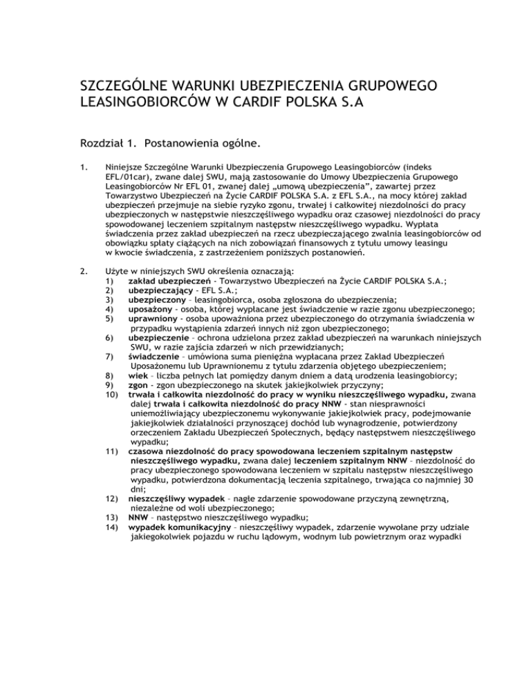 SZCZEGÓLNE WARUNKI UBEZPIECZENIA GRUPOWEGO LEASINGOBIORCÓW W CARDIF POLSKA S.A Rozdział 1. Postanowienia ogólne. 1. Niniejsze Szczególne Warunki Ubezpieczenia Grupowego Leasingobiorców (indeks EFL/01car), zwane dalej SWU, mają zastosowanie do Umowy Ubezpieczenia Grupowego Leasingobiorców Nr EFL 01, zwanej dalej „umową ubezpieczenia”, zawartej przez Towarzystwo Ubezpieczeń na śycie CARDIF POLSKA S.A. z EFL S.A., na mocy której zakład ubezpieczeń przejmuje na siebie ryzyko zgonu, trwałej i całkowitej niezdolności do pracy ubezpieczonych w następstwie nieszczęśliwego wypadku oraz czasowej niezdolności do pracy spowodowanej leczeniem szpitalnym następstw nieszczęśliwego wypadku. Wypłata świadczenia przez zakład ubezpieczeń na rzecz ubezpieczającego zwalnia leasingobiorców od obowiązku spłaty ciąŜących na nich zobowiązań finansowych z tytułu umowy leasingu w kwocie świadczenia, z zastrzeŜeniem poniŜszych postanowień. 2. UŜyte w niniejszych SWU określenia oznaczają: 1) zakład ubezpieczeń - Towarzystwo Ubezpieczeń na śycie CARDIF POLSKA S.A.; 2) ubezpieczający - EFL S.A.; 3) ubezpieczony – leasingobiorca, osoba zgłoszona do ubezpieczenia; 4) uposaŜony - osoba, której wypłacane jest świadczenie w razie zgonu ubezpieczonego; 5) uprawniony - osoba upowaŜniona przez ubezpieczonego do otrzymania świadczenia w przypadku wystąpienia zdarzeń innych niŜ zgon ubezpieczonego; 6) ubezpieczenie – ochrona udzielona przez zakład ubezpieczeń na warunkach niniejszych SWU, w razie zajścia zdarzeń w nich przewidzianych; 7) świadczenie – umówiona suma pienięŜna wypłacana przez Zakład Ubezpieczeń UposaŜonemu lub Uprawnionemu z tytułu zdarzenia objętego ubezpieczeniem; 8) wiek – liczba pełnych lat pomiędzy danym dniem a datą urodzenia leasingobiorcy; 9) zgon - zgon ubezpieczonego na skutek jakiejkolwiek przyczyny; 10) trwała i całkowita niezdolność do pracy w wyniku nieszczęśliwego wypadku, zwana dalej trwała i całkowita niezdolność do pracy NNW - stan niesprawności uniemoŜliwiający ubezpieczonemu wykonywanie jakiejkolwiek pracy, podejmowanie jakiejkolwiek działalności przynoszącej dochód lub wynagrodzenie, potwierdzony orzeczeniem Zakładu Ubezpieczeń Społecznych, będący następstwem nieszczęśliwego wypadku; 11) czasowa niezdolność do pracy spowodowana leczeniem szpitalnym następstw nieszczęśliwego wypadku, zwana dalej leczeniem szpitalnym NNW – niezdolność do pracy ubezpieczonego spowodowana leczeniem w szpitalu następstw nieszczęśliwego wypadku, potwierdzona dokumentacją leczenia szpitalnego, trwająca co najmniej 30 dni; 12) nieszczęśliwy wypadek – nagłe zdarzenie spowodowane przyczyną zewnętrzną, niezaleŜne od woli ubezpieczonego; 13) NNW – następstwo nieszczęśliwego wypadku; 14) wypadek komunikacyjny – nieszczęśliwy wypadek, zdarzenie wywołane przy udziale jakiegokolwiek pojazdu w ruchu lądowym, wodnym lub powietrznym oraz wypadki Strona 2 15) powstałe podczas poruszania się ubezpieczonego jako pieszego i uderzenia przez jakikolwiek pojazd będący w ruchu; pojazd - urządzenie mechaniczne przeznaczone do transportu lądowego posiadające silnik, oraz rowery i wszelkie urządzenia do transportu wodnego lub lotniczego. Rozdział 2. Przedmiot i zakres ubezpieczenia. 1. Przedmiotem ubezpieczenia jest Ŝycie i zdrowie ubezpieczonych. 2. Zakład ubezpieczeń spełni świadczenie w razie zajścia następujących zdarzeń: 1) zgonu ubezpieczonego, 2) trwałej i całkowitej niezdolności do pracy ubezpieczonego w wyniku NNW, 3) leczenia szpitalnego NNW. 3. W razie zajścia zdarzenia przewidzianego w ust. 2 odpowiedzialność zakładu ubezpieczeń polega na wypłacie uposaŜonemu lub uprawnionemu, z zastrzeŜeniem postanowień SWU, świadczenia w wysokości określonej w Rozdziale 6. Rozdział 3. Objęcie ochroną ubezpieczeniową. 1. Zakład Ubezpieczeń obejmie ochroną ubezpieczeniową leasingobiorców, dla których suma ubezpieczenia określona na dzień zgłoszenia do ubezpieczenia nie przekracza 400 000 PLN, oraz którzy spełniają poniŜsze warunki: 1) wiek, w terminie spłaty ostatniej raty leasingu określonym w umowie leasingu, nie przekroczy limitu 70 lat, 2) wyrazili zgodę na objęcie ochroną w formie podpisania Deklaracji Zgody na Objęcie Ochroną. 2. Liczba osób zgłoszonych do ubezpieczenia w ramach jednej umowy leasingu nie moŜe przekroczyć 3, przy czym kaŜda zmiana osoby zgłaszanej do ubezpieczenia wymaga pisemnej zgody Zakładu Ubezpieczeń oraz wypełnienia przez tę osobę formularza ubezpieczeniowego dostarczonego przez Zakład Ubezpieczeń. 3. W przypadku objęcia ochroną ubezpieczeniową więcej niŜ jednej osoby w ramach jednej umowy leasingu, wysokość sum ubezpieczenia określonych w umowie ubezpieczenia jest dzielona proporcjonalnie do liczby ubezpieczonych. Rozdział 4. Początek odpowiedzialności zakładu ubezpieczeń. 1. Objęcie danej osoby ubezpieczeniem następuje po spełnieniu warunków określonych w Rozdziale 3, z zastrzeŜeniem ust. 3 niniejszego Rozdziału. Strona 3 2. Objęcie danej osoby ubezpieczeniem potwierdzone jest umieszczeniem przez ubezpieczającego numeru umowy leasingu zawartej z ubezpieczającym na liście umów leasingu osób objętych ubezpieczeniem. 3. Odpowiedzialność zakładu ubezpieczeń względem ubezpieczonego rozpoczyna się: 1) trzydziestego dnia po dniu podpisania przez tę osobę protokołu zdawczo-odbiorczego w przypadku zajścia zdarzenia zgonu jeŜeli nastąpił on z przyczyn innych niŜ zawał serca, udar mózgu lub nieszczęśliwy wypadek, 2) w dniu podpisania przez tę osobę protokołu zdawczo-odbiorczego w pozostałych przypadkach. Rozdział 5. Wypowiedzenie i odstąpienie od umowy ubezpieczenia. Odstąpienie lub wypowiedzenie umowy ubezpieczenia przez ubezpieczającego nie moŜe dotyczyć osób juŜ ubezpieczonych, wobec których odpowiedzialność zakładu ubezpieczeń wygasa zgodnie z po
