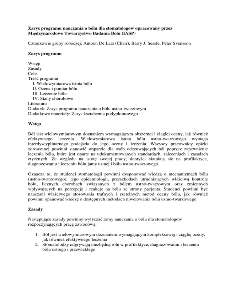 Zarys programu nauczania o bólu dla stomatologów opracowany przez Międzynarodowe Towarzystwo Badania Bólu (IASP) Członkowie grupy roboczej: Antoon De Laat (Chair), Barry J. Sessle, Peter Svensson Zarys programu Wstęp Zasady Cele Treść programu I. Wielowymiarowa istota bólu II. Ocena i pomiar bólu III. Leczenie bólu IV. Stany chorobowe Literatura Dodatek: Zarys programu nauczania o bólu ustno-twarzowym Dodatkowe materiały: Zarys kształcenia podyplomowego Wstęp Ból jest wielowymiarowym doznaniem wymagającym obszernej i ciągłej oceny, jak również efektywnego leczenia. Wielowymiarowa istota bólu ustno-twarzowego wymaga interdyscyplinarnego podejścia do jego oceny i leczenia. Wszyscy pracownicy opieki zdrowotnej powinni stanowić wsparcie dla osób odczuwających ból poprzez zapewnienie leczenia bólu, które jest oparte na udokumentowanych standardach, zaleceniach i zasadach etycznych. Ze względu na istotę swojej pracy, dentyści skupiają się na profilaktyce, diagnozowaniu i leczeniu bólu jamy ustnej i bólu ustno-twarzowego. Oznacza to, że studenci stomatologii powinni dysponować wiedzą o mechanizmach bólu (ustno-twarzowego), jego epidemiologii, przeszkodach utrudniających właściwą kontrolę bólu, licznych chorobach związanych z bólem ustno-twarzowym oraz zmiennych wpływających na percepcję i reakcję na bólu ze strony pacjenta. Studenci powinni być nauczani właściwego stosowania trafnych i rzetelnych metod oceny bólu, jak również powinni opanować wiedzę o dostępnych metodach niwelowania bólu ustno-twarzowego. Zasady Następujące zasady powinny wytyczać ramy nauczania o bólu dla stomatologów rozpoczynających pracę zawodową: 1. Ból jest wielowymiarowym doznaniem wymagającym kompleksowej i ciągłej oceny, jak również efektywnego leczenia 2. Stomatolodzy odgrywają niezbędną rolę w profilaktyce, diagnozowaniu i leczeniu bólu ostrego i przewlekłego Cele Po zakończeniu niniejszego programu nauczania o bólu stomatolodzy będą w stanie: 1. Właściwie diagnozować ból jamy ustnej i ból ustno-twarzowy 2. Wykonać szczegółową ocenę bólu i jego wpływu na pacjenta 3. Właściwie leczyć ból jak również oceniać efekty leczenia bólu Zarys Programu Nauczania (przed-dyplomowego) I. Wielowymiarowa Istota Bólu A. Wstęp 1. 2. 3. 4. 5. Ból jako problem zdrowia publicznego Ból jako przeszkoda w optymalnej opiece stomatologicznej Epidemiologia i konsekwencje społeczne Znaczenie ekonomiczne Aspekty medyczno-prawne, etyczne i dotyczące wynagrodzenia B. Definicja bólu 1. 2. 3. 4. 5. Związek pomiędzy bólem ostrym, incydentalnym, przebijającym i przewlekłym Pojęcia związane z bólem Problemy filozoficzne Historia badań nad bólem Biologiczne znaczenie bólu ostrego (wartość dla przetrwania), a znaczenie bólu przewlekłego C. Obwodowe i Ośrodkowe Mechanizmy Transmisji i Modulacji Bólu 1. Teorie dotyczące bólu 2. Obwodowe rozmieszczenie nerwu trójdzielnego oraz pozostałych nerwów głowy i szyi, relacje anatomiczne pomiędzy strukturami przez nie unerwianymi oraz ich główne projekcje ośrodkowe 3. Receptory i włókna wstępujące układu trójdzielnego, mechanizmy pozanerwowe (np. glejowe) 4. Pień mózgu 5. Wzgórze i kora mózgowa 6. Cechy odróżniające układ trójdzielny od układu wstęg rdzeniowo-wzgórzowych i sznurów tylnych, np. proporcja włókien z osłonką mielinową lub bez niej, lokalizacja struktur głównie lub wyłącznie unerwionych przez włókna bólowe (np. miazga zęba, rogówka), obustronna i nieproporcjonalnie bogata reprezentacja okolicy ustnotwarzowej w wyższych ośrodkach kory somatosensorycznej, jądrowa i subjądrowa organizacja kompleksu trójdzielnego w pniu mózgu 7. Ośrodki ruchowe i mechanizmy leżące u podstaw ruchów aparatu ustno-twarzowego 8. Rdzeniowe i mózgowe ośrodki modulujące transmisję bólu 9. Związki neurochemiczne związane z transmisją i kontrolą bólu 10. Aspekty genetyczne 11. Aspekty afektywne, poznawcze, behawioralne, rozwojowe i związane ze starzeniem 12. Czynniki międzyosobnicze i psychospołeczne: zachowanie chorego, znaczenie programów politycznych, rządowych i socjalnych II. Ocena i pomiar bólu 1. 2. 3. 4. Pomiar bólu oraz związanej z nim niesprawności, chorób i cierpienia Ocena skuteczności leczenia bólu Ocena pacjenta (stanu psychologicznego i somatycznego) Obiektywne badania i procedury, np. badanie przedmiotowe, ocena żywotności zębów, zdjęcia RTG, badania mikrobiologiczne, hematologiczne, serologiczne, blokady nerwowe, testy czuciowe wykonywane w gabinecie, itp. III. Leczenie bólu A. Kontrola bólu przedoperacyjnego i operacyjnego oraz związanych z nim obaw 1. Metody niefarmakologiczne a. Metody psychologiczne i behawioralne b. Międzyludzkie strategie kontroli bólu c. Hipnoza, akupunktura, itp. 2. Metody farmakologiczne – leki przeciwbólowe a. Przegląd aspektów fizjologicznych i farmakologicznych b. Wybór leków c. Techniki podawania d. Zapobieganie, rozpoznawanie i leczenie powikłań i stanów nagłych z uwzględnieniem zasad ALS (advanced life support) 3. Metody farmakologiczne – anestetyki miejscowe a. Przegląd aspektów anatomicznych i fizjologicznych b. Wybór leków c. Techniki podawania d. Zapobieganie, rozpoznawanie i leczenie powikłań i stanów nagłych z uwzględnieniem zasad ALS (advanced life support) 4. Metody farmakologiczne – sedacja z zachowaniem świadomości (leki anksjolityczne) a. Przegląd aspektów związanych z fizjologią, patofizjologią i psychopatologią układu sercowo – naczyniowego i ośrodkowego układu nerwowego b. Wybór leków c. Techniki podawania d. Zapobieganie, rozpoznawanie i leczenie powikłań i stanów nagłych z uwzględnieniem zasad ALS (advanced life support) 5. Przegląd metod znieczulenia ogólnego i głębokiej sedacji 6. Interakcja pomiędzy metodami farmakologicznymi i psychologicznymi B. Kontrola bólu pooperacyjnego i związanych z nim obaw 1. U