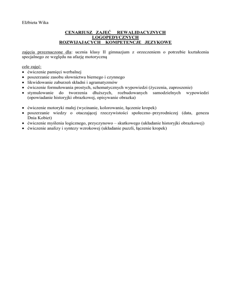Elżbieta Wika CENARIUSZ ZAJĘĆ REWALIDACYJNYCH LOGOPEDYCZNYCH ROZWIJAJĄCYCH KOMPETENCJE JĘZYKOWE zajęcia przeznaczone dla: ucznia klasy II gimnazjum z orzeczeniem o potrzebie kształcenia specjalnego ze względu na afazję motoryczną cele zajęć: ćwiczenie pamięci werbalnej poszerzanie zasobu słownictwa biernego i czynnego likwidowanie zaburzeń składni i agramatyzmów ćwiczenie formułowania prostych, schematycznych wypowiedzi (życzenia, zaproszenie) stymulowanie do tworzenia dłuższych, rozbudowanych samodzielnych wypowiedzi (opowiadanie historyjki obrazkowej, opisywanie obrazka) ćwiczenie motoryki małej (wycinanie, kolorowanie, łączenie kropek) poszerzanie wiedzy o otaczającej rzeczywistości społeczno–przyrodniczej (data, geneza Dnia Kobiet) ćwiczenie myślenia logicznego, przyczynowo – skutkowego (układanie historyjki obrazkowej) ćwiczenie analizy i syntezy wzrokowej (układanie puzzli, łączenie kropek) PRZEBIEG ZAJĘĆ: Z rozsypanych liter ułóż dwa wyrazy. D Z I E Ń uczeń otrzymuje pomieszane litery w razie trudności uczeń otrzymuje podpowiedź: Ń D K O B I E T uczeń otrzymuje pomieszane litery w razie trudności uczeń otrzymuje podpowiedź: K T Czy wiesz, kiedy obchodzimy Dzień Kobiet? Zaznacz właściwą datę. Przeczytaj tekst i odpowiedz na pytania pełnymi zdaniami. Dzień Kobiet to coroczne święto obchodzone 8 marca. Ustanowione zostało w 1910 roku na pamiątkę ofiar walki o równouprawnienie kobiet. Jak często obchodzony jest Dzień Kobiet? Kiedy ustanowiono to święto? Kogo ma upamiętniać Dzień Kobiet? Czy wiesz, co oznacza równouprawnienie kobiet i mężczyzn? Wyjaśnij ten termin i podaj przykłady. Z rozsypanych wyrazów ułóż powiedzenie. Kobieta zmienną jest. (uczeń otrzymuje pomieszane wyrazy) Wyjaśnij, jak rozumiesz to zdanie. Podaj przykłady. Ułóż i zapisz wewnątrz serca życzenia dla wybranej kobiety z okazji jej święta. Napisz: komu składasz życzenia z jakiej okazji składasz życzenia czego życzysz tej osobie podpisz się Możesz wykorzystać następujące zwroty: Szanowna … Kochana … Z okazji … Droga … W Dniu … Życzę Ci … Życzę Pani … Chciałbym Pani życzyć … Proszę przyjąć ode mnie życzenia … Pani… Chciałbym życzyć Tobie … Twój … (na oddzielnych kartkach uczeń zapisuje proste sformułowania, poprzez ułożenie kartek w odpowiedniej kolejności tworzy plan wypowiedzi, uzupełniając treść kartek o sformułowania łączące, tworzy ostateczny tekst pełnej wypowiedzi) Wytnij i pokoloruj obrazek. Opisz kobietę, którą widzisz na obrazku. W tym celu uzupełnij tekst odpowiednimi wyrazami. Na obrazku widać ………. kobietę. Stoi …………… . Jest osobą …………. wzrostu. Ma ……….. budowę ciała. Jej włosy są ………… . Mają ……….. kolor. Kobieta ubrana jest ……….. . Wygląda …………….. . Założyła ……… bluzkę. Bluzka ma duży ………….. . Na bluzkę kobieta założyła ……… . W żakiecie widać ………… . Pani jest ubrana w ………….. spódnicę. Spódnica jest …….. . Na nogach kobieta ma ………… . Są one ……………. . Ich kolor jest ………….. . Na stopach kobieta ma ………. . Są to pantofle z wysokimi ……….. . Na szyi pani zawiązała sobie ……… . Apaszka jest …….. . W lewej ręce kobieta trzyma ………… . Torebka jest …………….. . starą w średnim wieku młodą zgarbiona wyprostowana pochylona wysokiego niskiego średniego chudą szczupłą grubą otyłą puszystą długie krótkie półdługie króciutkie jasny ciemny niechlujnie schludnie elegancko nieelegancko białą niebieską zieloną żółtą kołnierz rękaw mankiet marynarkę żakiet kołnierz kieszeń długą krótką szeroka rozszerzająca się zwężająca się wąska rajstopy skarpety getry wzorzyste gładkie jasny ciemny kozaki pantofle sandały klapki koturnami obcasami podeszwami chustkę apaszkę szalik gruba cienka walizkę plecak torebkę kwadratowa podłużna prostokątna okrągła Ułóż historyjkę z obrazków. Opowiedz ją swoimi słowami. (uczeń otrzymuje obrazki pomieszane) Zredaguj zaproszenie dla mamy na szkolne przedstawienie z okazji Dnia Kobiet. Przygotowując tekst zaproszenia, uwzględnij następujące informacje: Kto zaprasza? Kogo zaprasza? Na co zaprasza? Gdzie się to odbędzie? Kiedy się to odbędzie? Prośba o potwierdzenie zaproszenia. Podpis osoby wypisującej zaproszenie. (na oddzielnych kartkach uczeń zapisuje proste sformułowania, poprzez ułożenie kartek w odpowiedniej kolejności tworzy plan wypowiedzi, uzupełniając treść kartek o sformułowania łączące, tworzy ostateczny tekst pełnej wypowiedzi) ………………………………………………………………………………………………………… ………………………………………………………………………………………………………… ………………………………………………………………………………………………………… ………………………………………………………………………………………………………… ………………………………………………………………………………………………………… ………………………………………………………………………………………………………… ………………………………………………………………………………………………………… Wytnij i ozdób (pokoloruj) zaproszenie. Dopasuj nazwy do obrazków: (uczeń przykłada pod obrazkami karteczki z odpowiednimi wyrazami) SUKNIA BIUSTONOSZ SPÓDNICA PIERŚCIONEK TOREBKA PERFUMY SZMINKA USTA WARKOCZ PANTOFLE KOLCZYKI ŻAKIET POŃCZOCHY RAJSTOPY LUSTERKO SUSZARKA SUKIENKA STANIK POMADKA WARGI SZPILKI MARYNARKA RAJTUZY LUSTRO Dokończ obrazek. W tym celu połącz kropki. Powiedz, co widzisz na ry