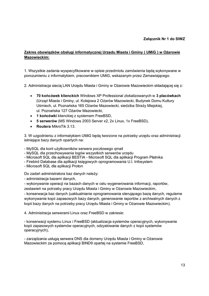 Załącznik Nr 1 do SIWZ Zakres obowiązków obsługi informatycznej Urzędu Miasta i Gminy ( UMiG ) w Ożarowie Mazowieckim: 1. Wszystkie zadania wyspecyfikowane w opisie przedmiotu zamówienia będą wykonywane w porozumieniu z informatykiem, pracownikiem UMiG, wskazanym przez Zamawiającego. 2. Administracja siecią LAN Urzędu Miasta i Gminy w Ożarowie Mazowieckim składającej się z: 70 końcówek klienckich Windows XP Professional zlokalizowanych w 3 placówkach (Urząd Miasta i Gminy, ul. Kolejowa 2 Ożarów Mazowiecki, Budynek Domu Kultury Uśmiech, ul. Poznańska 165 Ożarów Mazowiecki, siedziba Straży Miejskiej, ul. Poznańska 127 Ożarów Mazowiecki, 1 końcówki klienckiej z systemem FreeBSD, 5 serwerów (MS Windows 2003 Server x2, 2x Linux, 1x FreeBSD), Routera MikroTik 3.13. 3. W uzgodnieniu z informatykiem UMiG będą tworzone na potrzeby urzędu oraz administracji istniejące bazy danych opartych na: - MySQL dla kont użytkowników serwera pocztowego qmail - MySQL dla przechowywania logów wszystkich serwerów urzędu - Microsoft SQL dla aplikacji BESTIA - Microsoft SQL dla aplikacji Program Płatnika - Firebird Database dla aplikacji księgowych oprogramowania U.I. Infosystem - Microsoft SQL dla aplikacji Proton Do zadań administratora baz danych należy: - administracja bazami danych, - wykonywanie operacji na bazach danych w celu wygenerowania informacji, raportów, zestawień na potrzeby pracy Urzędu Miasta i Gminy w Ożarowie Mazowieckim, - konserwacja baz danych (uaktualnianie oprogramowania sterującego bazą danych, regularne wykonywanie kopii zapasowych bazy danych, generowanie raportów z archiwalnych danych z kopii bazy danych na potrzeby pracy Urzędu Miasta i Gminy w Ożarowie Mazowieckim). 4. Administracja serwerami Linux oraz FreeBSD w zakresie: - konserwacji systemu Linux i FreeBSD (aktualizacja systemów operacyjnych, wykonywanie kopii zapasowych systemów operacyjnych, odzyskiwanie danych z kopii systemów operacyjnych), - zarządzania usługą serwera DNS dla domeny Urzędu Miasta i Gminy w Ożarowie Mazowieckim za pomocą aplikacji BIND9 opartej na systemie FreeBSD, 13 - administracji podstawowym kontrolerem domeny opartym na aplikacji SAMBA 3.0, na systemie FreeBSD wraz z usługami: Active Directory, profilami mobilnymi, usługami drukowania sieciowego wraz z kontrolą dostępu do drukarek na poziomie administratora domeny, - zarządzenia kontami użytkowników domeny poprzez panel www, - udostępniania zasobów dyskowych z podziałem na dyski poszczególnych wydziałów, użytkowników i grup wraz z kontrolą dostępu do dysków na poziomie administratora domeny, - konfiguracji oraz administracji serwera poczty elektronicznej opartej na oprogramowanie qmail na systemie FreeBSD wraz z usługami authSMTP, SpamAssassin, Autoresponder, IMAP oraz POP3, - zarządzania serwerem poczty w zakresie administracji kontami, grupami oraz listami wysyłkowymi, zabezpieczanie logów poczty, - konfiguracji oraz administracji serwerem www opartym na oprogramowaniu Apache na systemie FreeBSD, zarządzanie serwerem, administracja domenami wirtualnymi, logowanie odwiedzin witryn internetowych urzędu, - administrowania system dostępu do sieci za pomocą VPN dla poszczególnych użytkowników sieci, - administrowania systemem kopii zapasowych systemu informatycznego Urzędu Miasta i Gminy w Ożarowie Mazowieckim za pomocą napędów taśmowych, macierzy dyskowej oraz płyt DVD zarządzanych z poziomu systemu FreeBSD, - administrowania systemem RADIUS opartym na aplikacji FreeRadius wraz z replikacją baz danych pomiędzy dwoma serwerami. 5. Wykonywanie grafiki za pomocą środowiska graficznego Adobe Photoshop wraz z przygotowaniem do druku DTP - wykonywanie multimedialnych prezentacji na potrzeby pracy Urzędu Miasta i Gminy w Ożarowie Mazowieckim (PowerPoint, Flash). 6. Administrowanie serwerem opartym na systemie RouterOS firmy Mikrotik w zakresie: - konfigurowania oraz administrowanie routerem dostępowym, - konfigurowania firewall’a, - konfigurowania NAT wraz z przekierowaniem portów dla poszczególnych aplikacji, - administrowania systemem kolejkowania opartym na SimpleQues oraz QuesTree, - administrowania serwerem DHCP, - administrowania serwerem VPN dla zdalnego dostępu do sieci LAN, - administrowania systemem logowania wraz z powiadamianiem administratora o niebezpiecznych zdarzeniach, wysyłanie kopii logów na maila, 14 - powiadamiania Urzędu Miasta i Gminy o: braku zasilania, próbach włamań do sieci, - administrowania systemem hotspot, - administracji systemem dostępu opartym na aplikacji UserManager systemu Routerom, - wdrażania oraz konfiguracja aplikacji Dude dla systemu RouterOS, - konfigurowania urządzeń opartych na systemie RouterOS dla stacji klienckich hotspot. 7.Obsługa oprogramowania branżowego dla pracy Urzędu Miasta i Gminy w Ożarowie Mazowieckim w skład którego wchodzą: - MULTICASH: aplikacja wykonująca przelewy bankowe; wsparcie dla pracowników Urzędu Miejskiego w zakresie obsługi aplikacji, przygotowywania przelewów, wykonywanie kopii zapasowych danych programu (baza danych Microsoft SQL), - BESTIA: aplikacja przygotowująca oraz wysyłająca drogą elektroniczną sprawozdania finansowe dla Regionalnej Izby Obrachunkowej; wsparcie dla użytkowników w zakresie przygotowywania sprawozdań finansowych, wysyłania sprawozdań, uaktualniania certyfikatów, - PROGRAM PŁATNIKA: aplikacja do przygotowywania oraz wysyłania drogą elektroniczną deklaracji ZUS; wsparcie w zakresie przygotowywania deklaracji, wysyłki deklaracji, aktualizacji aplikacji oraz certyfikatów, - APLIKACJE U.I.INFOSYSTEM: aplikacje wspomagające pracę wydziału finansowego Urzędu. Zbiór aplikacji „PODATKI”, „BUDŻET” oraz wersji DOS tych aplikacji; obsługa tych aplikacji, wprowadzanie danych, analiza danych, przygotowywanie sprawozdań, administracja bazą danych wraz z wykonywaniem jej kopii zapasowych (baza danych Firebird na syst