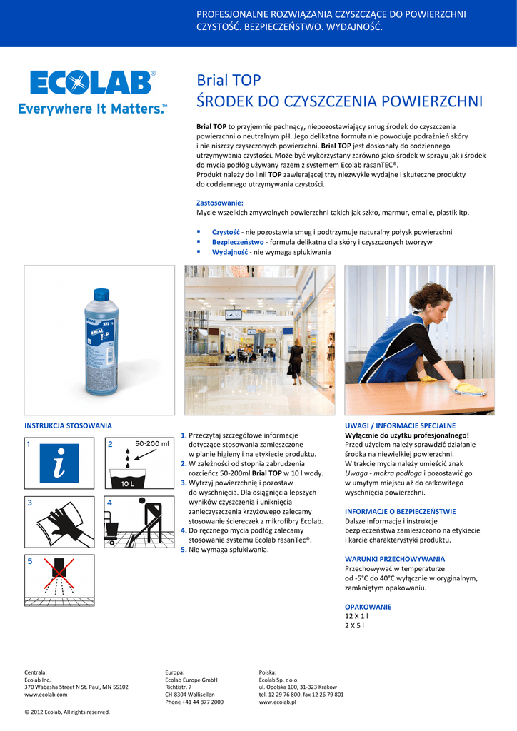 PROFESJONALNE ROZWIĄZANIA CZYSZCZĄCE DO POWIERZCHNI CZYSTOŚĆ. BEZPIECZEŃSTWO. WYDAJNOŚĆ. Brial TOP ŚRODEK DO CZYSZCZENIA POWIERZCHNI Brial TOP to przyjemnie pachnący, niepozostawiający smug środek do czyszczenia powierzchni o neutralnym pH. Jego delikatna formuła nie powoduje podrażnień skóry i nie niszczy czyszczonych powierzchni. Brial TOP jest doskonały do codziennego utrzymywania czystości. Może być wykorzystany zarówno jako środek w sprayu jak i środek do mycia podłóg używany razem z systemem Ecolab rasanTEC®. Produkt należy do linii TOP zawierającej trzy niezwykle wydajne i skuteczne produkty do codziennego utrzymywania czystości. Zastosowanie: Mycie wszelkich zmywalnych powierzchni takich jak szkło, marmur, emalie, plastik itp. Czystość - nie pozostawia smug i podtrzymuje naturalny połysk powierzchni Bezpieczeństwo - formuła delikatna dla skóry i czyszczonych tworzyw Wydajność - nie wymaga spłukiwania INSTRUKCJA STOSOWANIA 1. Przeczytaj szczegółowe informacje dotyczące stosowania zamieszczone w planie higieny i na etykiecie produktu. 2. W zależności od stopnia zabrudzenia rozcieńcz 50-200ml Brial TOP w 10 l wody. 3. Wytrzyj powierzchnię i pozostaw do wyschnięcia. Dla osiągnięcia lepszych wyników czyszczenia i uniknięcia zanieczyszczenia krzyżowego zalecamy stosowanie ściereczek z mikrofibry Ecolab. 4. Do ręcznego mycia podłóg zalecamy stosowanie systemu Ecolab rasanTec®. 5. Nie wymaga spłukiwania. UWAGI / INFORMACJE SPECJALNE Wyłącznie do użytku profesjonalnego! Przed użyciem należy sprawdzić działanie środka na niewielkiej powierzchni. W trakcie mycia należy umieścić znak Uwaga - mokra podłoga i pozostawić go w umytym miejscu aż do całkowitego wyschnięcia powierzchni. INFORMACJE O BEZPIECZEŃSTWIE Dalsze informacje i instrukcje bezpieczeństwa zamieszczono na etykiecie i karcie charakterystyki produktu. WARUNKI PRZECHOWYWANIA Przechowywać w temperaturze od -5°C do 40°C wyłącznie w oryginalnym, zamkniętym opakowaniu. OPAKOWANIE 12 X 1 l 2X5l Centrala: Ecolab Inc. 370 Wabasha Street N St. Paul, MN 55102 www.ecolab.com © 2012 Ecolab, All rights reserved. Europa: Ecolab Europe GmbH Richtistr. 7 CH-8304 Wallisellen Phone +41 44 877 2000 Polska: Ecolab Sp. z o.o. ul. Opolska 100, 31-323 Kraków tel. 12 29 76 800, fax 12 26 79 801 www.ecolab.pl