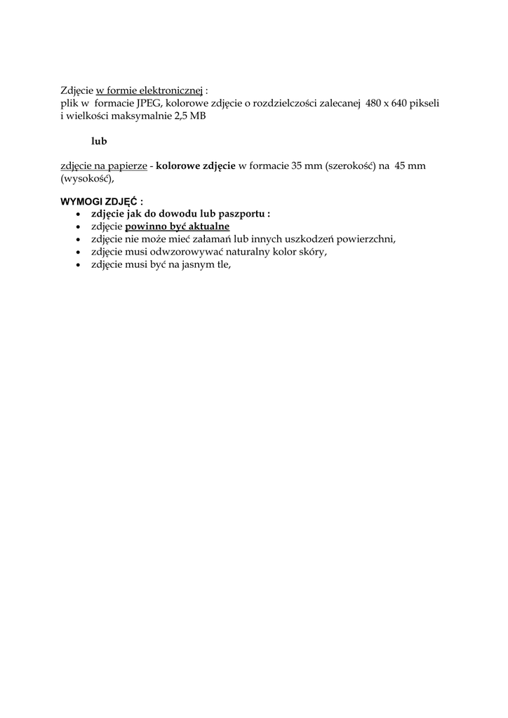 Zdjęcie w formie elektronicznej : plik w formacie JPEG, kolorowe zdjęcie o rozdzielczości zalecanej 480 x 640 pikseli i wielkości maksymalnie 2,5 MB lub zdjęcie na papierze - kolorowe zdjęcie w formacie 35 mm (szerokość) na 45 mm (wysokość), WYMOGI ZDJĘĆ : zdjęcie jak do dowodu lub paszportu : zdjęcie powinno być aktualne zdjęcie nie może mieć załamań lub innych uszkodzeń powierzchni, zdjęcie musi odwzorowywać naturalny kolor skóry, zdjęcie musi być na jasnym tle,