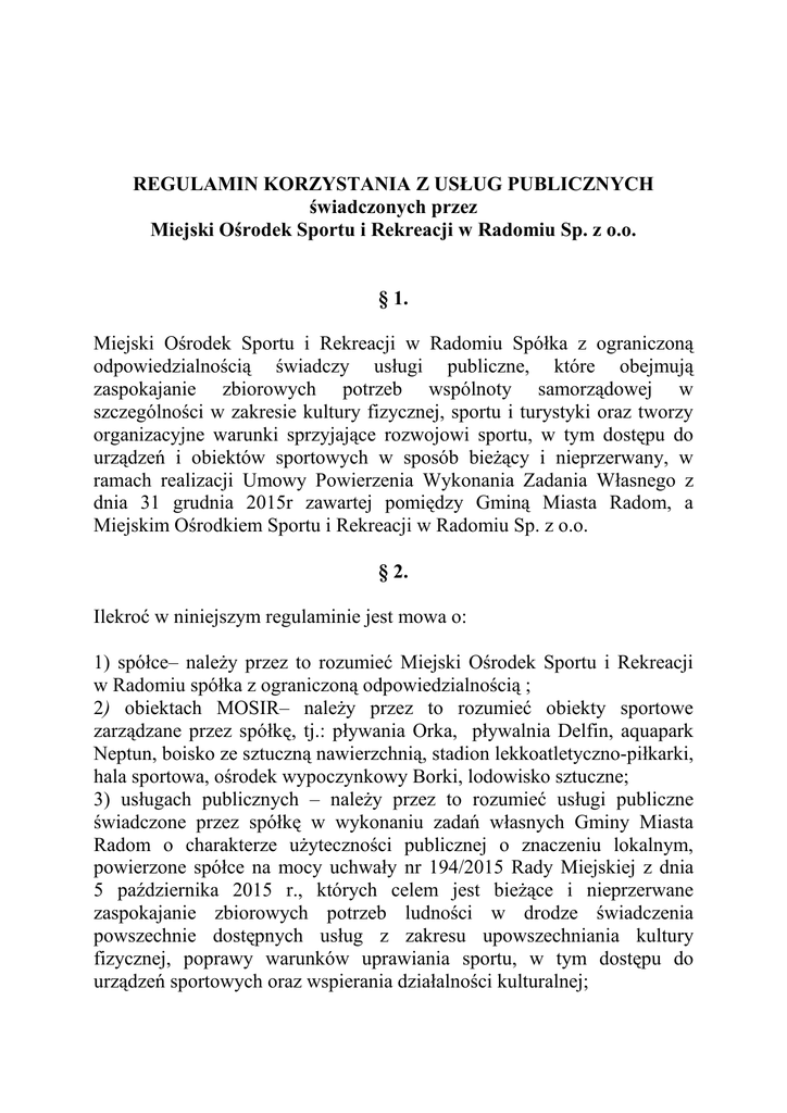 REGULAMIN KORZYSTANIA Z USŁUG PUBLICZNYCH świadczonych przez Miejski Ośrodek Sportu i Rekreacji w Radomiu Sp. z o.o. § 1. Miejski Ośrodek Sportu i Rekreacji w Radomiu Spółka z ograniczoną odpowiedzialnością świadczy usługi publiczne, które obejmują zaspokajanie zbiorowych potrzeb wspólnoty samorządowej w szczególności w zakresie kultury fizycznej, sportu i turystyki oraz tworzy organizacyjne warunki sprzyjające rozwojowi sportu, w tym dostępu do urządzeń i obiektów sportowych w sposób bieŜący i nieprzerwany, w ramach realizacji Umowy Powierzenia Wykonania Zadania Własnego z dnia 31 grudnia 2015r zawartej pomiędzy Gminą Miasta Radom, a Miejskim Ośrodkiem Sportu i Rekreacji w Radomiu Sp. z o.o. § 2. Ilekroć w niniejszym regulaminie jest mowa o: 1) spółce– naleŜy przez to rozumieć Miejski Ośrodek Sportu i Rekreacji w Radomiu spółka z ograniczoną odpowiedzialnością ; 2) obiektach MOSIR– naleŜy przez to rozumieć obiekty sportowe zarządzane przez spółkę, tj.: pływania Orka, pływalnia Delfin, aquapark Neptun, boisko ze sztuczną nawierzchnią, stadion lekkoatletyczno-piłkarki, hala sportowa, ośrodek wypoczynkowy Borki, lodowisko sztuczne; 3) usługach publicznych – naleŜy przez to rozumieć usługi publiczne świadczone przez spółkę w wykonaniu zadań własnych Gminy Miasta Radom o charakterze uŜyteczności publicznej o znaczeniu lokalnym, powierzone spółce na mocy uchwały nr 194/2015 Rady Miejskiej z dnia 5 października 2015 r., których celem jest bieŜące i nieprzerwane zaspokajanie zbiorowych potrzeb ludności w drodze świadczenia powszechnie dostępnych usług z zakresu upowszechniania kultury fizycznej, poprawy warunków uprawiania sportu, w tym dostępu do urządzeń sportowych oraz wspierania działalności kulturalnej; 4) podmiotach korzystających – naleŜy przez to rozumieć podmioty korzystające z usług publicznych wyróŜnione według następujących kategorii: a) Gr.1 - jednostki organizacyjne Gminy Miasta Radomia prowadzące szkolenia sportowe (np. wf, klasy sportowe, innowacyjne itp.) - organizacje pozarządowe oraz podmioty wymienione w art. 3 ust. 3 ustawy z dnia 24 kwietnia 2003 r. o działalności poŜytku publicznego i wolontariacie (Dz.U. z 2014 r., poz. 1118 ze zm.), prowadzące działalność statutową w zakresie upowszechniania kultury fizycznej, którym Miasto Radom powierzyło wykonywanie zadań publicznych w trybie tej ustawy, nie pobierające odpłatności od beneficjentów w związku z realizacją zadań na udostępnionych obiektach; b) Gr.2 - organizacje pozarządowe oraz podmioty wymienione w art. 3 ust. 3 ustawy, o której mowa w lit. a) prowadzące działalność statutową w zakresie upowszechniania kultury fizycznej, którym Miasto Radom wsparło wykonywanie zadań publicznych w trybie tej ustawy oraz Uchwały Rady Miejskiej Nr 216/2011 z dnia 28 października 2011r w sprawie określenia warunków i trybu finansowania rozwoju sportu przez Gminę Miasta Radomia ze zmianami; c) Gr.3 - pozostałe organizacje pozarządowe oraz podmioty wymienione w art. 3 ust. 3 ustawy, które nie znajdują się w lit. a) i w lit. b), w tym kluby sportowe nieprowadzące działalności gospodarczej, a w przypadku prowadzenia działalności gospodarczej, gdy korzystanie z usług publicznych nie pozostaje w związku z prowadzoną działalnością gospodarczą; d) Gr.4 - osoby indywidualne lub inne podmioty będące beneficjentami usług o charakterze usług publicznych w zakresie upowszechniania kultury fizycznej i sportu, w tym dostępu do urządzeń sportowych. § 3. 1. Spółka udostępnia obiekty sportowe MOSiR, o których mowa w § 2, pkt.2 niniejszego regulaminu w ramach realizacji powierzonych jej usług publicznych, za odpłatnością uzaleŜnioną od zakwalifikowania do kategorii podmiotów korzystających określonych w § 2 pkt 4 - w wysokościach określonych w cennikach stanowiących załączniki do niniejszego regulaminu, z zastrzeŜeniem ust. 2 - 4. 2. W przypadku niewskazanego w cenniku rodzaju korzystania z obiektu odpłatność ustalana będzie indywidualnie przez spółkę w zaleŜności od zakresu korzystania oraz znaczenia przedsięwzięcia, a w szczególności popularności wśród mieszkańców Radomia. W terminie do dnia 31 marca kaŜdego roku spółka przekaŜe Prezydentowi Miasta Radomia wykaz podmiotów korzystających, wobec których ceny zostały ustalone indywidualnie wraz ze wskazaniem zastosowanej odpłatności. 3. W szczególnie uzasadnionych przypadkach Prezydent Miasta Radomia moŜe wskazać podmiot korzystający, realizujący zadania z zakresu usług publicznych, ustalając cenę za korzystanie z obiektu określoną w cennikach , o których mowa w ust. 1 lub udzielić stosownej bonifikaty. 4. Udostępnianie obiektów MOSiR wymienionych w § 2, pkt.2, w ramach korzystania z usług publicznych w zakresie organizacji przedsięwzięć sportowych, kulturalnych lub artystycznych, moŜe odbywać się takŜe na zasadzie współorganizacji ze spółką. W takim przypadku przepisu ust. 1 nie stosuje się. § 4. 1. Korzystanie z usług publicznych odbywa się po uprzednim złoŜeniu do spółki wniosku, z zastrzeŜeniem ust. 2. 2. W przypadku podmiotów, o których mowa w § 3 ust. 3, wniosek kierowany jest do Prezydenta Miasta Radom. 3. Wniosek, o którym mowa w ust. 1 i 2 zawiera w szczególności: 1)dane wnioskodawcy; 2)oświadczenie o zakwalifikowaniu do kategorii podmiotów korzystających wraz z uzasadnieniem, terminem i opisem realizowanych zadań; 3)szczegółowy zakres rzeczowy realizowanej usługi publicznej; 4)termin i okres korzystania z obiektu. § 5. 1. Szczegółowe terminy oraz warunki korzystania z usług publicznych określane są w umowie zawartej pomiędzy spółką a podmiotem korzystającym. Nie dotyczy to podmiotów korzystających z usług publicznych w sposób incydentalny i w ograniczonym przedmiotowo zakresie. 2. Umowa, o której mowa w ust. 1, wymaga formy p