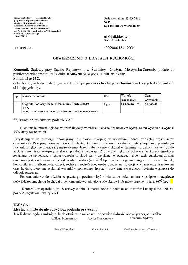 Komornik Sądowy (dawniej Rew.III) przy Sądzie Rejonowym w Świdnicy Grażyna Moszyńska-Zaremba Kancelaria Komornicza w Świdnicy 58-100 Świdnica, ul. Komunardów 4/1 tel. (74)8536-126 e-mail: [email protected] www.komornikswidnica.pl Km 3754/15 Świdnica, dnia 23-03-2016 Sz P Sąd Rejonowy w Świdnicy << ODPIS >> *0020001541209* ul. Okulickiego 2-4 58-100 Świdnica OBWIESZCZENIE O LICYTACJI RUCHOMOŚCI Komornik Sądowy przy Sądzie Rejonowym w Świdnicy Grażyna Moszyńska-Zaremba podaje do publicznej wiadomości, że w dniu 07-06-2016r. o godz. 11:00 w lokalu: Śmiałowice 25C, odbędzie się w trybie ustalonym w art. 867 kpc pierwsza licytacja ruchomości należących do dłużnika i składających się z: Lp. Nazwa ruchomości Ilość 1 Ciągnik Siodłowy Renault Premium Route 420.19 T 4X 1 [szt.] Wartość szacunkowa 88 000,00 **) Cena wywołania 66 000,00 .nr rej. DSW14039, VIN VF622GVA000139812, rok produkcji 2004 r. **) kwota brutto zawiera podatek VAT Ruchomości można oglądać w dzień licytacji w miejscu i czasie oznaczonym wyżej. Suma wywołania wynosi 75% sumy oszacowania. Przystępujący do przetargu obowiązany jest złożyć rękojmię w wysokości jednej dziesiątej części sumy oszacowania. Rękojmię złożoną przez licytanta, któremu udzielono przybicia, zatrzymuje się; pozostałym licytantom rękojmię zwraca się niezwłocznie. Jeżeli nabywca nie wykonał w terminie warunków licytacji co do zapłaty ceny, traci rękojmię, a skutki przybicia wygasają. Z utraconej rękojmi pokrywa się koszty egzekucji związanej ze sprzedażą, a reszta wchodzi w skład sumy uzyskanej w egzekucji albo jeżeli egzekucja została umorzona jest przelewana na dochód Skarbu Państwa (art. 8671 kpc). W przetargu nie mogą uczestniczyć: dłużnik, komornik, ich małżonkowie, dzieci, rodzice i rodzeństwo, osoby obecne na licytacji w charakterze urzędowym oraz licytant, który nie wykonał warunków poprzedniej licytacji. Stawienie się jednego licytanta wystarcza do odbycia przetargu. Pełnomocnictwo do udziału w przetargu powinno być stwierdzone dokumentem z podpisem urzędowo poświadczonym, chyba że chodzi o pełnomocnictwo udzielone adwokatowi lub radcy prawnemu (art. 8672 kpc) Komornik w oparciu o art.18 ustawy z dnia 11 marca 2004r o podatku od towarów i usług (Dz.U. Nr 54, poz.535) wystawia faktury VAT. UWAGA: Licytacja może się nie odbyć bez podania przyczyny. Jeżeli drzwi będą zamknięte, będą otwierane na koszt i odpowiedzialność obowiązanegodłużnika. Aplikant Komorniczy Asesor Komorniczy Komornik Sądowy Paweł Warachim Paweł Bieniek Grażyna Moszyńska-Zaremba 1