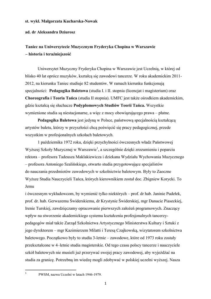 st. wykł. Małgorzata Kucharska-Nowak ad. dr Aleksandra Dziurosz Taniec na Uniwersytecie Muzycznym Fryderyka Chopina w Warszawie – historia i teraźniejszość Uniwersytet Muzyczny Fryderyka Chopina w Warszawie jest Uczelnią, w której od blisko 40 lat oprócz muzyków, kształcą się zawodowi tancerze. W roku akademickim 20112012, na kierunku Taniec studiuje 82 studentów. W ramach kierunku funkcjonują specjalności: Pedagogika Baletowa (studia I. i II. stopnia (licencjat i magisterium) oraz Choreografia i Teoria Tańca (studia II stopnia). UMFC jest także ośrodkiem akademickim, gdzie kształcą się słuchacze Podyplomowych Studiów Teorii Tańca. Wszystkie wymienione studia są niestacjonarne, a więc z mocy obowiązującego prawa – płatne. Pedagogika Baletowa jest jedyną w Polsce, państwową specjalnością kształcącą artystów baletu, którzy w przyszłości chcą poświęcić się pracy pedagogicznej, przede wszystkim w profesjonalnych szkołach baletowych. 1 października 1972 roku, dzięki przychylności ówczesnych władz Państwowej Wyższej Szkoły Muzycznej w Warszawie1, a szczególnie dzięki zrozumieniu i poparciu rektora – profesora Tadeusza Maklakiewicza i dziekana Wydziału Wychowania Muzycznego – profesora Antoniego Szalińskiego, otwarto studia przygotowujące specjalistów do nauczania przedmiotów zawodowych w szkolnictwie baletowym. Były to Zaoczne Wyższe Studia Nauczycieli Tańca, których kierownikiem został doc. Zbigniew Korycki. To Jemu i ówczesnym wykładowcom, by wymienić tylko niektórych – prof. dr hab. Janinie Pudełek, prof. dr. hab. Gerwazemu Świderskiemu, dr Krystynie Świderskiej, mgr Danucie Piaseckiej, Irenie Turskiej, zawdzięczamy opracowanie pierwszych założeń programowych. Znaczący wpływ na stworzenie akademickiego systemu kształcenia profesjonalnych tancerzypedagogów miał także Zarząd Szkolnictwa Artystycznego Ministerstwa Kultury i Sztuki z jego dyrektorem – mgr Kazimierzem Milatti i Teresą Czajkowską, wizytatorem szkolnictwa baletowego. Początkowo były to studia 3-letnie – zawodowe, które od 1973 roku zostały przekształcone w 4–letnie studia magisterskie. Od tego czasu polscy tancerze i nauczyciele szkół baletowych nie musieli już przerywać swojej pracy zawodowej, aby wyjeżdżać na studia za granicę. Potrzebną im wiedzę mogli zdobywać w polskiej uczelni wyższej. Nasza 1 PWSM, nazwa Uczelni w latach 1946-1979. 1 Uczelnia stała się ich Alma Mater. Było to doniosłe wydarzenie nie tylko dla tancerzy i całego środowiska baletowego, ale także dla całej narodowej kultury, której częścią jest sztuka tańca i baletu. Studia nasze, dziś – Pedagogikę Baletową – ukończyło do tej pory ponad 350 studentów. Od samego początku, kształcenie metodyków – specjalistów nauczania tańca w różnych formach, stylach i technikach – wzbogacane było zawsze o wiedzę z historii, teorii i kompozycji tańca, psychologii i pedagogiki, a także o wiedzę z zakresu anatomii i gimnastyki korekcyjnej, filozofii, historii sztuki i wiedzy o muzyce. Dzięki temu większość obecnie pracujących w szkołach baletowych nauczycieli zdobyło akademicką wiedzę potrzebną im do wykonywania zawodu nauczyciela i może poszczycić się dyplomem magistra sztuki, uzyskanym w Państwowej Wyższej Szkole Muzycznej, później Akademii Muzycznej im. Fryderyka Chopina2 i obecnie – w Uniwersytecie Muzycznym Fryderyka Chopina w Warszawie (UMFC)3. Uczą tańca klasycznego, ludowego, historycznego, charakterystycznego i współczesnego. Wykładają również wiedzę o tańcu. Niemal wszyscy, czynni zawodowo tancerze polscy są ich uczniami. Absolwenci UMFC nie tylko podejmują pracę w ogólnokształcących szkołach baletowych. Z różnych względów trafiają także do teatrów muzycznych i operowych – polskich i zagranicznych. Pracują również w teatrach tańca, zespołach tańca ludowego, współczesnego, estradowego, etc. Wielu poświęciło się pracy instruktorów w licznie powstających prywatnych szkołach tańca i w domach kultury. Niektórzy są choreografami, jeszcze inni czynnymi tancerzami, kierownikami i repetytorami baletu. Kilkoro pracuje w charakterze wykładowców na Uniwersytecie Muzycznym Fryderyka Chopina w Warszawie i w innych szkołach wyższych – w tym: teatralnych, muzycznych i wychowania fizycznego. Niektórzy podjęli dodatkowo naukę na innych kierunkach studiów magisterskich. Są wśród nich i tacy, którzy kontynuują naukę w ramachróżnego typu studiówpodyplomowych i doktoranckich, w tym na Podyplomowych Studiach Teorii Tańca, chcąc w przyszłości poświęcić się pracy naukowej. Dzisiejsza Pedagogika Baletowa znacząco różni się od tej sprzed trzydziestu pięciu, dwudziestu, a nawet dziesięciu lat. Stale poszerzamy zakres i podnosimy poziom kształcenia, dostosowując plany studiów do zmieniającej się rzeczywistości. Chcemy, aby nasi absolwenci opuszczali Uczelnię jeszcze lepiej przygotowani do roli nauczyciela tańca i baletu w XXI 2 3 AMFC, nazwa Uczelni w latach 1979-2008. UMFC, obecna nazwa Uczelni, od 2008 roku. 2 wieku. Szczególnie istotne zmiany w planach i programach nauczania zaszły w 2004 roku, kiedy to w ówczesnej Akademii Muzycznej im. Fryderyka Chopina powstał kierunek Taniec. Dla nowych, pięcioletnich, jednolitych studiów magisterskich stworzona została nowa „siatka godzin”, w której znalazło się wiele dodatkowych przedmiotów. Wzrosła także ogólna liczba godzin zajęć dydaktycznych. Dziś są to już studia „wygasające” – studiują na nich tylko studenci V. roku. I., II. i III. rok, a także I. rok studiów magisterskich, na skutek podpisania przez Polskę Deklaracji Bolońskiej, od 2007 roku pracuje już w systemie nauczania porównywalnym z tym, który funkcjonuje na wyższych uczelniach krajów Unii Europejskiej. Dla studiów licencjackich i magisterskich, zarówno pierwszego, jak i drugiego stopnia, przez