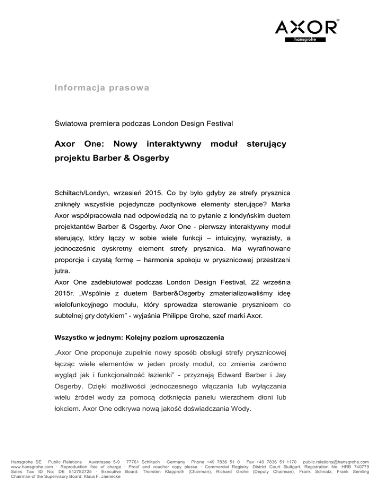 Informacja prasowa Światowa premiera podczas London Design Festival Axor One: Nowy interaktywny moduł sterujący projektu Barber & Osgerby Schiltach/Londyn, wrzesień 2015. Co by było gdyby ze strefy prysznica zniknęły wszystkie pojedyncze podtynkowe elementy sterujące? Marka Axor współpracowała nad odpowiedzią na to pytanie z londyńskim duetem projektantów Barber & Osgerby. Axor One - pierwszy interaktywny moduł sterujący, który łączy w sobie wiele funkcji – intuicyjny, wyrazisty, a jednocześnie dyskretny element strefy prysznica. Ma wyrafinowane proporcje i czystą formę – harmonia spokoju w prysznicowej przestrzeni jutra. Axor One zadebiutował podczas London Design Festival, 22 września 2015r. „Wspólnie z duetem Barber&Osgerby zmaterializowaliśmy ideę wielofunkcyjnego modułu, który sprowadza sterowanie prysznicem do subtelnej gry dotykiem” - wyjaśnia Philippe Grohe, szef marki Axor. Wszystko w jednym: Kolejny poziom uproszczenia „Axor One proponuje zupełnie nowy sposób obsługi strefy prysznicowej łącząc wiele elementów w jeden prosty moduł, co zmienia zarówno wygląd jak i funkcjonalność łazienki” - przyznają Edward Barber i Jay Osgerby. Dzięki możliwości jednoczesnego włączania lub wyłączania wielu źródeł wody za pomocą dotknięcia panelu wierzchem dłoni lub łokciem. Axor One odkrywa nową jakość doświadczania Wody. Hansgrohe SE · Public Relations · Auestrasse 5-9 · 77761 Schiltach · Germany · Phone +49 7836 51 0 · Fax +49 7836 51 1170 · [email protected] www.hansgrohe.com · Reproduction free of charge · Proof and voucher copy please · Commercial Registry: District Court Stuttgart, Registration No: HRB 740779 Sales Tax ID No: DE 812782725 · Executive Board: Thorsten Klapproth (Chairman), Richard Grohe (Deputy Chairman), Frank Schnatz, Frank Semling Chairman of the Supervisory Board: Klaus F. Jaenecke Temperatura jest ustawiana za pomocą centralnego pokrętła, mała dźwignia poniżej reguluje moc przepływu wody, a tryb EcoMode oszczędza zużycie wody nawet do 50%. Przepływ wody jest aktywowany i dezaktywowany poprzez naciśnięcie przycisków: czytelne symbole umożliwiają łatwy wybór właściwego odbiornika (głowicy prysznicowej, główki czy dysz bocznych). Wzornictwo bez patosu Swoją zwartą i jednocześnie delikatną formą, Axor One nie ingeruje w przestrzeń. Strefa prysznica zyskuje na przestronności. Gładkie powierzchnie, zaokrąglone krawędzie oraz zintegrowany, mechaniczny interfejs tworzą spójny moduł, który wtapia się w przestrzeń każdej łazienki. Istnieje możliwość różnych wykończeń kolorystycznych; od stonowanego chromu po wyraziste połączenie złota i czerwieni. Axor One może być na tyle widoczny, na ile życzy sobie tego klient. *** Axor to marka firmy Hansgrohe, która z sukcesem realizuje program „Designer Vision for Your Bathroom”. We współpracy z Axorem, czołowi architekci oraz projektanci wnętrz rozwijają swoją wizję łazienki. Kolekcje marki Axor oferują ogromną liczbę unikatowych rozwiązań dla łazienki na najwyższym poziomie estetycznym i technologicznym. Partnerami marki Axor są Barber & Osgerby, Ronan i Erwan Bouroullec, Antonio Citterio, Jean-Marie Massaud, Philippe Starck, Patrycia Urquiola oraz studia projektowe Front, Nendo i Phoenix Design. Wszyscy oni przyczynili się do tego by uczynić życie wewnątrz oraz wokół łazienki piękniejszym. Szefem marki Axor jest Philippe Grohe, wnuk założyciela firmy Hansa Grohe. Więcej nt marki Axor: www.facebook.com/axor.design www.twitter.com/hansgrohe_pr Hansgrohe SE · Public Relations · Auestrasse 5-9 · 77761 Schiltach · Germany · Phone +49 7836 51 0 · Fax +49 7836 51 1170 · [email protected] www.hansgrohe.com · Reproduction free of charge · Proof and voucher copy please · Commercial Registry: District Court Stuttgart, Registration No: HRB 740779 Sales Tax ID No: DE 812782725 · Executive Board: Thorsten Klapproth (Chairman), Richard Grohe (Deputy Chairman), Frank Schnatz, Frank Semling Chairman of the Supervisory Board: Klaus F. Jaenecke Kontakt: Hansgrohe Polska - Public Relations – Barbara Pol Telefon: +48 601 890 288 E-Mail: [email protected] www.hansgrohe.pl Hansgrohe SE · Public Relations · Auestrasse 5-9 · 77761 Schiltach · Germany · Phone +49 7836 51 0 · Fax +49 7836 51 1170 · [email protected] www.hansgrohe.com · Reproduction free of charge · Proof and voucher copy please · Commercial Registry: District Court Stuttgart, Registration No: HRB 740779 Sales Tax ID No: DE 812782725 · Executive Board: Thorsten Klapproth (Chairman), Richard Grohe (Deputy Chairman), Frank Schnatz, Frank Semling Chairman of the Supervisory Board: Klaus F. Jaenecke Przegląd zdjęć Axor One by Barber & Osgerby Axor One_Thermostat_Chrome Copyright: Uli Meier for Axor / Hansgrohe SE Axor One_Thermostat_Brushed Brass Copyright: Uli Meier for Axor / Hansgrohe SE Axor One łączy kontrolę nad strumieniem wody, jej przepływem i temperaturą w jednym module. Z możliwością różnorodnych wykończeń, od stonowanego chromu do wyrazistego połączenia złota i czerwieni; Axor One może być na tyle widoczny, na ile życzy sobie tego klient. . Axor One_Thermostat_One Outlet Axor One_Thermostat_Two Outlets Copyright: Uli Meier for Axor / Hansgrohe SE Copyright: Uli Meier for Axor / Hansgrohe SE Temperatura jest ustawiana za pomocą centralnego pokrętła, mała dźwignia bezpośrednio pod nim reguluje przepływ wody, tryb EcoMode oszczędza zużycie wody nawet do 50%. Przepływ wody jest aktywowany i dezaktywowany poprzez naciśnięcie przycisków: czytelne symbole umożliwiają łatwy wybór właściwego odbiornika wody (głowicy prysznicowej, główki czy dysz bocznych). Hansgrohe SE · Public Relations · Auestrasse 5-9 · 77761 Schiltach · Germany · Phone +49 7836 51 0 · Fax +49 7836 51 1170 · [email protected] www.hansgrohe.com · Reproduction free of charge · Proof and vou