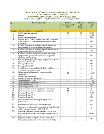 EFEKTYWNOŚĆ SZKOLEŃ REALIZOWANYCH PRZEZ POWIATOWE URZĘDY PRACY WOJEWÓDZTWA PODLASKIEGO W ROKU 2013 (zestawienie sporządzono na podstawie danych opracowanych przez PUP) Lp. Nazwa szkolenia Powiatowy Urząd Pracy w Augustowie 1. ABC Przedsiębiorczości 2. Brukarz 3. Drwal - operator pilarki 4. Badanie mięsa i świń i dzików metodą wytrawiania próby zbiorczej z zastosowaniem magnetycznego mieszania 5. Kierowca wózków jezdniowych podnośnikowych specjalizowanych (ładowarka teleskopowa) 6. Kierowca wózków jezdniowych podnośnikowych z wyłączeniem specjalizowanych 7. Kierowca wózków widłowych podnośnikowych z wyłączeniem specjalizowanych oraz bezpieczną wymianą butli gazowej 8. Kurs fryzjerski przygotowujący do pracy w zawodzie fryzjera LONG STAŻ 9. Prawo jazdy kat. C 10. Prawo jazdy kat. D 11. Kwalifikacja wstępna dla kandydatów na kierowców w zakresie transportu rzeczy 12. Monter ociepleń budynków z montowaniem rusztowań 13. Obsługa kas fiskalnych 14. Obsługa podestów ruchomych 15. Operator koparki kl. III 16. Operator koparko-ładowarki kl. III 17. Operator ładowarki kl. III 18. Operator spycharek kl. III 19. Opiekun osób starszych z językiem niemieckim 20. Opiekun osób starszych z językiem angielskim 21. Prawo jazdy kat. C 22. Prawo jazdy kat. C+E 23. Prawo jazdy kat. D 24. Przewóz materiałów niebezpiecznych –kurs podstawowy 25. Rzeczoznawca pojazdów samochodowych 26. 27. 28. Seminarium z eksploatacji urządzeń, instalacji i sieci elektro energetycznych – SEP do 1 kV Spawanie elektrodą nietopliwą blach i rur ze stali nierdzewnych spoinami pachwinowymi metodą TIG (141) Spawanie elektrodą topliwą blach i rur ze stali ferrytycznych spoinami pachwionowymi metodą Liczba przeszkolonych osób Efektywno ść (liczba osób) Efektywn ość (%) 35 6 5 31 2 5 88,57 33,33 100 1 1 100 1 1 100 5 4 80 1 1 100 1 1 100 1 1 1 0 100 0 4 2 50 12 2 16,67 1 1 4 7 1 1 11 12 2 3 1 0 1 3 4 1 1 0 100 75,00 57,14 100 0 0 8,33 50,00 0 100 1 1 100 1 1 100 1 0 0 3 2 66,67 1 1 100 1 1 MAG (135) Specjalista ds. kadr Szkolenie okresowe dla kandydatów na kierowców wykonujących transport drogowy w zakresie kat. C, C+E 31. Szkolenie w zakresie trans[portu drogowego taksówką 32. Zaawansowana obróbka zdjęć w programie Nik Color Efex Pro 4, obróbka graficzna domowej sesji w przykładach, fotografia reportażowa od A do Z 33. Zespoły maszyn do produkcji, sortowania i uszlachetniania kruszyw kl. III Razem PUP Augustów: Powiatowy Urząd Pracy w Białymstoku 1. „Kierowca wózków jezdniowych z napędem silnikowym” 2. „Kasjer-sprzedawca” 3. „ABC przedsiębiorczości” 4. „Eksploatacja urządzeń elektroenergetycznych” 5. „Pracownik do spraw kadr i płac” 6. „Pracownik magazynu” 7. „Księgowość w małej firmie” 8. „Kucharz-garmażer” 9. „Pracownik obsługi hotelowej” 10. „Bukieciarstwo z elementami florystyki” 11. „Opiekun osób starszych” 12. „Opiekun dziecięcy” 13. „Profesjonalna pomoc domowa” 14. „Archiwista” 15. „Spawanie metodą MAG” 16. „Spawanie metodą MIG” 17. „Spawanie metodą TIG” 18. „Spawanie metodą MAG” 19. „Malarz-szpachlarz” 20. „Glazurnik- posadzkarz-cykliniarz” 21. „Szkolenie podstawowe w zawodzie strażak” 22. „Spawanie metodą TIG” 23. „Spawanie metodą MAG” 24. „Zakładanie przydomowych oczyszczalni” 25. „Brukarz” 26. „Monter instalacji energetyki odnawialnej” 27. „Zdun-budowa i montaż kominków” 28. „Stolarz” 29. „Monter instalacji i urządzeń sanitarnych” 30. „Barman-kelner” 31. „Przedstawiciel handlowy” 32. „Kompleksowa obsługa biura” 33. „Operator obrabiarek sterowanych numerycznie- CNC” 34. „Pracownik do spraw logistyki” 35. „Grafika komputerowa z projektowaniem stron internetowych” 36. „Projektowanie AutoCAD z kosztorysowaniem” 37. „Kurs na operatorów wózków widłowych oraz ze 29. 30. 1 0 0 1 1 100 1 0 0 1 0 0 1 1 100 129 70 54,3% 44 13 29,55 29 29 20 29 30 19 19 10 15 10 14 13 10 9 10 9 10 41 32 8 12 11 8 6 8 8 8 10 15 10 10 10 9 12 6 5 2 4 7 3 3 3 3 3 1 1 0 0 0 0 0 12 8 8 4 7 2 1 1 2 6 2 6 2 2 4 2 20,69 17,25 10 13,80 23,34 15,79 15,79 30 20 30 7,15 7,70 0 0 0 0 0 29,27 25 100 33,34 63,64 25 16,67 12,5 25 75 20 40 20 0 20 44,45 16,67 11 3 4 3 36,37 100 38. 39. 40. 41. 42. 43. 44. 45. 46. 47. 48. 49. 50. 51. 52. 53. 54. 55. 56. 57. 58. 59. 60. 61. 62. 63. 64. 65. 66. 67. 68. 69. 70. 71. 72. 73. 74. 75. 76. zmiennym wysięgiem” „Kwalifikacja wstępna przyśpieszona dla prawa jazdy kat. C, C+E, C1, C1+E” „Kurs dla kandydatów na instruktorów nauki jazdy” „Spawanie stali metodą MAG-135” „Operator koparki jednonaczyniowej kl. II” „Obsługa wózków jezdniowych podnośnikowych z wyłączeniem specjalizowanych” „Kierowca wózków jezdniowych z napędem silnikowym” „Operator podestów ruchomych przejezdnych” „Kurs makijażu permanentnego” „Kurs wizażu, stylizacji i przedłużania rzęs” „Kus fryzjerski-strzyżenie, farbowanie” „Florysta” „Eksploatacja urządzeń elektroenergetycznych” „Intensywny kurs fryzjerski LONG STAŻ” „Operator koparko-ładowarki” „3 DS. MAX –modelowanie i wizualizacje architektoniczne” „Operator ładowarki” „Operator koparki” „Operator HDS” „Kurs wizażu i stylizacji” „Obsługa kotłów parowych i wodnych na paliwa stałe ciekłe i gazowe” „Konserwacja wózków jezdniowych podnośnikowych” „Intensywny kurs języka angielskiego” „Kierowca-operator wózków jezdniowych z napędem silnikowym oraz bezpieczna obsługa- wymiana butli gazowych w wózkach zasilanych gazem” „Kurs masażu SPA i wellness” „Zawodowy kurs stylizacji paznokci 120 godzin” „Eksploatacja urządzeń , instalacji i sieci gazowych zużywających paliwa gazowe” „Szkolenie w zakresie bezpiecznej pracy na wysokości w standardzie międzynarodowym IRATA level 1” „Kurs fryzjerski” „Pilarz-drwa