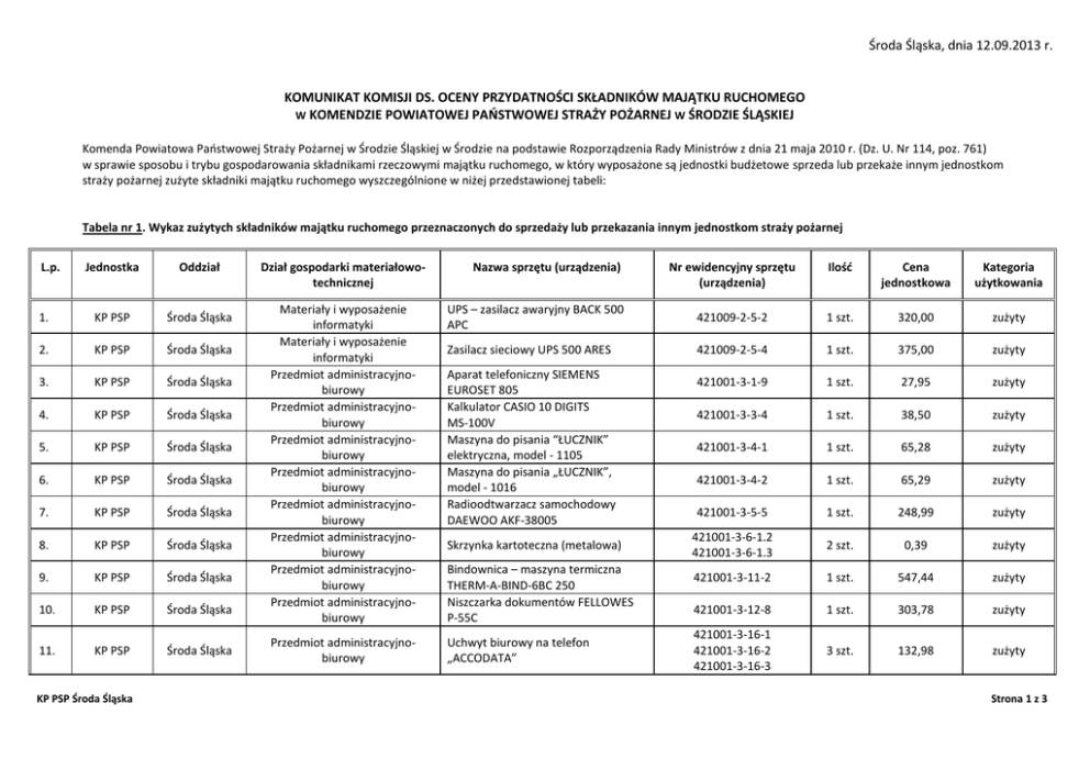Środa Śląska, dnia 12.09.2013 r. KOMUNIKAT KOMISJI DS. OCENY PRZYDATNOŚCI SKŁADNIKÓW MAJĄTKU RUCHOMEGO W KOMENDZIE POWIATOWEJ PAŃSTWOWEJ STRAŻY POŻARNEJ W ŚRODZIE ŚLĄSKIEJ Komenda Powiatowa Państwowej Straży Pożarnej w Środzie Śląskiej w Środzie na podstawie Rozporządzenia Rady Ministrów z dnia 21 maja 2010 r. (Dz. U. Nr 114, poz. 761) w sprawie sposobu i trybu gospodarowania składnikami rzeczowymi majątku ruchomego, w który wyposażone są jednostki budżetowe sprzeda lub przekaże innym jednostkom straży pożarnej zużyte składniki majątku ruchomego wyszczególnione w niżej przedstawionej tabeli: Tabela nr 1. Wykaz zużytych składników majątku ruchomego przeznaczonych do sprzedaży lub przekazania innym jednostkom straży pożarnej L.p. Jednostka Oddział 1. KP PSP Środa Śląska 2. KP PSP Środa Śląska 3. KP PSP Środa Śląska 4. KP PSP Środa Śląska 5. KP PSP Środa Śląska 6. KP PSP Środa Śląska 7. KP PSP Środa Śląska 8. KP PSP Środa Śląska 9. KP PSP Środa Śląska 10. KP PSP Środa Śląska 11. KP PSP Środa Śląska KP PSP Środa Śląska Dział gospodarki materiałowotechnicznej Nazwa sprzętu (urządzenia) Nr ewidencyjny sprzętu (urządzenia) Ilość Cena jednostkowa Kategoria użytkowania Materiały i wyposażenie informatyki Materiały i wyposażenie informatyki Przedmiot administracyjnobiurowy Przedmiot administracyjnobiurowy Przedmiot administracyjnobiurowy Przedmiot administracyjnobiurowy Przedmiot administracyjnobiurowy Przedmiot administracyjnobiurowy Przedmiot administracyjnobiurowy Przedmiot administracyjnobiurowy UPS – zasilacz awaryjny BACK 500 APC 421009-2-5-2 1 szt. 320,00 zużyty Zasilacz sieciowy UPS 500 ARES 421009-2-5-4 1 szt. 375,00 zużyty 421001-3-1-9 1 szt. 27,95 zużyty 421001-3-3-4 1 szt. 38,50 zużyty 421001-3-4-1 1 szt. 65,28 zużyty 421001-3-4-2 1 szt. 65,29 zużyty 421001-3-5-5 1 szt. 248,99 zużyty 421001-3-6-1.2 421001-3-6-1.3 2 szt. 0,39 zużyty 421001-3-11-2 1 szt. 547,44 zużyty 421001-3-12-8 1 szt. 303,78 zużyty Przedmiot administracyjnobiurowy Uchwyt biurowy na telefon „ACCODATA” 421001-3-16-1 421001-3-16-2 421001-3-16-3 3 szt. 132,98 zużyty Aparat telefoniczny SIEMENS EUROSET 805 Kalkulator CASIO 10 DIGITS MS-100V Maszyna do pisania “ŁUCZNIK” elektryczna, model - 1105 Maszyna do pisania „ŁUCZNIK”, model - 1016 Radioodtwarzacz samochodowy DAEWOO AKF-38005 Skrzynka kartoteczna (metalowa) Bindownica – maszyna termiczna THERM-A-BIND-6BC 250 Niszczarka dokumentów FELLOWES P-55C Strona 1 z 3 Przedmiot administracyjnobiurowy Przedmiot administracyjnobiurowy Przedmiot administracyjnobiurowy Przedmioty nie uznawane za środki trwałe Przedmioty nie uznawane za środki trwałe Przedmioty nie uznawane za środki trwałe Przedmioty nie uznawane za środki trwałe Przedmioty nie uznawane za środki trwałe Przedmioty nie uznawane za środki trwałe Przedmioty nie uznawane za środki trwałe Przedmioty nie uznawane za środki trwałe Przedmioty nie uznawane za środki trwałe Przedmioty nie uznawane za środki trwałe 12. KP PSP Środa Śląska 13. KP PSP Środa Śląska 14. KP PSP Środa Śląska 15. KP PSP Środa Śląska 16. KP PSP Środa Śląska 17. KP PSP Środa Śląska 18. KP PSP Środa Śląska 19. KP PSP Środa Śląska 20. KP PSP Środa Śląska 21. KP PSP Środa Śląska 22. KP PSP Środa Śląska 23. KP PSP Środa Śląska 24. KP PSP Środa Śląska 25. KP PSP Środa Śląska Uzbrojenie i technika specjalna 26. 27. 28. KP PSP KP PSP KP PSP Środa Śląska Środa Śląska Środa Śląska Uzbrojenie i technika specjalna Uzbrojenie i technika specjalna Sprzęt kwaterunkowy 29. KP PSP Środa Śląska Sprzęt kwaterunkowy 30. KP PSP Środa Śląska Sprzęt kwaterunkowy 31. KP PSP Środa Śląska Sprzęt kwaterunkowy 32. 33. KP PSP KP PSP Środa Śląska Środa Śląska Sprzęt kwaterunkowy Sprzęt kwaterunkowy KP PSP Środa Śląska Numerator biurowy (6-cyfrowy) 421001-3-18-1 1 szt. 228,99 zużyty 421001-3-23-1 1 szt. 1452,00 zużyty 421001-3-9-3 1 szt. 79,00 zużyty Fotel skórzany obrotowy 421005-4-6-1 1 szt. 370,00 zużyty Krzesło biurowe obrotowe „METRO GTP” 421005-4-7-6 1 szt. 158,00 zużyty Krzesło tapicerowane 421005-4-9-5 1 szt. 10,00 zużyty Fotel rozkładany (Sofa 1-osobowa) 421005-4-13-1 1 szt. 649,99 zużyty Stolik świetlicowy 421005-4-22-2 421005-4-22-4 2 szt. 35,00 zużyty Szafy metalowe BHP 421005-4-48/49 13 szt. 4,18 zużyty Regał metalowy magazynowy 421005-4-59-3 6 kpl. 0,66 zużyty Wykładzina dywanowa (23,20 m ) 421005-4-62-1 1 szt. 427,20 zużyty Firanki stylonowe 421005-4-63-1 4,79 zużyty Płótno zasłonowe (materiał) 421005-4-65-1 6,41 zużyty Telefaks „Panasonic” KX-FM 131 PD Wentylator biurowy stojący (3-piórowy) 2 Pompa szlamowa elektryczna FLOTEC BIOX 400/12 Eksplozymetr MINI GAS 4 Gaśnica śniegowa (GS-6X) Kuchenka mikrofalowa „SAMSUNG” Czajnik elektryczny bezprzewodowy „ZELMER” Odkurzacz elektryczny warsztatowy „MATRIX” Komplet obiadowo-kawowy 30-elementowy Łóżko polowe Materac polowy 10,20 mb 12,50 mb 421011-5-9-1 1 szt. 798,00 zużyty 421011-5-37-1 421011-5-40-1 421007-6-4-5 1 szt. 2 szt. 1 szt. 2224,00 5,05 369,00 zużyty zużyty zużyty 421007-6-7-2 1 szt. 108,99 zużyty 421007-6-10-4 1 szt. 254,98 zużyty 421007-6-16-1 1 kpl. 60,99 zużyty 421007-9-7-1 421007-9-9-1 14 szt. 28 szt. 0,68 0,02 zużyty zużyty Strona 2 z 3 34. KP PSP Środa Śląska Materiały i wyposażenie łączności 35. KP PSP Środa Śląska Materiały i wyposażenie łączności 36. KP PSP Środa Śląska Materiały i wyposażenie łączności 37. 38. KP PSP KP PSP Środa Śląska Środa Śląska Materiały i wyposażenie łączności Materiały i wyposażenie łączności 39. KP PSP Środa Śląska Materiały i wyposażenie łączności 40. KP PSP Środa Śląska Materiały i wyposażenie łączności 41. KP PSP Środa Śląska Materiały i wyposażenie łączności 42. KP PSP Środa Śląska Materiały i wyposażenie łączności 43. KP PSP Śr