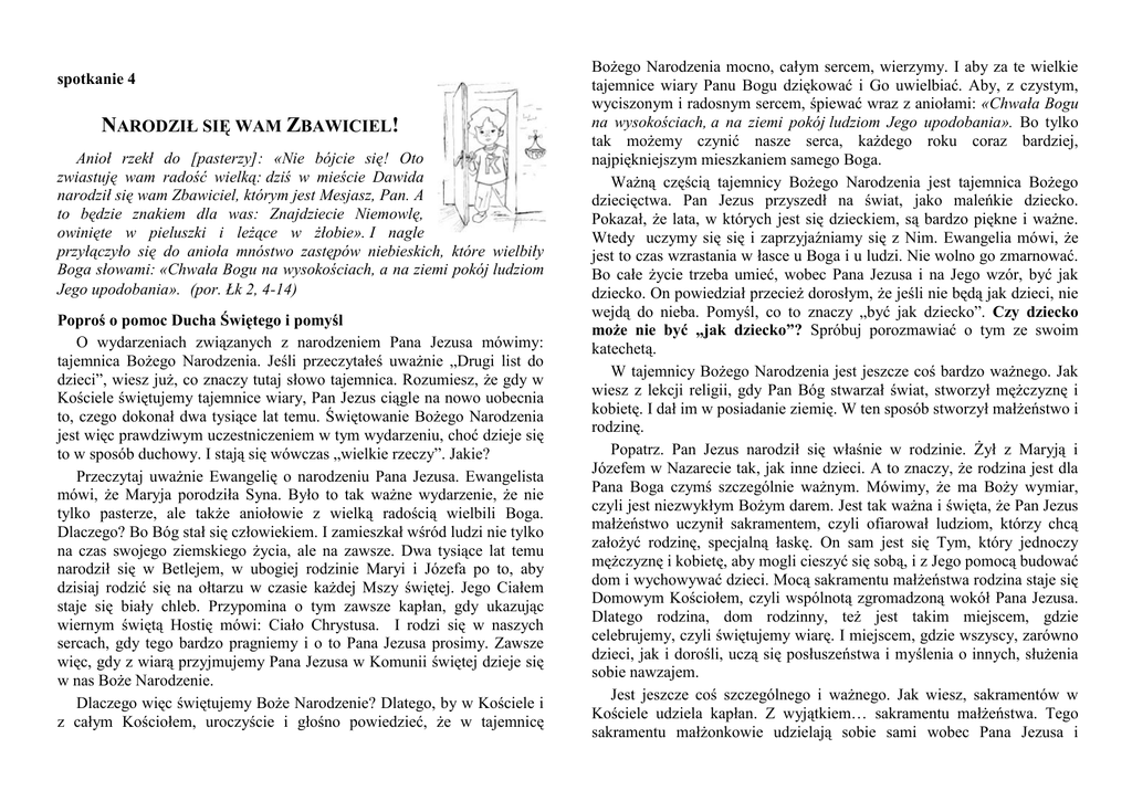 spotkanie 4 NARODZIŁ SIĘ WAM ZBAWICIEL! Anioł rzekł do [pasterzy]: «Nie bójcie się! Oto zwiastuję wam radość wielką: dziś w mieście Dawida narodził się wam Zbawiciel, którym jest Mesjasz, Pan. A to będzie znakiem dla was: Znajdziecie Niemowlę, owinięte w pieluszki i leżące w żłobie». I nagle przyłączyło się do anioła mnóstwo zastępów niebieskich, które wielbiły Boga słowami: «Chwała Bogu na wysokościach, a na ziemi pokój ludziom Jego upodobania». (por. Łk 2, 4-14) Poproś o pomoc Ducha Świętego i pomyśl O wydarzeniach związanych z narodzeniem Pana Jezusa mówimy: tajemnica Bożego Narodzenia. Jeśli przeczytałeś uważnie „Drugi list do dzieci”, wiesz już, co znaczy tutaj słowo tajemnica. Rozumiesz, że gdy w Kościele świętujemy tajemnice wiary, Pan Jezus ciągle na nowo uobecnia to, czego dokonał dwa tysiące lat temu. Świętowanie Bożego Narodzenia jest więc prawdziwym uczestniczeniem w tym wydarzeniu, choć dzieje się to w sposób duchowy. I stają się wówczas „wielkie rzeczy”. Jakie? Przeczytaj uważnie Ewangelię o narodzeniu Pana Jezusa. Ewangelista mówi, że Maryja porodziła Syna. Było to tak ważne wydarzenie, że nie tylko pasterze, ale także aniołowie z wielką radością wielbili Boga. Dlaczego? Bo Bóg stał się człowiekiem. I zamieszkał wśród ludzi nie tylko na czas swojego ziemskiego życia, ale na zawsze. Dwa tysiące lat temu narodził się w Betlejem, w ubogiej rodzinie Maryi i Józefa po to, aby dzisiaj rodzić się na ołtarzu w czasie każdej Mszy świętej. Jego Ciałem staje się biały chleb. Przypomina o tym zawsze kapłan, gdy ukazując wiernym świętą Hostię mówi: Ciało Chrystusa. I rodzi się w naszych sercach, gdy tego bardzo pragniemy i o to Pana Jezusa prosimy. Zawsze więc, gdy z wiarą przyjmujemy Pana Jezusa w Komunii świętej dzieje się w nas Boże Narodzenie. Dlaczego więc świętujemy Boże Narodzenie? Dlatego, by w Kościele i z całym Kościołem, uroczyście i głośno powiedzieć, że w tajemnicę Bożego Narodzenia mocno, całym sercem, wierzymy. I aby za te wielkie tajemnice wiary Panu Bogu dziękować i Go uwielbiać. Aby, z czystym, wyciszonym i radosnym sercem, śpiewać wraz z aniołami: «Chwała Bogu na wysokościach, a na ziemi pokój ludziom Jego upodobania». Bo tylko tak możemy czynić nasze serca, każdego roku coraz bardziej, najpiękniejszym mieszkaniem samego Boga. Ważną częścią tajemnicy Bożego Narodzenia jest tajemnica Bożego dziecięctwa. Pan Jezus przyszedł na świat, jako maleńkie dziecko. Pokazał, że lata, w których jest się dzieckiem, są bardzo piękne i ważne. Wtedy uczymy się się i zaprzyjaźniamy się z Nim. Ewangelia mówi, że jest to czas wzrastania w łasce u Boga i u ludzi. Nie wolno go zmarnować. Bo całe życie trzeba umieć, wobec Pana Jezusa i na Jego wzór, być jak dziecko. On powiedział przecież dorosłym, że jeśli nie będą jak dzieci, nie wejdą do nieba. Pomyśl, co to znaczy „być jak dziecko”. Czy dziecko może nie być „jak dziecko”? Spróbuj porozmawiać o tym ze swoim katechetą. W tajemnicy Bożego Narodzenia jest jeszcze coś bardzo ważnego. Jak wiesz z lekcji religii, gdy Pan Bóg stwarzał świat, stworzył mężczyznę i kobietę. I dał im w posiadanie ziemię. W ten sposób stworzył małżeństwo i rodzinę. Popatrz. Pan Jezus narodził się właśnie w rodzinie. Żył z Maryją i Józefem w Nazarecie tak, jak inne dzieci. A to znaczy, że rodzina jest dla Pana Boga czymś szczególnie ważnym. Mówimy, że ma Boży wymiar, czyli jest niezwykłym Bożym darem. Jest tak ważna i święta, że Pan Jezus małżeństwo uczynił sakramentem, czyli ofiarował ludziom, którzy chcą założyć rodzinę, specjalną łaskę. On sam jest się Tym, który jednoczy mężczyznę i kobietę, aby mogli cieszyć się sobą, i z Jego pomocą budować dom i wychowywać dzieci. Mocą sakramentu małżeństwa rodzina staje się Domowym Kościołem, czyli wspólnotą zgromadzoną wokół Pana Jezusa. Dlatego rodzina, dom rodzinny, też jest takim miejscem, gdzie celebrujemy, czyli świętujemy wiarę. I miejscem, gdzie wszyscy, zarówno dzieci, jak i dorośli, uczą się posłuszeństwa i myślenia o innych, służenia sobie nawzajem. Jest jeszcze coś szczególnego i ważnego. Jak wiesz, sakramentów w Kościele udziela kapłan. Z wyjątkiem… sakramentu małżeństwa. Tego sakramentu małżonkowie udzielają sobie sami wobec Pana Jezusa i Kościoła. A kapłan im błogosławi. Na tę chwilę otrzymują kapłańską władzę. Jej znakiem jest stuła, którą kapłan wiąże dłonie nowożeńców. W domu, w rodzinie, czyli w Domowym Kościele to rodzice właśnie, mama i tata, są „kapłanami”, czyli ofiarują siebie. Mama jest darem dla taty, a tata dla mamy. Oboje są darem dla dzieci, a przez to dla Pana Jezusa. Wielką moc ma też ich błogosławieństwo. Proś o nie często rodziców. Słuchaj i rozmawiaj z Panem Jezusem W okresie Bożego Narodzenia, zamiast na adorację Najświętszego Sakramentu, idź adorować żłóbek Pana Jezusa. Wiesz, że jeśli nie dasz rady inaczej, możesz to robić przed lub po Mszy świętej, na której jesteś obecny. Uklęknij przed szopką. Poproś o pomoc Ducha Świętego i, patrząc na figurkę Bożego Dzieciątka, przenieś się myślami do betlejemskiej groty. Popatrz jak Maryja i Józef adorowali maleńkiego Jezusa. Z jaką miłością Maryja tuliła Go w ramionach, karmiła Go, usypiała. Spójrz na pasterzy i Mędrców. Zobacz ich radość. Wsłuchaj się sercem w śpiew aniołów. Naśladuj w sercu tych wielkich, cichych i pełnych miłości świadków Bożego Narodzenia. Na każdą adorację przynieś Panu Jezusowi inną część twojego rozważania o tajemnicy Bożego Narodzenia. Rozmawiaj z Panem Jezusem. Nie tylko mów do niego. Pozostań też w ciszy. Słuchaj w sercu tego, co Pan Jezus chce ci powiedzieć. Adoruj Go. Powtarzaj Mu cichutko modlit