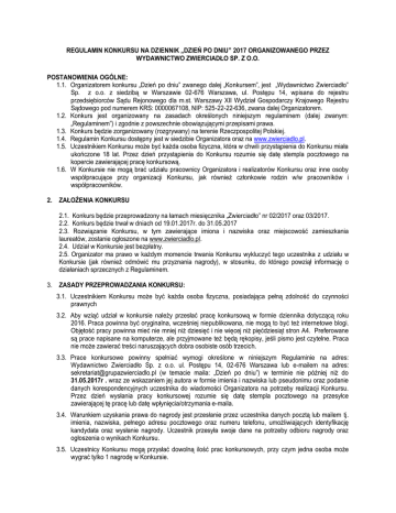 REGULAMIN KONKURSU NA DZIENNIK „DZIEŃ PO DNIU” 2017 ORGANIZOWANEGO PRZEZ WYDAWNICTWO ZWIERCIADŁO SP. Z O.O. POSTANOWIENIA OGÓLNE: 1.1. Organizatorem konkursu „Dzień po dniu” zwanego dalej „Konkursem”, jest „Wydawnictwo Zwierciadło” Sp. z o.o. z siedzibą w Warszawie 02-676 Warszawa, ul. Postępu 14, wpisana do rejestru przedsiębiorców Sądu Rejonowego dla m.st. Warszawy XII Wydział Gospodarczy Krajowego Rejestru Sądowego pod numerem KRS: 0000067108, NIP: 525-22-22-636, zwana dalej Organizatorem. 1.2. Konkurs jest organizowany na zasadach określonych niniejszym regulaminem (dalej zwanym: „Regulaminem”) i zgodnie z powszechnie obowiązującymi przepisami prawa. 1.3. Konkurs będzie zorganizowany (rozgrywany) na terenie Rzeczpospolitej Polskiej. 1.4. Regulamin Konkursu dostępny jest w siedzibie Organizatora oraz na www.zwierciadlo.pl. 1.5. Uczestnikiem Konkursu może być każda osoba fizyczna, która w chwili przystąpienia do Konkursu miała ukończone 18 lat. Przez dzień przystąpienia do Konkursu rozumie się datę stempla pocztowego na kopercie zawierającej pracę konkursową. 1.6. W Konkursie nie mogą brać udziału pracownicy Organizatora i realizatorów Konkursu oraz inne osoby współpracujące przy organizacji Konkursu, jak również członkowie rodzin w/w pracowników i współpracowników. 2. ZAŁOŻENIA KONKURSU 2.1. Konkurs będzie przeprowadzony na łamach miesięcznika „Zwierciadło” nr 02/2017 oraz 03/2017. 2.2. Konkurs będzie trwał w dniach od 19.01.2017r. do 31.05.2017 2.3. Rozwiązanie Konkursu, w tym zawierające imiona i nazwiska oraz miejscowość zamieszkania laureatów, zostanie ogłoszone na www.zwierciadlo.pl. 2.4. Udział w Konkursie jest bezpłatny. 2.5. Organizator ma prawo w każdym momencie trwania Konkursu wykluczyć tego uczestnika z udziału w Konkursie (jak również odmówić mu przyznania nagrody), w stosunku, do którego powziął informację o działaniach sprzecznych z Regulaminem. 3. ZASADY PRZEPROWADZANIA KONKURSU: 3.1. Uczestnikiem Konkursu może być każda osoba fizyczna, posiadająca pełną zdolność do czynności prawnych 3.2. Aby wziąć udział w konkursie należy przesłać pracę konkursową w formie dziennika dotyczącą roku 2016. Praca powinna być oryginalna, wcześniej niepublikowana, nie mogą to być też internetowe blogi. Objętość pracy powinna mieć nie mniej niż dziesięć i nie więcej niż pięćdziesiąt stron A4. Preferowane są prace napisane na komputerze, ale przyjmowane też będą rękopisy, jeśli pismo jest czytelne. Praca nie może zawierać treści naruszających dobra osobiste osób trzecich. 3.3. Prace konkursowe powinny spełniać wymogi określone w niniejszym Regulaminie na adres: Wydawnictwo Zwierciadło Sp. z o.o. ul. Postępu 14, 02-676 Warszawa lub e-mailem na adres: [email protected] (w temacie maila: „Dzień po dniu”) w terminie nie później niż do 31.05.2017r . wraz ze wskazaniem jej autora w formie imienia i nazwiska lub pseudonimu oraz podanie danych korespondencyjnych uczestnika do wiadomości Organizatora na potrzeby realizacji Konkursu. Przez dzień wysłania pracy konkursowej rozumie się datę stempla pocztowego na przesyłce zawierającej tę pracę lub datę wpłynięcia/otrzymania e-maila. 3.4. Warunkiem uzyskania prawa do nagrody jest przesłanie przez uczestnika danych pocztą lub mailem tj. imienia, nazwiska, pełnego adresu pocztowego oraz numeru telefonu, umożliwiających identyfikację kandydata oraz wysłanie nagrody. Uczestnik przesyła swoje dane na potrzeby odbioru nagrody oraz ogłoszenia o wynikach Konkursu. 3.5. Uczestnicy Konkursu mogą przysłać dowolną ilość prac konkursowych, przy czym jedna osoba może wygrać tylko 1 nagrodę w Konkursie. 3.6. Przystąpienie do Konkursu, zgodnie z postanowieniami niniejszego Regulaminu jest równoznaczne ze złożeniem przez uczestnika oświadczenia w przedmiocie akceptacji niniejszego Regulaminu. 3.7. Dane osobowe uczestników Konkursu w zakresie: imię i nazwisko, adres zamieszkania, numer telefonu komórkowego oraz adres e-mail będą przetwarzane przez Organizatora Konkursu, tj. Wydawnictwo Zwierciadło” Sp. z o.o. z siedzibą w Warszawie 02-676, ul. Postępu 14 (Administrator danych osobowych) w szczególności w celu realizacji umowy przystąpienia do konkursu i jego prawidłowego przeprowadzenia lub marketingu własnych produktów organizatora konkursu oraz w celu opublikowania wyników Konkursu oraz przekazania laureatom nagród konkursowych. Gwarantujemy prawo wglądu do swoich danych osobowych oraz ich poprawiania, jak również żądania zaprzestania przetwarzania danych. Podanie danych jest dobrowolne, lecz ich brak uniemożliwia w przypadku wygranej dostarczenie do zwycięzcy nagrody. Dane osobowe nie będą udostępniane innym podmiotom. Dane osobowe uczestników konkursu będą przetwarzane i chronione zgodnie z ustawą z dnia 29 sierpnia 1997 r. o ochronie danych osobowych (Dz. U. z 2002 r. Nr 101, poz. 926 z późniejszymi zmianami). Organizator informuje, iż dane osobowe laureatów konkursu zostaną opublikowane na stronie internetowej Organizatora (www.zwierciadlo.pl) w ramach rozwiązania Konkursu. 4. TRYB I ZASADY PRZEPROWADZENIA KONKURSU. 4.1. Spośród nadesłanych zgłoszeń Komisja Konkursowa wybierze 8 najciekawszych, najbardziej oryginalnych prac. Spośród w/w prac Komisja Konkursowa wyłoni jednego laureata, któremu przyzna I (pierwszą) nagrodę, trzech dodatkowych finalistów, którym przyzna nagrody dodatkowe oraz przyzna trzy 5 wyróżnień z zastrzeżeniem, że Komisja Konkursowa ma prawo do zmiany liczby wyłonionych prac o których mowa powyżej. 4.2. Wysłanie pracy konkursowej na Konkurs jest równoznaczne z wyrażeniem przez autora zgody na: - bezpłatną publikację tej pracy na łamach miesięcznika Zwierciadło i/lub innych wydawnictw należących do Wydawnictwa Zwierciadło w postaci drukowanej lub elektronicznej, w terminie 24 miesięcy od