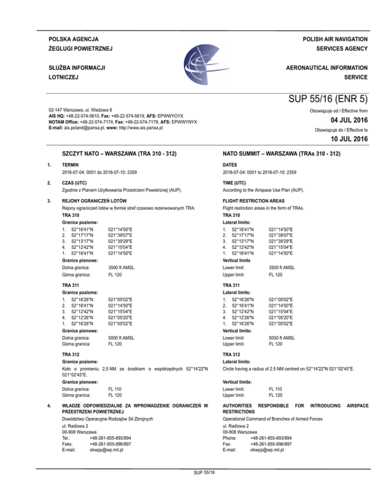 OGRANICZENIE DOSTÊPNOŒCI LOTNISKA KRAKÓW/BALICE Z POWODU PRAC REMONTOWYCH NA RWY 07/25 STRONA 1-1 PAGE 1-1 LIMITED AVAILABILITY OF KRAKÓW/BALICE AERODROME DUE TO OVERHAUL WORKS ON RWY 07/25 POLSKA AGENCJA POLISH AIR NAVIGATION ŻEGLUGI POWIETRZNEJ SERVICES AGENCY SŁUŻBA INFORMACJI AERONAUTICAL INFORMATION LOTNICZEJ SERVICE SUP 55/16 (ENR 5) 02-147 Warszawa, ul. Wieżowa 8 AIS HQ: +48-22-574-5610, Fax: +48-22-574-5619, AFS: EPWWYOYX NOTAM Office: +48-22-574-7174, Fax: +48-22-574-7179, AFS: EPWWYNYX E-mail: [email protected], www: http://www.ais.pansa.pl Obowiązuje od / Effective from 04 JUL 2016 Obowiązuje do / Effective to 10 JUL 2016 1. 2. 3. SZCZYT NATO – WARSZAWA (TRA 310 - 312) NATO SUMMIT – WARSZAWA (TRAs 310 - 312) TERMIN DATES 2016-07-04: 0001 do 2016-07-10: 2359 2016-07-04: 0001 to 2016-07-10: 2359 CZAS (UTC) TIME (UTC) Zgodnie z Planem Użytkowania Przestrzeni Powietrznej (AUP). According to the Airspace Use Plan (AUP). REJONY OGRANICZEŃ LOTÓW FLIGHT RESTRICTION AREAS Rejony ograniczeń lotów w formie stref czasowo rezerwowanych TRA: Flight restriction areas in the form of TRAs. TRA 310 TRA 310 Granice poziome: 1. 2. 3. 4. 1. 52°16′41″N 52°17′17″N 52°13′17″N 52°12′42″N 52°16′41″N Lateral limits: 021°14′50″E 021°39′07″E 021°39′29″E 021°15′04″E 021°14′50″E 021°14′50″E 021°39′07″E 021°39′29″E 021°15′04″E 021°14′50″E Granice pionowe: Dolna granica: 1. 52°16′41″N 2. 52°17′17″N 3. 52°13′17″N 4. 52°12′42″N 1. 52°16′41″N Vertical limits 3500 ft AMSL Lower limit: 3500 ft AMSL Górna granica: FL 120 Upper limit: FL 120 TRA 311 TRA 311 Granice poziome: 1. 2. 3. 4. 1. 52°16′26″N 52°16′41″N 52°12′42″N 52°12′26″N 52°16′26″N Lateral limits: 021°05′02″E 021°14′50″E 021°15′04″E 021°05′20″E 021°05′02″E 1. 2. 3. 4. 1. 5000 ft AMSL FL 120 Lower limit: Upper limit: Granice pionowe: Dolna granica: Górna granica: 021°05′02″E 021°14′50″E 021°15′04″E 021°05′20″E 021°05′02″E Vertical limits: TRA 312 5000 ft AMSL FL 120 TRA 312 Granice poziome: Lateral limits: Koło o promieniu 2,5 NM ze środkiem o współrzędnych 52°14′22″N 021°02′45″E. Circle having a radius of 2.5 NM centred on 52°14′22″N 021°02′45″E. Granice pionowe: Vertical limits: Dolna granica: Górna granica: 4. 52°16′26″N 52°16′41″N 52°12′42″N 52°12′26″N 52°16′26″N FL 110 FL 120 Lower limit: Upper limit: WŁADZE ODPOWIEDZIALNE ZA WPROWADZENIE OGRANICZEŃ W PRZESTRZENI POWIETRZNEJ FL 110 FL 120 AUTHORITIES RESPONSIBLE RESTRICTIONS FOR INTRODUCING Dowództwo Operacyjne Rodzajów Sił Zbrojnych Operational Command of Branches of Armed Forces ul. Radiowa 2 00-908 Warszawa Tel.: +48-261-855-893/894 Faks: +48-261-855-896/897 E-mail: [email protected] ul. Radiowa 2 00-908 Warszawa Phone: +48-261-855-893/894 Fax: +48-261-855-896/897 E-mail: [email protected] SUP 55/16 04 JUL 2016 AIRSPACE STRONA 1-2 PAGE 1-2 5. ORGANIZACJA RUCHU LOTNICZEGO ROUTING OF AIR TRAFFIC 5.1 Strefy czasowo rezerwowane TRA 310-312 aktywowane są w celu wykonywania lotów lotnictwa wojskowego, w celu zabezpieczenia szczytu NATO. Temporary Reserved Areas 310-312 are activated for flights by military aircraft and for securing the NATO summit. 5.2 Strefy TRA wydzielone są z przestrzeni odpowiedzialności służby APP WARSZAWA. Loty innych statków powietrznych możliwe tylko po uzyskaniu zgody od organizatora lotów. The TRAs are segregated within the area of responsibility of WARSZAWA APP. Flights of other aircraft are possible only with the approval of the organiser of flights. 5.3 Przestrzeń powietrzna w strefach TRA jest niesklasyfikowana. Airspace within the TRAs is unclassified. 5.4 Miejsce startu i lądowania znajduje się w obrębie granic strefy ruchu lotniskowego lotniska wojskowego MATZ EPMM. The take-off and landing site is located within the boundaries of the EPMM MATZ. 5.5 Użytkownik strefy zapewnia łączność służącą zapewnieniu skutecznego i niezwłocznego kontaktu pomiędzy służbami AMC/ATS a osobą bezpośrednio odpowiadającą za wykonywane lotów w strefach, która będzie dostępna przez cały czas aktywności stref TRA. The area operator provides telephone communication for effective and immediate contact between AMC/ATS and the person directly responsible for flights carried out within the areas who will be available during the period of the area activity. 5.6 Loty wewnątrz stref TRA wykonywane są bez naruszania ich granic. Flights within the TRAs are conducted clear of their boundaries. 6. INFORMACJE DODATKOWE ADDITIONAL INFORMATION 6.1 Strefy TRA podlegają procedurze zamawiania i aktywacji przez organizatora lotów zgodnie z AIP Polska ENR 2.2.3. pkt 4 oraz 5.2. The TRAs are to be requested and activated in accordance with AIP Poland ENR 2.2.3 points 4 and 5.2. 6.2 Czas aktywności stref TRA zgodnie z planem użytkowania przestrzeni powietrznej (AUP). The activity times of the TRAs are in accordance with the Airspace Use Plan (AUP). 6.3 Strefy TRA mogą być aktywowane w tym samym czasie co EA 97, EA 98 oraz EA 42 i EA 48. The TRAs may be activated at the same time as EA 97, EA 98 as well as EA 42 and EA 48. Patrz: mapa. See: chart. - KONIEC - 04 JUL 2016 - END - SUP 55/16