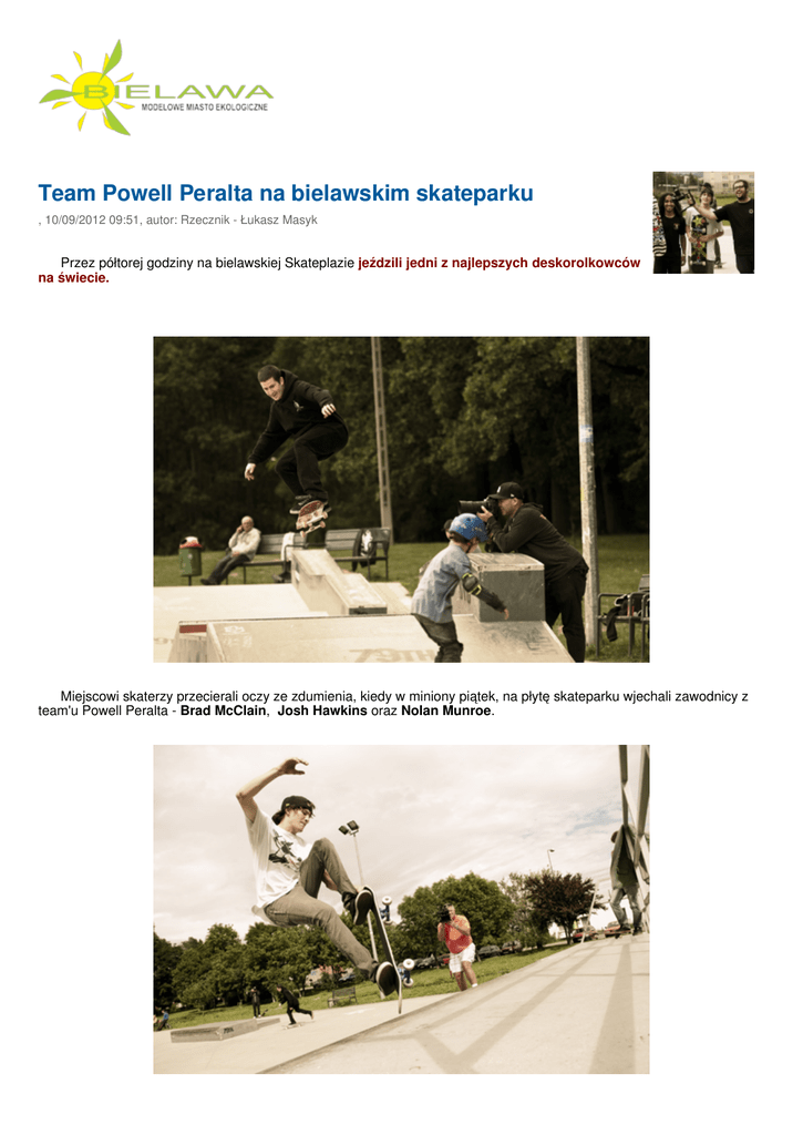 Team Powell Peralta na bielawskim skateparku , 10/09/2012 09:51, autor: Rzecznik - Łukasz Masyk Przez półtorej godziny na bielawskiej Skateplazie jeździli jedni z najlepszych deskorolkowców na świecie. Miejscowi skaterzy przecierali oczy ze zdumienia, kiedy w miniony piątek, na płytę skateparku wjechali zawodnicy z team'u Powell Peralta - Brad McClain, Josh Hawkins oraz Nolan Munroe. Wcześniej amerykanie zdobyli kilka nagród w zawodach Baltic Games, a także wystąpili gościnnie na łódzkim skateparku. Po wizycie w Bielawie, team Powell Peralta pojechał na kolejny pokaz, tym razem przed warszawską publicznością. Wizyta amerykańskich zawodników w Bielawie, została zorganizowana zupełnie spontanicznie i była możliwa dzięki dobrym kontaktom Urzędu Miejskiego z firmami Skateparki.pl i Pogo. Deskorolkowcom zza oceanu towarzyszyli filmowiec Terry Lerue i fotograf "Devill" Nunes. Ich relację z trasy po Polsce, w tym z wizyty w Bielawie, można będzie obejrzeć na stronie www.TonyHawk.com, a także w Skateboarder mag! © 2010 Gmina Bielawa. Wszelkie prawa zastrzeżone. All rights reserved. Projekt: XOOOM