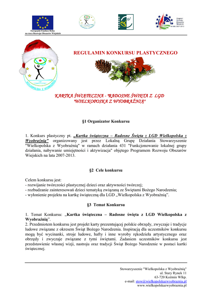 Europejski Fundusz Rolny na rzecz Rozwoju Obszarów Wiejskich REGULAMIN KONKURSU PLASTYCZNEGO KARTKA ŚWIĄTECZNA - "RADOSNE ŚWIĘTA Z LGD "WIELKOPOSKA Z WYOBRAŹNIĄ" §1 Organizator Konkursu 1. Konkurs plastyczny pt. „Kartka świąteczna – Radosne Święta z LGD Wielkopolska z Wyobraźnią” organizowany jest przez Lokalną Grupę Działania Stowarzyszenie "Wielkopolska z Wyobraźnią" w ramach działania 431 "Funkcjonowanie lokalnej grupy działania, nabywanie umiejętności i aktywizacja" objętego Programem Rozwoju Obszarów Wiejskich na lata 2007-2013. §2 Cele konkursu Celem konkursu jest: - rozwijanie twórczości plastycznej dzieci oraz aktywności twórczej; - rozbudzanie zainteresowań dzieci tematyką związaną ze Świętami Bożego Narodzenia; - wyłonienie projektu na kartkę świąteczną dla LGD „Wielkopolska z Wyobraźnią”. §3 Temat Konkursu 1. Temat Konkursu: „Kartka świąteczna – Radosne święta z LGD Wielkopolska z Wyobraźnią”. 2. Przedmiotem konkursu jest projekt karty prezentującej polskie obrzędy, zwyczaje i tradycje ludowe związane z okresem Świąt Bożego Narodzenia. Inspiracją dla uczestników konkursu mogą być wycinanki, stroje ludowe, hafty i inne wyroby rękodzieła artystycznego oraz obrzędy i zwyczaje związane z tymi świętami. Zadaniem uczestników konkursu jest przedstawienie własnej wizji, nastroju oraz tradycji Świąt Bożego Narodzenie w postaci kartki świątecznej. Stowarzyszenie "Wielkopolska z Wyobraźnią" ul. Stary Rynek 11 63-720 Koźmin Wlkp. e-mail: [email protected] www.wielkopolskazwyobraznia.pl Europejski Fundusz Rolny na rzecz Rozwoju Obszarów Wiejskich §4 Uczestnicy Konkursu 1. Konkurs adresowany jest do uczniów szkół podstawowych z terenu Lokalnej Grupy Działania (LGD) Stowarzyszenie "Wielkopolska z Wyobraźnią" obejmującej gminy: Borek Wlkp., Koźmin Wlkp., Pogorzela i Rozdrażew oraz uczniów szkół podstawowych zamieszkałych na terenie LGD, a uczących się poza terenem LGD. 2. Do Konkursu przystępuje dowolna liczba uczniów z danej klasy i szkoły. 3. Osoby niepełnoletnie mogą wziąć udział w konkursie za zgodą rodziców lub opiekunów prawnych. §5 Warunki uczestnictwa w konkursie 1. Udział w konkursie jest bezpłatny. 2. Przystąpienie do Konkursu następuje poprzez zgłoszenie za pomocą formularza zgłoszeniowego stanowiącego załącznik do niniejszego Regulaminu. 3. Uczestnicy wykonują prace plastyczne indywidualnie, techniką dowolną (prócz komputerowej), format pracy – maksymalnie A4. 4. Każdy uczestnik może zgłosić do Konkursu maksymalnie 3 prace. 5. Na odwrocie pracy należy wpisać: imię i nazwisko autora oraz wiek/klasę i pełną nazwę placówki, do której uczęszcza autor, imię i nazwisko opiekuna. 6. Każda kartka ma zawierać logo LGD Stowarzyszenia „Wielkopolska z Wyobraźnią”, gdyż zwycięska praca będzie wykorzystana jako kartka świąteczna LGD. 7. Prace (wraz z dołączonym formularzem zgłoszeniowym) należy złożyć osobiście lub przesyłać w terminie do 6 grudnia 2012 r. na adres: Stowarzyszenie „Wielkopolska z Wyobraźnią” Ul. Stary Rynek 11 63-720 Koźmin Wielkopolski Z dopiskiem: „Kartka świąteczna – Radosne Święta z LGD Wielkopolska z Wyobraźnią” 8. Uczestnik, zgłaszając się do konkursu oświadcza, iż przysługują mu wyłączne i nieograniczone prawa autorskie do nadesłanych prac. Ponadto oświadcza, że wyraża zgodę na wielokrotne, nieodpłatne publikowanie nagrodzonej kartki oraz opublikowanie jego imienia, nazwiska oraz miejscowości zamieszkania w materiałach promocyjnych związanych z konkursem, w wydawnictwach oraz na stronach internetowych LGD oraz Gmin Stowarzyszenie "Wielkopolska z Wyobraźnią" ul. Stary Rynek 11 63-720 Koźmin Wlkp. e-mail: [email protected] www.wielkopolskazwyobraznia.pl Europejski Fundusz Rolny na rzecz Rozwoju Obszarów Wiejskich wchodzących w skład LGD, a także na ich wykorzystywanie w celach promocyjnych i marketingowych. Ponadto wyraża zgodę na druk zwycięskiej kartki jako kartki świątecznej Stowarzyszenia na rok 2012. 9. Uczestnicy wyrażają zgodę na przetwarzanie swoich danych osobowych zgodnie z ustawą o ochronie danych osobowych (Dz. U. z 2002 r. Nr 101 pozycja 926 j.t ) w zakresie niezbędnym do realizacji konkursu. 10. Prace plastyczne przechodzą na własność Organizatora i nie będą odsyłane. 11. Nadesłanie prac jest jednoznaczne z akceptacją niniejszego Regulaminu. 12. Organizator konkursu ma prawo odrzucić prace niezgodne z Regulaminem. 13. Organizator konkursu nie bierze odpowiedzialności za uszkodzenie lub zaginięcie prac w trakcie przesyłki. §6 Komisja Konkursowa 1. O wyłonieniu zwycięzców Konkursu decyduje Komisja Konkursowa powołana przez Organizatora, zwana dalej „Komisją”. 2. Komisja zobowiązana jest do zachowania bezstronności podczas oceny poszczególnych prac. 3. Konkurs jest jednoetapowy. 4. Zakończenie Konkursu i przyznanie nagród odbędzie się podczas imprezy promocyjnej „Spotkanie z tradycją na Wielkopolską Nutę – Cztery Świece Adwentu” – termin imprezy: 16 grudnia 2012 – Rynek w Borku Wielkopolskim. 5. Decyzje Komisji Konkursowej są ostateczne i nie przysługuje od nich odwołanie. §7 Nagrody 1. Spośród zgłoszonych do Konkursu prac Komisja wybierze jedną pracę zwycięską. Ponadto komisji przysługuje prawo do nadania wyróżnień. 2. Autorzy wyróżnionych prac otrzymają nagrody rzeczowe. 3. Kryterium wyróżnienia prac konkursowych będzie oryginalność i odzwierciedlenie tematu Konkursu. 4. Komisja może wyróżnić również inne – szczególnie ciekawe – indywidualne prace wyłonione w Konkursie. 6. Nagrody zostaną wręczone laureatom podczas imprezy promocyjnej „Spotkanie z tradycją na Wielkopolską Nutę – Cztery Świece Adwentu” – termin imprezy: 16 grudnia 2012 – Rynek w Borku Wielkopolskim. 7. W przypadku nieobecności podczas wręczania wyróżnień, nagrody do odeb