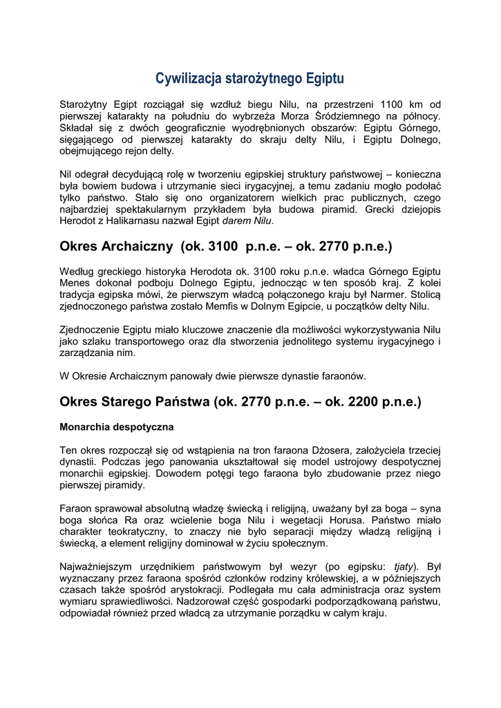 Cywilizacja starożytnego Egiptu Starożytny Egipt rozciągał się wzdłuż biegu Nilu, na przestrzeni 1100 km od pierwszej katarakty na południu do wybrzeża Morza Śródziemnego na północy. Składał się z dwóch geograficznie wyodrębnionych obszarów: Egiptu Górnego, sięgającego od pierwszej katarakty do skraju delty Nilu, i Egiptu Dolnego, obejmującego rejon delty. Nil odegrał decydującą rolę w tworzeniu egipskiej struktury państwowej – konieczna była bowiem budowa i utrzymanie sieci irygacyjnej, a temu zadaniu mogło podołać tylko państwo. Stało się ono organizatorem wielkich prac publicznych, czego najbardziej spektakularnym przykładem była budowa piramid. Grecki dziejopis Herodot z Halikarnasu nazwał Egipt darem Nilu. Okres Archaiczny (ok. 3100 p.n.e. – ok. 2770 p.n.e.) Według greckiego historyka Herodota ok. 3100 roku p.n.e. władca Górnego Egiptu Menes dokonał podboju Dolnego Egiptu, jednocząc w ten sposób kraj. Z kolei tradycja egipska mówi, że pierwszym władcą połączonego kraju był Narmer. Stolicą zjednoczonego państwa zostało Memfis w Dolnym Egipcie, u początków delty Nilu. Zjednoczenie Egiptu miało kluczowe znaczenie dla możliwości wykorzystywania Nilu jako szlaku transportowego oraz dla stworzenia jednolitego systemu irygacyjnego i zarządzania nim. W Okresie Archaicznym panowały dwie pierwsze dynastie faraonów. Okres Starego Państwa (ok. 2770 p.n.e. – ok. 2200 p.n.e.) Monarchia despotyczna Ten okres rozpoczął się od wstąpienia na tron faraona Dżosera, założyciela trzeciej dynastii. Podczas jego panowania ukształtował się model ustrojowy despotycznej monarchii egipskiej. Dowodem potęgi tego faraona było zbudowanie przez niego pierwszej piramidy. Faraon sprawował absolutną władzę świecką i religijną, uważany był za boga – syna boga słońca Ra oraz wcielenie boga Nilu i wegetacji Horusa. Państwo miało charakter teokratyczny, to znaczy nie było separacji między władzą religijną i świecką, a element religijny dominował w życiu społecznym. Najważniejszym urzędnikiem państwowym był wezyr (po egipsku: tjaty). Był wyznaczany przez faraona spośród członków rodziny królewskiej, a w późniejszych czasach także spośród arystokracji. Podlegała mu cała administracja oraz system wymiaru sprawiedliwości. Nadzorował część gospodarki podporządkowaną państwu, odpowiadał również przed władcą za utrzymanie porządku w całym kraju. Nomarchowie Zarządcami prowincji (nomów) byli nomarchowie. Pełnili oni także funkcje najwyższych w danej prowincji sędziów i kapłanów. Sprawowali władzę dziedzicznie, co może świadczyć, iż byli potomkami władców księstw egipskich sprzed zjednoczenia kraju. Egipt był podzielony na 42 nomy. Obrona kraju Stare Państwo miało charakter pokojowy: nie istniała stała armia, każdy nom posiadał własne siły porządkowe, lecz były one dowodzone przez cywilnych urzędników i używane głównie do robót publicznych. W sytuacji zagrożenia zewnętrznego na wezwanie faraona organizowano obronę opartą na połączeniu sił regionalnych, którymi dowodził jeden z cywilnych urzędników władcy. Pierwszy Okres Przejściowy (ok. 2200 p.n.e. – ok. 2050 p.n.e.) Okres ten rozpoczął się od buntu nomarchów. Rewolta spowodowała rozpad Starego Państwa. Doszło do niej w sytuacji kryzysu państwa, spowodowanego przede wszystkim faktem, iż kolejni faraonowie angażowali ogromne środki w budowę prestiżowych piramid, zaniedbując gospodarkę. Realizowanie wielkich inwestycji budowlanych łączyło się ze zwiększeniem obciążeń społeczeństwa na rzecz władzy. Nie utrzymywano w odpowiednim stanie systemu irygacyjnego, co w efekcie powodowało coraz słabsze zbiory. W tym okresie Egipt podzielił się na rywalizujące ze sobą księstwa, zapanował chaos. Plemiona pustynne dokonywały łupieżczych najazdów na terytorium egipskie. Kryzys został przezwyciężony dzięki nomarchom z Teb, którzy odbudowali władzę centralną, zapoczątkowując XI dynastię faraonów. W dowodzonej przez nich armii dużą rolę odegrali wojownicy pochodzący z Nubii. Okres Średniego Państwa (ok. 2050 p.n.e. – 1786 p.n.e.) Po poskromieniu buntu i przywróceniu jedności państwa faraonowie wprowadzili system, w którym nomarchowie nie dziedziczyli swojego urzędu, lecz byli mianowani. Stolica państwa najpierw znajdowała się w Tebach, a potem znów w Memfis. Faraonowie, ograniczając znaczenie arystokracji, oparli swoją władzę na sojuszu z kupcami, rzemieślnikami i rolnikami. Polityka ta doprowadziła do wzrostu ogólnego poziomu dobrobytu. Roboty publiczne służyły w większym stopniu całemu społeczeństwu, zrezygnowano bowiem z budowy piramid na rzecz osuszania bagien i rozbudowy systemu irygacyjnego. Religia kładła większy nacisk na kwestie moralne, mniejszy natomiast na rytuał zależny od pozycji materialnej. Egipt zaczął intensywnie rozwijać kontakty handlowe ze światem zewnętrznym: importowano kadzidło i perfumy z Arabii, miedź z półwyspu Synaj, wyroby rzemieślnicze z Fenicji, Mezopotamii i Krety. W fenickim mieście Byblos rezydował egipski przedstawiciel handlowy. W okresie Średniego Państwa Egipcjanie wybudowali fortyfikacje od strony Palestyny, co świadczyło o rosnącym zagrożeniu militarnym z tego kierunku. Egipt dokonał podboju Dolnej Nubii (dzisiejszy północny Sudan) – kraj ten słynął z bogatych złóż złota oraz zasobnych kamieniołomów, jego opanowanie chroniło także Egipt przed najazdami plemion koczowniczych. Egipcjanie wybudowali w pobliżu drugiej katarakty Nilu fortecę, której kamienny mur był wysoki na dziewięć metrów i gruby na pięć. Drugi Okres Przejściowy (ok. 1786 p.n.e. – 1560 p.n.e.) Ok. roku 1786 p.n.e., po okresie panowania faraona Amenemhata III z XII dynastii, Egipt wkroczył w fazę chaosu. Po raz kolejny rozpadły się struktury państwa. W Górnym i Dolnym Egipcie
