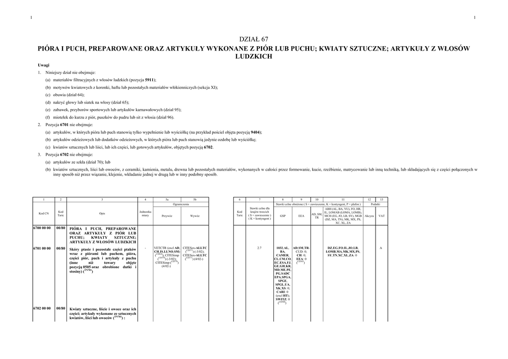1 1 DZIAŁ 67 PIÓRA I PUCH, PREPAROWANE ORAZ ARTYKUŁY WYKONANE Z PIÓR LUB PUCHU; KWIATY SZTUCZNE; ARTYKUŁY Z WŁOSÓW LUDZKICH Uwagi 1. Niniejszy dział nie obejmuje: (a) materiałów filtracyjnych z włosów ludzkich (pozycja 5911); (b) motywów kwiatowych z koronki, haftu lub pozostałych materiałów włókienniczych (sekcja XI); (c) obuwia (dział 64); (d) nakryć głowy lub siatek na włosy (dział 65); (e) zabawek, przyborów sportowych lub artykułów karnawałowych (dział 95); (f) miotełek do kurzu z piór, puszków do pudru lub sit z włosia (dział 96). 2. Pozycja 6701 nie obejmuje: (a) artykułów, w których pióra lub puch stanowią tylko wypełnienie lub wyściółkę (na przykład pościel objęta pozycją 9404); (b) artykułów odzieżowych lub dodatków odzieżowych, w których pióra lub puch stanowią jedynie ozdobę lub wyściółkę; (c) kwiatów sztucznych lub liści, lub ich części, lub gotowych artykułów, objętych pozycją 6702. 3. Pozycja 6702 nie obejmuje: (a) artykułów ze szkła (dział 70); lub (b) kwiatów sztucznych, liści lub owoców, z ceramiki, kamienia, metalu, drewna lub pozostałych materiałów, wykonanych w całości przez formowanie, kucie, rzeźbienie, matrycowanie lub inną techniką, lub składających się z części połączonych w inny sposób niż przez wiązanie, klejenie, wkładanie jednej w drugą lub w inny podobny sposób. 1 2 3 4 5a 5b 6 7 Ograniczenia Kod CN Kod Taric Opis 6700 00 00 00/80 PIÓRA I PUCH, PREPAROWANE ORAZ ARTYKUŁY Z PIÓR LUB PUCHU; KWIATY SZTUCZNE; ARTYKUŁY Z WŁOSÓW LUDZKICH 6701 00 00 00/80 Skóry ptasie i pozostałe części ptaków wraz z piórami lub puchem, pióra, części piór, puch i artykuły z puchu (inne niż towary objęte pozycją 0505 oraz obrobione dutki i stosiny) (TN701) Jednostka miary - Przywóz Wywóz VETCTR (excl AD, CITESex-ALLTC CH, IS, LI, NO, SM) (CD371) (-3/02); (CD624); CITESimp CITESex-ALLTC (CD370) (-3/02); (CD371) (4/02-) CITESimp (CD370) (4/02-) - - - - - - 8 9 Kod Taric Stawki celne dla krajów trzecich ( S = zawieszenie ) ( K = kontyngent ) - 2.7 GSP 1032, AL, AD, SM, TRBA, CUD: 0; CAMER, CH: 0; EEA: 0 CL, CM, CO, EC, ESA, FJ, (CD303) GE, GH, KR, MD, ME, PE, PG, SADC EPA, SPGA, SPGE, SPGL, UA, XK, XS: 0; CARI: 0 (excl HT); SWITZ: 0 (CD500) - - - - - - - - - - - - - - - - - - - - - - - - - - - - Kwiaty sztuczne, liście i owoce oraz ich części; artykuły wykonane ze sztucznych kwiatów, liści lub owoców (TN701) : - - - 00/80 11 12 13 Podatki ABH (AL, BA, YU), FO, HR, IL, LOMAB (LOMA, LOMB), AD, SM, MCH (EG, JO, LB, SY), MGB Akcyza TR (DZ, MA, TN), MK, MX, PS, XC, XL, ZA EEA - 6702 00 00 10 Stawki celne obniżone ( S = zawieszenie, K = kontyngent, P = plafon ) - DZ, EG, FO, IL, JO, LB, LOMB,MA, MK, MX, PS, SY, TN, XC, XL, ZA: 0 - - - - - - - - - - - A - - - - VAT - 2 2 1 6702 10 00 2 3 4 5a 5b - 00/80 - Z tworzyw sztucznych 6 7 8 4.7; SUSSH: 0 (TM510) (EU003); AIRWO: 0 (CD333) - - - 9 10 11 12 1032, AL, AD, SM, TRBA, CUD: 0; CAMER, CH: 0; CL, CM, CO, EEA: 0 EC, ESA, FJ, (CD303) GE, GH, KR, MD, ME, PE, PG, SADC EPA, SPGA, SPGE, SPGL, UA, XK, XS: 0; CARI: 0 (excl HT); SWITZ: 0 (CD500) 1032, AL, AD, SM, TRBA, CUD: 0; CH: 0; CAMER, CL, CM, CO, EEA: 0 EC, ESA, FJ, (CD303) GE, GH, KR, MD, ME, PE, PG, SADC EPA, SPGA, SPGE, SPGL, UA, XK, XS: 0; CARI: 0 (excl HT); SWITZ: 0 (CD500) 1032, AL, AD, SM, TRBA, CUD: 0; CAMER, CH: 0; CL, CM, CO, EEA: 0 (CD303) EC, ESA, FJ, GE, GH, KR, MD, ME, PE, PG, SADC EPA, SPGA, SPGE, SPGL, UA, XK, XS: 0; CARI: 0 (excl HT); SWITZ: 0 (CD500) DZ, EG, FO, IL, JO, LB, LOMB,MA, MK, MX, PS, SY, TN, XC, XL, ZA: 0 1032, AL, AD, SM, TRBA, CUD: 0; CH: 0; CAMER, CL, CM, CO, EEA: 0 EC, ESA, FJ, (CD303) GE, GH, KR, MD, ME, PE, PG, SADC EPA, SPGA, SPGE, SPGL, UA, XK, XS: 0; CARI: 0 (excl HT); SWITZ: 0 (CD500) DZ, EG, FO, IL, JO, LB, LOMB,MA, MK, MX, PS, SY, TN, XC, XL, ZA: 0 - - - - - - - - - - - - - - - - - - - - - - - - - - - - 13 A - - - - - - - - - - - - - - - - - - - - - 6702 90 00 00/80 - Z pozostałych materiałów - CITESimp (CD370) (- CITESex-ALLTC 3/02); CITESimp (CD371) (-3/02); CITESex-ALLTC (CD370) (4/02-) (CD371) (4/02-) 4.7; SUSSH: 0 (TM510) (EU003); AIRWO: 0 (CD333) - - - - - - - - - - - - - - - - - - DZ, EG, FO, IL, JO, LB, LOMB,MA, MK, MX, PS, SY, TN, XC, XL, ZA: 0 - - - - - - - - - - - - A - - - - - - - - - - - - - - - - - - - - - - 6703 00 00 00/80 Włosy ludzkie, czesane, ścieniane, wybielane lub poddane innej obróbce; wełna lub inna sierść zwierzęca, lub inne materiały włókiennicze, przygotowane do użytku przy wyrabianiu peruk lub temu podobnych (TN701) - CITESimp (CD370) (- CITESex-ALLTC 3/02); CITESimp (CD371) (-3/02); CD370 ( ) (4/02-); CITESex-ALLTC FURIM (CD568) (CD371) (4/02-); FUREX-ALLTC (CD568) - 1.7 - - - - - - - - - - - - - - - DZ, EG, FO, IL, JO, LB, LOMB,MA, MK, MX, PS, SY, TN, XC, XL, ZA: 0 - - - - - - - - - - - - A - - - - - - - - - - - - - - - - - - - - - - 6704 00 00 00/80 6704 11 00 00/10 - Z materiałów syntetycznych : 6704 11 00 00/80 - - Kompletne peruki Peruki, sztuczne brody, brwi i rzęsy, podkłady do włosów i temu podobne, z włosów ludzkich lub zwierzęcych, lub materiałów włókienniczych; artykuły z włosów ludzkich, gdzie indziej niewymienione ani niewłączone (TN701) : włókienniczych - LPS-KP (CD203) LUXEX-KP (TM684) (TM684) (CD994) (CD223) (CD994) - 2.2 - - - - - - - - - - - - - - - - - - - - - - - - - - - - - - - - - - - - - - - - - - - - A - - - - - 3 3 1 6704 19 00 2 3 00/80 - - Pozostałe 4 - 5a 5b LPS-KP (CD203) LUXEX-KP (TM684) (TM684) (CD994) (CD223) (CD994) 6 7 - 2.2 8 9 10 1032, AL, AD, SM, TRBA, CUD: 0; CAMER, CH: 0; CL, CM, CO, EEA: 0 EC, ESA, FJ, (CD303) GE, GH, KR, MD, ME, PE, PG, SADC EPA, SPGA, SPGE, SPGL, UA, XK, XS: 0; CARI: 0 (excl HT); SWITZ: 0 (CD500) 1032, AL, AD, SM, TRBA, CUD: 0; CH: 0; CAMER, CL, CM, CO, EEA: 0 EC, ESA, FJ, (CD303) GE, GH, KR, MD, ME, PE, PG, SADC EPA, SPGA, SPGE, SPGL, UA, XK, XS: 0; CARI: 0 (excl HT); SWITZ: 0 (CD500) 1032, AL, AD, SM, TRBA, C
