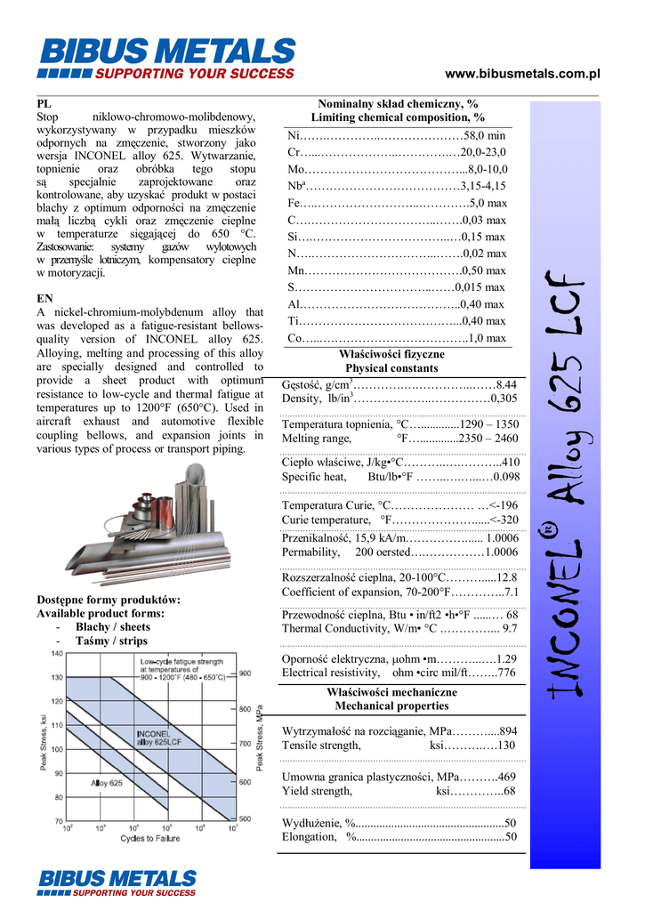 www.bibusmetals.com.pl Ni…….…………..…………………58,0 min Cr…...………………..………….…20,0-23,0 Mo…………………………………...8,0-10,0 Nbª…………………………………3,15-4,15 Fe…..……………………..………….5,0 max C….…………………………..…….0,03 max Si….……………………………..…0,15 max N….…………………………..…….0,02 max Mn………………………………….0,50 max S……………………………..……0,015 max Al…………………………………..0,40 max Ti…………………………………...0,40 max Co…...……………………………….1,0 max ciwo ci fizyczne Physical constants sto , g/cm3………….….…………..……8.44 Density, lb/in3………………..……………0,305 Temperatura topnienia, °C….............1290 – 1350 Melting range, °F….............2350 – 2460 Ciep o w ciwe, J/kg•°C………..….………..410 Specific heat, Btu/lb•°F ……..….…...…0.098 Temperatura Curie, °C………………… …<-196 Curie temperature, °F………………….....<-320 Przenikalno , 15,9 kA/m……………...... 1.0006 Permability, 200 oersted….……………1.0006 Dost pne formy produktów: Available product forms: - Blachy / sheets - Ta my / strips Rozszerzalno cieplna, 20-100°C……….....12.8 Coefficient of expansion, 70-200°F…………..7.1 Przewodno cieplna, Btu • in/ft2 •h•°F ......… 68 Thermal Conductivity, W/m• °C .…………... 9.7 Oporno elektryczna, µohm •m………...….1.29 Electrical resistivity, ohm •circ mil/ft……..776 ciwo ci mechaniczne Mechanical properties Wytrzyma na rozci ganie, MPa………....894 Tensile strength, ksi……….….130 Umowna granica plastyczno ci, MPa……….469 Yield strength, ksi…………..68 Wyd enie, %..................................................50 Elongation, %..................................................50 INCONEL Alloy 625 LCF EN A nickel-chromium-molybdenum alloy that was developed as a fatigue-resistant bellowsquality version of INCONEL alloy 625. Alloying, melting and processing of this alloy are specially designed and controlled to provide a sheet product with optimum resistance to low-cycle and thermal fatigue at temperatures up to 1200°F (650°C). Used in aircraft exhaust and automotive flexible coupling bellows, and expansion joints in various types of process or transport piping. Nominalny sk ad chemiczny, % Limiting chemical composition, % ® PL Stop niklowo-chromowo-molibdenowy, wykorzystywany w przypadku mieszków odpornych na zm czenie, stworzony jako wersja INCONEL alloy 625. Wytwarzanie, topnienie oraz obróbka tego stopu specjalnie zaprojektowane oraz kontrolowane, aby uzyska produkt w postaci blachy z optimum odporno ci na zm czenie ma liczb cykli oraz zm czenie cieplne w temperaturze si gaj cej do 650 °C. Zastosowanie: systemy gazów wylotowych w przemy le lotniczym, kompensatory cieplne w motoryzacji.