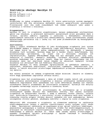 Instrukcja obsługi NaviEye II Wersja 1.1 Wersja software 1.0.4 Wersja hardware 1.0 Wstęp: Dziękujemy za zakup urządzenia NaviEye II, które wykorzystuje system nawigacji satelitarnej GPS dla określania dokładnej pozycji geograficznej użytkownika. Przeznaczone jest dla osób niewidomych lub słabo widzących jako pomoc w orientacji w terenie i otoczeniu. Przypomnienie: NaviEye II jest to urządzenie uzupełniające, mające podpowiadać użytkownikowi gdzie się znajduje, w granicach możliwości wyznaczonych przez posiadane dane o terenie, warunki odbioru sygnałów z satelitów i dokładności określenia współrzędnych satelitów w przestrzeni wokółziemskiej. Znane użytkownikowi zasady bezpiecznego poruszania się z laską czy też psem przewodnikiem są bezwzględnie obowiązujące. Zastrzeżenia: Jedną z części składowych NaviEye II jako działającego urządzenia jest system GPS/GLONASS będący w całości własnością rządu USA/Federacji Rosyjskiej, które tym samym biorą na siebie pełną odpowiedzialność za dokładność i pewność działania tych systemów. Systemy mogą być w każdej chwili modyfikowane, bez wcześniejszego uprzedzenia, co wiąże się z możliwymi zmianami ich charakterystyki. Sygnały GPS/GLONASS mogą nie być dostępne przez cały czas, zwłaszcza w tunelach, wewnątrz budynków, terenach miejskich zabudowanych wysokimi budynkami lub w gęstych lasach. Mogą być również niedostępne lub ich działanie może być obarczone dużym błędem na obszarach będących terenem działania sił zbrojnych USA lub Federacji Rosyjskiej. Używanie NaviEye II może podlegać ograniczeniom na pokładzie samolotu, w szpitalach, obiektach publicznych, instytucjach rządowych, laboratoriach itp. Należy w takich miejscach przestrzegać odpowiednich przepisów obowiązujących w tej materii. Nie należy pozwalać na zabawę urządzeniem małym dzieciom. Zawiera on elementy które mogą spowodować zagrożenie zdrowia dzieci. Urządzenie musi być przechowywane z dala od źródeł ciepła takich jak grzejniki oraz unikania pozostawiania urządzenia w miejscu intensywnie nasłonecznionym. Nadmierne nagrzewanie może spowodować nie tylko deformację obudowy ale również uszkodzenie baterii prowadzące do zniszczenia urządzenia. Sytuacja nie dotyczy przypadku normalnego użycia urządzenia w słoneczny dzień. Obudowa urządzenia nie jest przystosowana do użytkowania go w przypadku intensywnych opadów deszczu bez dodatkowej ochrony. Nie należy wystawiać urządzenia na bezpośredni kontakt z wodą w dowolnej formie (deszcz, zalania itp). Konstrukcja klawiatury i wierzchniej strony urządzenia może mieć kontakt z niewielką ilością wilgoci (drobny deszcz) jednakże nie jest wodoodporna. Należy szczególnie chronić głośnik, wbudowany mikrofon i złącza na czole urządzenia. Odbiorniki GPS stosowane w urządzeniu są elementem podatnym na zakłócenia elektromagnetyczne leżące w pobliżu częstotliwości pracy systemu czyli około 1.6GHz. Najczęściej zakłócenia są wywoływane przez sprzęt telefonii komórkowej, powszechnie występujące w ludzkim środowisku źródło fal elektromagnetycznych, a pracujące na zbliżonych częstotliwościach. Należy unikać umieszczania telefonu komórkowego w pobliżu NaviEye II. Takie same zasady należy przestrzegać w wypadku stosowania sprzętu pracującego z łączem radiowym w technologii bezprzewodowej Bluetooth®. Wszystkie nazwy produktów i usług wymienione w niniejszej instrukcji mogą być znakami towarowymi lub zastrzeżonymi znakami towarowymi i w takim wypadku są własnością odpowiednich podmiotów. Mapy i dane adresowe pochodzą z projektu OpenStreetMap na zasadzie użycia licencji ODbL. Oprogramowanie opisane w tej instrukcji a zawarte w pamięciach półprzewodnikowych lub innych mediach może obejmować oprogramowanie producenta urządzenia NaviEye II lub firm trzecich i jest chronione przez prawo autorskie. Tym samym nie można go poddawać ponownej inżynierii, modyfikować, sprzedawać lub powielać w żadnej formie. Ponadto zakup urządzenia nie powinien być w żadnym wypadku uważany za przekazanie licencji lub praw chronionych prawami autorskimi, patentami lub zastosowaniami patentowymi producenta lub innych firm sprzedających oprogramowanie. Jest zwyczajnym, niewyłącznym, nie podlegającym opłacie patentowej zezwoleniem na stosowanie, która wynika w oczywisty sposób z operacji prawnych dokonywanych podczas sprzedaży produktu. Tym samym nie można go poddawać ponownej inżynierii, inżynierii wstecznej/odwrotnej. Niniejsza dokumentacja jest chroniona prawami autorskimi i nie może być rozpowszechniana w żadnej formie bez uzyskania wcześniejszej zgody firmy Migraf Technologies Sp z o. o. oraz firmy Altix Sp z o.o.. 1. Parametry techniczne 1GB RAM GPS uBlox® Procesor Cortex® A8 1.2GHz Bateria Li-Poly 2700mAh 128MB ROM NAND Flash Pamięć wbudowana 16 lub 32 GB Rozpoznawanie mowy Nuance® TTS (text-to-speech) Mapy OpenStreetMap z darmowymi aktualizacjami 2. Opis klawiszy włącz / wyłącz (mały, wklęsły klawisz w prawym górnym rogu urządzenia) ulubione (klawisz oznaczony gwiazdką, poniżej włącz/wyłącz) pomoc – dynamiczna pomoc na każdym z poziomów posługiwania się urządzeniem. Krótkie naciśnięcie klawisza podaje aktualne miejsce w menu. Długie naciśnięcie klawisza (oraz wielokrotność takiego naciśnięcia) podaje rozszerzone informacje o aktualnie wybranej funkcjonalności (klawisz oznaczony postacią ludzika, znajduje się poniżej klawisza ulubione) cofnij (klawisz oznaczony niedomkniętym okręgiem, znajduje się poniżej klawisza pomoc) sterowanie głosowe (największy klawisz oznaczony symbolem mikrofonu. Największy klawisz na urządzeniu, znajduje się w jego prawym dolnym rogu) klawisze kierunkowe (góra, dół, lewo, prawo) w zależności od miejsca użycia posiadają różne zastosowanie(klawisze oznaczone trójkątnymi grot