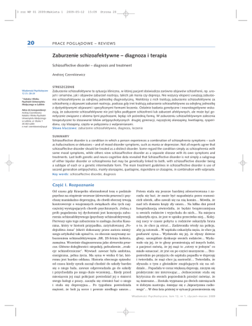 3 roz WP 01 2009:Makieta 1 20 2009-05-12 15:09 Strona 20 PRACE POGLĄDOWE – REVIEWS Zaburzenie schizoafektywne – diagnoza i terapia Schizoaffective disorder – diagnosis and treatment Andrzej Czernikiewicz Wiadomości Psychiatryczne 12 (1): 20–24 1 Katedra i Klinika Psychiatrii Uniwersytetu Medycznego w Lublinie Adres do korespondencji: Andrzej Czernikiewicz Katedra i Klinika Psychiatrii Uniwersytetu Medycznego w Lublinie, ul. Głuska 1 20-442 Lublin e-mail: [email protected] STRESZCZENIE Zaburzenie schizoafektywne to sytuacja kliniczna, w której pacjent doświadcza zarówno objawów schizofrenii, np. urojeń i omamów, jak i objawów zaburzeń nastroju, takich jak mania czy depresja. Nie wszyscy eksperci uważają zaburzenie schizoafektywne za odrębną jednostkę diagnostyczną. Niektórzy z nich traktują zaburzenie schizoafektywne za schizofrenię z objawami zaburzeń nastroju, podczas gdy inni traktują zaburzenie schizoafektywne za odrębną jednostkę z dystynktywnymi objawami i specyficznymi formami leczenia. Ostatnie badania genetyczne i neurokognitywne wskazują, że zaburzenie schizoafektywne nie jest tylko podtypem schizofrenii lub zaburzeń afektywnych, ale może być genetycznie związane z obiema tymi psychozami, będąc ich pośrednią formą. W zaburzeniu schizoafektywnym zalecenia terapeutyczne to stosowanie leków antypsychotycznych drugiej generacji, najczęściej olanzapiny, kwetiapiny, rysperidonu, czy klozapiny, często w połączeniu z walproinianami. Słowa kluczowe: zaburzenie schizoafektywne, diagnoza, leczenie SUMMARY Schizoaffective disorder is a condition in which a person experiences a combination of schizophrenia symptoms – such as hallucinations or delusions – and of mood disorder symptoms, such as mania or depression. Not all experts agree that schizoaffective disorder should be treated as a distinct disorder. Some regard the condition simply as schizophrenia with some mood symptoms, while others view schizoaffective disorder as a separate disease with its own symptoms and treatments. Last both genetic and neuro-cognitive data revealed that Schizoaffective disorder is not simply a subgroup of either bipolar disorder or schizophrenia but may be genetically linked to both, with schizoaffective disorder being a subtype of each or a genetic intermediate form. The main treatment guidelines in schizoaffective disorder is use of second generation antipsychotics, mainly olanzapine, quetiapine, risperidone or clozapine, in combination with valproate. Key words: schizoaffective disorder, diagnosis Część I. Rozpoznanie Od czasu gdy Kraepelin sformułował tezę o podziale psychoz na otępienie wczesne (dementia praecox ) i psychozę maniakalno-depresyjną, do chwili obecnej trwają kontrowersje o wzajemnych związkach obu tych najczęściej występujących chorób psychicznych. Jedną z prób pogodzenia tej dychotomii jest koncepcja zaburzenia schizoafektywnego (psychozy schizoafektywnej). Pierwszy opis tego zaburzenia to zasługa Jacoba Kasanina, który w historii przypadku, zatytułowanej „Podejrzliwa żona” (skrót dokonany przez autora niniejszego artykułu) tak opisał to, co obecnie nazywamy zaburzeniem schizoafektywnym „SR, 25-letnia kobieta, zamężna. Wcześnie diagnozowana jako dementia praecox. Główne dolegliwości: niepokój, pobudzenie, „reakcje schizofreniczne”. Wywiad: zawsze była ambitna, energiczna, pełna życia. Ma syna w wieku 6 lat, któremu jest bardzo oddana. Historia obecnego epizodu: od czasu kiedy synek zaczął chodzić do szkoły bardzo się o niego bała, zawsze odprowadzała go do szkoły i przychodziła po niego dużo wcześniej... Kiedy przed miesiącem jej mąż policjant powiedział jej o śmierci swego kolegi z pracy, zaczęła się również bać o niego i stała się depresyjna... Po tygodniu powiedziała mężowi, że boli ją serce i pewnie niedługo umrze... Potem stała się jeszcze bardziej zdenerwowana i zaczęła się bać, że może być napadnięta przez roznosicieli ulotek, albo zawali się na nią komin... Mówiła, że nad ich domem krąży zły omen... Na kilka dni przed hospitalizacją stwierdziła, że będzie bezpieczniejsza u swoich rodziców i wyjechała do nich... Na miejscu oskarżyła ojca, że jest w spisku przeciwko niej... Kolejnej nocy w czasie pobytu u rodziców oskarżyła brata o to, że chce ją otruć... Zadzwoniła wtedy na policję, aby ją ratowali... W szpitalu oskarżyła męża, że chce ją pozbawić syna... Wydawało się jej, że słyszy dziwne głosy, szczególnie dyskusje swoich rodziców... Wydawało się jej, że te głosy promieniują od innych ludzi, a pacjenci mówią, że jej mąż to „cztery w jednym” co miało oznaczać, że jest on po części murzynem ... Bezpośrednio po przyjęciu do szpitala popadła w depresję i twierdziła, że mąż chce ją zastrzelić... Twierdziła, że słyszała o tym z głośników znajdujących się na oddziale... Popadała w coraz większą depresję, niczym się praktycznie nie interesując... Jednocześnie stała się krytyczna do swoich poprzednich przeżyć mówiąc, że są śmieszne... Została wypisana po dwóch miesiącach w dobrym nastroju, śmiejąc się z „hipnotyzmu radiowego”... W dwa lata później w sytuacji przeniesienia się Wi a d o m o ś c i Ps y c h i a t r y c z n e , t o m 1 2 , n r 1 , s t y c z e ń – m a r z e c 2 0 0 9 3 roz WP 01 2009:Makieta 1 2009-05-12 15:09 Strona 21 PRACE POGLĄDOWE – REVIEWS do nowego domu znowu stała się depresyjna, nie mogła nic robić, straciła apetyt, nie mogła spać... O swoich poprzednich przeżyciach nie chciała rozmawiać” [1]. Opisując ten przypadek Kasanin stwierdził, że u tej samej osoby cierpiącej na zaburzenie schizoafektywne w celu potwierdzenia diagnozy należy stwierdzić zarówno symptomy zaburzeń myślenia czy halucynacji, jak i objawy zaburzeń nastroju w postaci depresji lub manii. Od początku koncepcji rozpoznawania zaburze