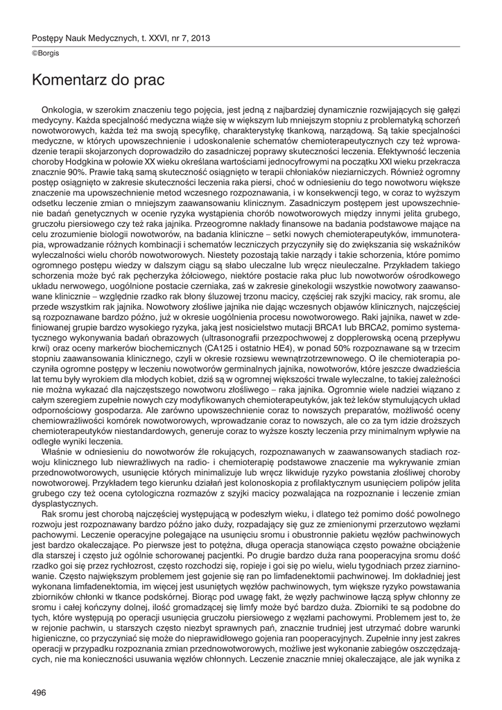 Postępy Nauk Medycznych, t. XXVI, nr 7, 2013 ©Borgis Komentarz do prac Onkologia, w szerokim znaczeniu tego pojęcia, jest jedną z najbardziej dynamicznie rozwijających się gałęzi medycyny. Każda specjalność medyczna wiąże się w większym lub mniejszym stopniu z problematyką schorzeń nowotworowych, każda też ma swoją specyfikę, charakterystykę tkankową, narządową. Są takie specjalności medyczne, w których upowszechnienie i udoskonalenie schematów chemioterapeutycznych czy też wprowadzenie terapii skojarzonych doprowadziło do zasadniczej poprawy skuteczności leczenia. Efektywność leczenia choroby Hodgkina w połowie XX wieku określana wartościami jednocyfrowymi na początku XXI wieku przekracza znacznie 90%. Prawie taką samą skuteczność osiągnięto w terapii chłoniaków nieziarniczych. Również ogromny postęp osiągnięto w zakresie skuteczności leczenia raka piersi, choć w odniesieniu do tego nowotworu większe znaczenie ma upowszechnienie metod wczesnego rozpoznawania, i w konsekwencji tego, w coraz to wyższym odsetku leczenie zmian o mniejszym zaawansowaniu klinicznym. Zasadniczym postępem jest upowszechnienie badań genetycznych w ocenie ryzyka wystąpienia chorób nowotworowych między innymi jelita grubego, gruczołu piersiowego czy też raka jajnika. Przeogromne nakłady finansowe na badania podstawowe mające na celu zrozumienie biologii nowotworów, na badania kliniczne – setki nowych chemioterapeutyków, immunoterapia, wprowadzanie różnych kombinacji i schematów leczniczych przyczyniły się do zwiększania się wskaźników wyleczalności wielu chorób nowotworowych. Niestety pozostają takie narządy i takie schorzenia, które pomimo ogromnego postępu wiedzy w dalszym ciągu są słabo uleczalne lub wręcz nieuleczalne. Przykładem takiego schorzenia może być rak pęcherzyka żółciowego, niektóre postacie raka płuc lub nowotworów ośrodkowego układu nerwowego, uogólnione postacie czerniaka, zaś w zakresie ginekologii wszystkie nowotwory zaawansowane klinicznie – względnie rzadko rak błony śluzowej trzonu macicy, częściej rak szyjki macicy, rak sromu, ale przede wszystkim rak jajnika. Nowotwory złośliwe jajnika nie dając wczesnych objawów klinicznych, najczęściej są rozpoznawane bardzo późno, już w okresie uogólnienia procesu nowotworowego. Raki jajnika, nawet w zdefiniowanej grupie bardzo wysokiego ryzyka, jaką jest nosicielstwo mutacji BRCA1 lub BRCA2, pomimo systematycznego wykonywania badań obrazowych (ultrasonografii przezpochwowej z dopplerowską oceną przepływu krwi) oraz oceny markerów biochemicznych (CA125 i ostatnio HE4), w ponad 50% rozpoznawane są w trzecim stopniu zaawansowania klinicznego, czyli w okresie rozsiewu wewnątrzotrzewnowego. O ile chemioterapia poczyniła ogromne postępy w leczeniu nowotworów germinalnych jajnika, nowotworów, które jeszcze dwadzieścia lat temu były wyrokiem dla młodych kobiet, dziś są w ogromnej większości trwale wyleczalne, to takiej zależności nie można wykazać dla najczęstszego nowotworu złośliwego – raka jajnika. Ogromnie wiele nadziei wiązano z całym szeregiem zupełnie nowych czy modyfikowanych chemioterapeutyków, jak też leków stymulujących układ odpornościowy gospodarza. Ale zarówno upowszechnienie coraz to nowszych preparatów, możliwość oceny chemiowrażliwości komórek nowotworowych, wprowadzanie coraz to nowszych, ale co za tym idzie droższych chemioterapeutyków niestandardowych, generuje coraz to wyższe koszty leczenia przy minimalnym wpływie na odległe wyniki leczenia. Właśnie w odniesieniu do nowotworów źle rokujących, rozpoznawanych w zaawansowanych stadiach rozwoju klinicznego lub niewrażliwych na radio- i chemioterapię podstawowe znaczenie ma wykrywanie zmian przednowotworowych, usunięcie których minimalizuje lub wręcz likwiduje ryzyko powstania złośliwej choroby nowotworowej. Przykładem tego kierunku działań jest kolonoskopia z profilaktycznym usunięciem polipów jelita grubego czy też ocena cytologiczna rozmazów z szyjki macicy pozwalająca na rozpoznanie i leczenie zmian dysplastycznych. Rak sromu jest chorobą najczęściej występującą w podeszłym wieku, i dlatego też pomimo dość powolnego rozwoju jest rozpoznawany bardzo późno jako duży, rozpadający się guz ze zmienionymi przerzutowo węzłami pachowymi. Leczenie operacyjne polegające na usunięciu sromu i obustronnie pakietu węzłów pachwinowych jest bardzo okaleczające. Po pierwsze jest to potężna, długa operacja stanowiąca często poważne obciążenie dla starszej i często już ogólnie schorowanej pacjentki. Po drugie bardzo duża rana pooperacyjna sromu dość rzadko goi się przez rychłozrost, często rozchodzi się, ropieje i goi się po wielu, wielu tygodniach przez ziarninowanie. Często największym problemem jest gojenie się ran po limfadenektomii pachwinowej. Im dokładniej jest wykonana limfadenektomia, im więcej jest usuniętych węzłów pachwinowych, tym większe ryzyko powstawania zbiorników chłonki w tkance podskórnej. Biorąc pod uwagę fakt, że węzły pachwinowe łączą spływ chłonny ze sromu i całej kończyny dolnej, ilość gromadzącej się limfy może być bardzo duża. Zbiorniki te są podobne do tych, które występują po operacji usunięcia gruczołu piersiowego z węzłami pachowymi. Problemem jest to, że w rejonie pachwin, u starszych często niezbyt sprawnych pań, znacznie trudniej jest utrzymać dobre warunki higieniczne, co przyczyniać się może do nieprawidłowego gojenia ran pooperacyjnych. Zupełnie inny jest zakres operacji w przypadku rozpoznania zmian przednowotworowych, możliwe jest wykonanie zabiegów oszczędzających, nie ma konieczności usuwania węzłów chłonnych. Leczenie znacznie mniej okaleczające, ale jak wynika z 496 analizy materiału z Ośrodka Bytomskiego w pełni skuteczne. Pomimo tego, że większość raków sromu poprzedzona 