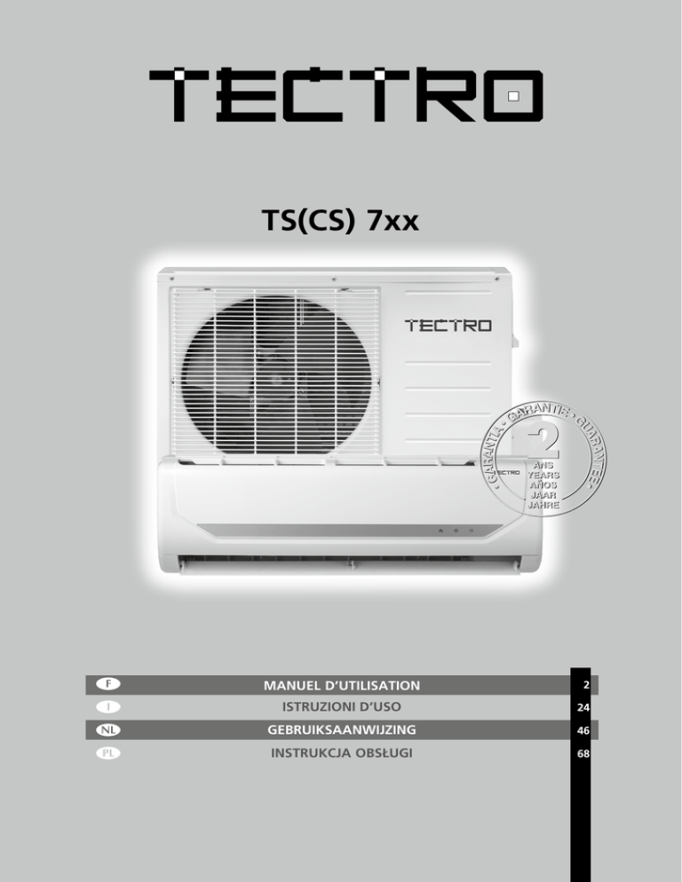 TS(CS) 7xx 3 MANUEL D’UTILISATION 2 > ISTRUZIONI D’USO 24 1 GEBRUIKSAANWIJZING 46 : INSTRUKCJA OBSŁUGI 68 Madame, Monsieur, Toutes nos félicitations pour l’achat de votre climatiseur Tectro. Vous venez d’acquérir un produit de qualité dont vous pourrez profiter pendant de longues années, à condition de l’utiliser de façon adéquate. Pour assurer une durée de vie optimale à votre climatiseur, nous vous invitons à lire d’abord ce manuel d’installation. Vous bénéficiez de 2 ans de garantie sur le matériel et les défaults de fabrication. Nous vous souhaitons de bien profiter de votre climatiseur. Cordiales salutations, PVG Holding b.v. Service Clients 1. LISEZ LES INSTRUCTIONS AVANT LA PREMIÈRE UTILISATION. 2. EN CAS DE DOUTE, DEMANDEZ CONSEIL À VOTRE DISTRIBUTEUR. 3 2 SOMMAIRE A. CONSIGNES DE SÉCURITÉ B. DÉSIGNATION DES PIÈCES C. TEMPÉRATURE DE FONCTIONNEMENT D. UTILISATION AVEC TÉLÉCOMMANDE E. UTILISATION OPTIMALE F. RÉGLER L’ORIENTATION DU FLUX D’AIR G. FONCTIONNEMENT DU CLIMATISEUR H. ENTRETIEN I. CONSEILS D’UTILISATION J. RÉSOUDRE LES PANNES K. CONDITIONS DE GARANTIE L. SPECIFICATIONS TECHNIQUES LISEZ CE MANUEL Ce manuel vous propose de nombreux conseils pour utiliser et entretenir correctement votre climatiseur. Vous trouverez les réponses aux problèmes les plus fréquents dans le chapitre ‘Résoudre les pannes’. En cas de problème, consultez d’abord le chapitre J “ Résoudre les pannes ”. Il vous évitera d’appeler inutilement le service de réparation. 3 3 A CONSIGNES DE SECURITE Installez cet appareil uniquement s’il est conforme à la législation, aux ordonnances et aux normes locales et nationales. Ce produit a été conçu pour être utilisé comme climatiseur dans des maisons résidentielles, et il doit être utilisé uniquement dans des endroits secs, dans des conditions domestiques normales et en intérieur, dans un séjour, une cuisine ou un garage. Cet appareil est conçu uniquement pour une prise de courant avec mise à la terre, avec une tension de raccordement de 230 V~ / 50 Hz. IMPORTANT • L’appareil DOIT être branché sur une prise reliée à la terre. Si la prise électrique n’est pas reliée à la terre, ne branchez pas l’appareil. La prise doit toujours rester facile d’accès une fois que l’appareil est branché. Lisez et respectez soigneusement ces instructions. • Ce climatiseur contient un réfrigérant et peut être classé comme équipement pressurisé. A ce titre, il est obligatoire de faire installer et entretenir son appareil par un professionnel agréé. Le climatiseur doit être inspecté et entretenu par un professionnel agréé une fois par an. La garantie ne couvre pas les dégâts causés par une utilisation ne respectant pas le mode d’emploi, ou suite à des négligences. Avant de brancher l’appareil, vérifiez si: • La tension de raccordement est bien la même que celle indiquée sur la plaque signalétique de l’appa-reil, •La prise et l’approvisionnement en courant sont bien adaptés à l’appareil, • La fiche électrique rentre bien dans la prise de contact, • L’appareil est bien posé sur une surface plane et stable. Si vous avez des doutes sur la compatibilité de l’appareil, 3 4 faites vérifier l’installation électrique par un professionnel. • Cet appareil est fabriqué selon les normes de sécurité CE. Soyez cependant prudent lors de son utilisation, comme avec tout autre appareil électrique. • Ne bouchez jamais l’entrée et la sortie d’air. • Ne mettez jamais l’appareil en contact avec des produits chimiques. • Ne vaporisez jamais d’eau sur l’appareil. Ne le trempez jamais dans l’eau. Mettre l’unité hors tension et débrancher l’alimentation électrique si de l’eau pénètre dans l’unité intérieure. • N’enfilez pas les doigts ou un objet dans les ouvertures de l’appareil. • Ne branchez jamais l’appareil sur une rallonge électrique. Si vous ne disposez pas de prise de courant avec mise à la terre, faites assurer l’installation par un électricien agréé. • Toute réparation et/ou maintenance doit être exclusivement effectuée par un technicien agréé ou votre distributeur. Pour l’utilisation et l’entretien de l’appareil, prière de suivre les instructions indiquées dans le manuel. • Toujours couper l’alimentation lorsque l’appareil est inutilisé. • Si le câble d’alimentation est endommagé, il doit être remplacé par le fabricant, son service après vente ou des personnes de qualification similaire afin d’éviter un danger. • Pour allumer ou éteindre l’appareil, utilisez le bouton marche/arrêt sur le climatiseur ou sur la télécommande. Ne tirez pas sur la prise électrique pour l’éteindre. • N’ouvrez pas le climatiseur lorsqu’il est en marche. Coupez l’alimentation électrique avant d’ouvrir l’appareil. • Débranchez toujours la fiche de la prise, ou coupez l’alimentation électrique lors du nettoyage du climatiseur ou lors de son entretien. • Ne placez jamais de brûleur à gaz, fours, cuisinières sur la trajectoire du flux d’air. 3 5 • Si vous avez les mains mouillées, n’appuyez pas sur les boutons de l’appareil et ne le manipulez pas. • Notez que l’unité extérieure émet un bruit de fonctionnement. L’utilisateur a la responsabilité de vérifier si l’appareil est en parfaite conformité avec la législation locale. • Cet appareil n’est pas conçu pour des utilisateurs (y compris les enfants) qui présentent un handicap moteur, mental ou sensoriel, ou qui manquent d’expérience et de connaissances, sauf s’ils sont surveillés par une personne responsable de leur sécurité. • Surveillez les enfants présents, ils ne doivent en aucun cas jouer avec l’appareil. • Il est recommandé de ne pas rester dans la trajectoire du flux d’air. • Ne buvez jamais l’eau de condensation du climatiseur. • N’apporter 