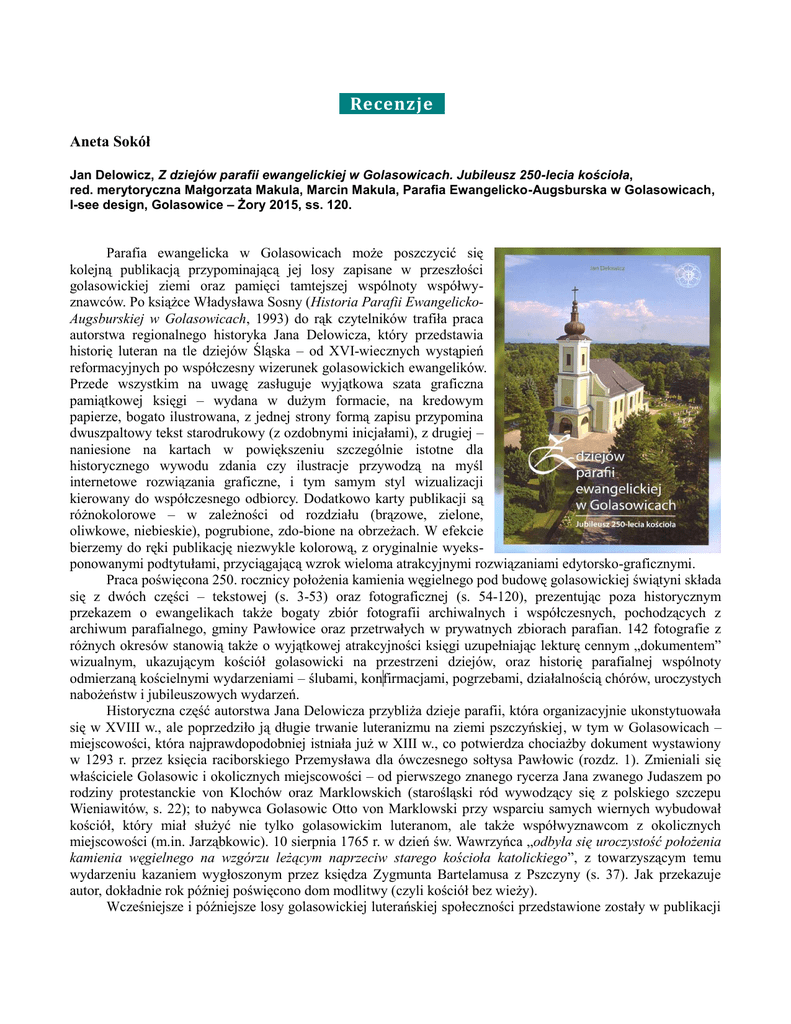 Recenzje _ Aneta Sokół Jan Delowicz, Z dziejów parafii ewangelickiej w Golasowicach. Jubileusz 250-lecia kościoła, red. merytoryczna Małgorzata Makula, Marcin Makula, Parafia Ewangelicko-Augsburska w Golasowicach, I-see design, Golasowice – Żory 2015, ss. 120. Parafia ewangelicka w Golasowicach może poszczycić się kolejną publikacją przypominającą jej losy zapisane w przeszłości golasowickiej ziemi oraz pamięci tamtejszej wspólnoty współwyznawców. Po książce Władysława Sosny (Historia Parafii EwangelickoAugsburskiej w Golasowicach, 1993) do rąk czytelników trafiła praca autorstwa regionalnego historyka Jana Delowicza, który przedstawia historię luteran na tle dziejów Śląska – od XVI-wiecznych wystąpień reformacyjnych po współczesny wizerunek golasowickich ewangelików. Przede wszystkim na uwagę zasługuje wyjątkowa szata graficzna pamiątkowej księgi – wydana w dużym formacie, na kredowym papierze, bogato ilustrowana, z jednej strony formą zapisu przypomina dwuszpaltowy tekst starodrukowy (z ozdobnymi inicjałami), z drugiej – naniesione na kartach w powiększeniu szczególnie istotne dla historycznego wywodu zdania czy ilustracje przywodzą na myśl internetowe rozwiązania graficzne, i tym samym styl wizualizacji kierowany do współczesnego odbiorcy. Dodatkowo karty publikacji są różnokolorowe – w zależności od rozdziału (brązowe, zielone, oliwkowe, niebieskie), pogrubione, zdo-bione na obrzeżach. W efekcie bierzemy do ręki publikację niezwykle kolorową, z oryginalnie wyeksponowanymi podtytułami, przyciągającą wzrok wieloma atrakcyjnymi rozwiązaniami edytorsko-graficznymi. Praca poświęcona 250. rocznicy położenia kamienia węgielnego pod budowę golasowickiej świątyni składa się z dwóch części – tekstowej (s. 3-53) oraz fotograficznej (s. 54-120), prezentując poza historycznym przekazem o ewangelikach także bogaty zbiór fotografii archiwalnych i współczesnych, pochodzących z archiwum parafialnego, gminy Pawłowice oraz przetrwałych w prywatnych zbiorach parafian. 142 fotografie z różnych okresów stanowią także o wyjątkowej atrakcyjności księgi uzupełniając lekturę cennym „dokumentem” wizualnym, ukazującym kościół golasowicki na przestrzeni dziejów, oraz historię parafialnej wspólnoty odmierzaną kościelnymi wydarzeniami – ślubami, konfirmacjami, pogrzebami, działalnością chórów, uroczystych nabożeństw i jubileuszowych wydarzeń. Historyczna część autorstwa Jana Delowicza przybliża dzieje parafii, która organizacyjnie ukonstytuowała się w XVIII w., ale poprzedziło ją długie trwanie luteranizmu na ziemi pszczyńskiej, w tym w Golasowicach – miejscowości, która najprawdopodobniej istniała już w XIII w., co potwierdza chociażby dokument wystawiony w 1293 r. przez księcia raciborskiego Przemysława dla ówczesnego sołtysa Pawłowic (rozdz. 1). Zmieniali się właściciele Golasowic i okolicznych miejscowości – od pierwszego znanego rycerza Jana zwanego Judaszem po rodziny protestanckie von Klochów oraz Marklowskich (starośląski ród wywodzący się z polskiego szczepu Wieniawitów, s. 22); to nabywca Golasowic Otto von Marklowski przy wsparciu samych wiernych wybudował kościół, który miał służyć nie tylko golasowickim luteranom, ale także współwyznawcom z okolicznych miejscowości (m.in. Jarząbkowic). 10 sierpnia 1765 r. w dzień św. Wawrzyńca „odbyła się uroczystość położenia kamienia węgielnego na wzgórzu leżącym naprzeciw starego kościoła katolickiego”, z towarzyszącym temu wydarzeniu kazaniem wygłoszonym przez księdza Zygmunta Bartelamusa z Pszczyny (s. 37). Jak przekazuje autor, dokładnie rok później poświęcono dom modlitwy (czyli kościół bez wieży). Wcześniejsze i późniejsze losy golasowickiej luterańskiej społeczności przedstawione zostały w publikacji w czterech kolejnych rozdziałach: „Czasy reformacji, kontrreformacji i wojny trzydziestoletniej”, „Pod panowaniem Prus”, „Między wojnami”, „Okupacja niemiecka i lata powojenne” oraz ostatnim – odtwarzającym dzieje samej parafii powstałej po przyłączeniu Śląska do protestanckich Prus gwarantujących opiekę państwa nad wyznawcami ewangelicyzmu, z uprzywilejowaniem wszak w sprawach religijnych języka niemieckiego („Parafia ewangelicko-augsburska w Golaswowicach”). Należy przy tym podkreślić, że przedstawiony rys historyczny wprowadza czytelnika w ogólne tło wystąpień reformacyjnych – przybliża zarówno klimat działalności samego Lutra, jak też śląską recepcję haseł Reformatora z Wittembergii, a w jeszcze węższej soczewce – rozwój luteranizmu pszczyńskiego. Na tym szerokim tle Jan Delowicz umiejscawia golasowicką wspólnotę skupioną z czasem (od 1765 r.) w oficjalnych strukturach parafialnych. Jak czytamy: „W 1590 r. protestanci zajmowali na Górnym Śląsku już ponad 1500 kościołów parafialnych. W tym samym czasie było tylko 400 parafii katolickich. Tam, gdzie nowe wyznanie znalazło podatny grunt, przetrwało oficjalnie do cesarskiego edyktu zakazującego publicznego praktykowania protestanckiego z jesieni 1628 r.” (s. 120), oraz: „luteranizm zapanował w Pszczyńskim Wolnym państwie Stanowym. Tam ewangeliccy kaznodzieje działali już, zawierzając starym kronikom, od 1523 r., ale rozkwit nowego wyznania zaobserwowano dopiero od połowy stulecia. Hrabia Karol von Promnitz – gorliwy ewangelik – zatwierdził zaistniałe zmiany kościelne w 1568 r. (…)” (s. 12). Kreśląc dalsze losy zwolenników nowego wyznania autor przedstawia działalność kontrreformacyjną podjętą w cesarstwie habsburskim; zaznacza, że już z końcem XVI w. rozpoczęła się przymusowa rekatolizacja: „zmuszano do przechodzenia na katolicyzm również śląskich protestantów. Zachęcano ich do tego bez pardonu przy pomocy cesarskich dragonów pod dowództwem Karla von Lichentsteina” (s.