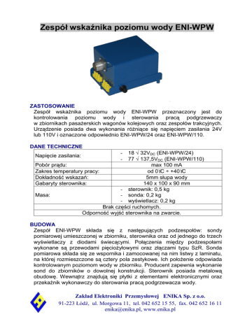 Zespół wskaźnika poziomu wody ENI-WPW ZASTOSOWANIE Zespół wskaźnika poziomu wody ENI-WPW przeznaczony jest do kontrolowania poziomu wody i sterowania pracą podgrzewaczy w zbiornikach pasaŜerskich wagonów kolejowych oraz zespołów trakcyjnych. Urządzenie posiada dwa wykonania róŜniące się napięciem zasilania 24V lub 110V i oznaczone odpowiednio ENI-WPW/24 oraz ENI-WPW/110. DANE TECHNICZNE 18 ÷ 32VDC (ENI-WPW/24) 77 ÷ 137,5VDC (ENI-WPW/110) Pobór prądu: max 100 mA Zakres temperatury pracy: od 0°C ÷ +40°C Dokładność wskazań: 5mm słupa wody Gabaryty sterownika: 140 x 100 x 90 mm - sterownik: 0,5 kg Masa: - sonda: 0,2 kg - wyświetlacz: 0,2 kg Brak części ruchomych. Odporność wyjść sterownika na zwarcie. Napięcie zasilania: - BUDOWA Zespół ENI-WPW składa się z następujących podzespołów: sondy pomiarowej umieszczonej w zbiorniku, sterownika oraz od jednego do trzech wyświetlaczy z diodami świecącymi. Połączenia między podzespołami wykonane są przewodami pięcioŜyłowymi oraz złączami typu SzR. Sonda pomiarowa składa się ze wspornika i zamocowanej na nim listwy z laminatu, na której rozmieszczone są cztery pola zestykowe. Ich połoŜenie odpowiada kontrolowanym poziomom wody w zbiorniku. Producent zapewnia wykonanie sond do zbiorników o dowolnej konstrukcji. Sterownik posiada metalową obudowę. Wewnątrz znajdują się płytki z elementami elektronicznymi oraz przekaźnik wykonawczy do sterowania pracą podgrzewacza wody. Zakład Elektroniki Przemysłowej ENIKA Sp. z o.o. 91-223 Łódź, ul. Morgowa 11, tel. 042 652 15 55, fax. 042 652 16 11 [email protected], www.enika.pl Wyświetlacz poziomu wody zawiera układ elektroniczny sterujący czterema diodami świecącymi umieszczonymi na płycie czołowej wyświetlacza. Informują one o poziomie wody w zbiorniku. Wyświetlacz przeznaczony do umieszczania wewnątrz wagonu posiada obudowę z tworzywa sztucznego, natomiast wyświetlacz mocowany w poszyciu wagonu ma obudowę z blachy stalowej i jest całkowicie odporny na wpływy atmosferyczne. OPIS DZIAŁANIA Do pomiaru wody wykorzystywane jest przewodnictwo elektryczne. Do pół zestykowych na powierzchni sondy doprowadzone jest ze sterownika napięcie przemienne w.cz. separowane galwanicznie od napięcia pokładowego 24V. Zwarcie przez wodę kaŜdego z pół zestykowych wykrywane jest przez jeden z komparatorów znajdujących się w sterowniku. Otrzymana w ten sposób informacja o poziomie wody analizowana jest przez układ elektroniczny sterownika i przesyłana do wyświetlacza. Osiągnięcie danego poziomu wody (np. 1/2) sygnalizowane jest świeceniem odpowiedniej diody. W przypadku, gdy poziom wody jest niŜszy od 1/4 zbiornika dioda umieszczona przy napisie "1/4" będzie świeciła impulsowo. Odczytanie poziomu wody na wyświetlaczu jest moŜliwe po wciśnięciu przycisku znajdującego się obok wyświetlacza.. Wyświetlacz pokazuje wynik pomiaru przez około 12 sekund od chwili wciśnięcia przycisku, po czym następuje samoczynne wygaszenie wyświetlacza. Poza optycznym przedstawieniem poziomu wody w zbiorniku urządzenie pełni dodatkową funkcję: przy poziomie wody niŜszym niŜ 1/4 otwiera styki przekaźnika R15 znajdujące się w sterowniku. Przekaźnik ten moŜe sterować pracą grzałek podgrzewających wodę w zbiorniku. róŜne wykonania sond pomiarowych wyświetlacz wewnętrzny wyświetlacz zewnętrzny Zakład Elektroniki Przemysłowej ENIKA Sp. z o.o. 91-223 Łódź, ul. Morgowa 11, tel. 042 652 15 55, fax. 042 652 16 11 [email protected], www.enika.pl