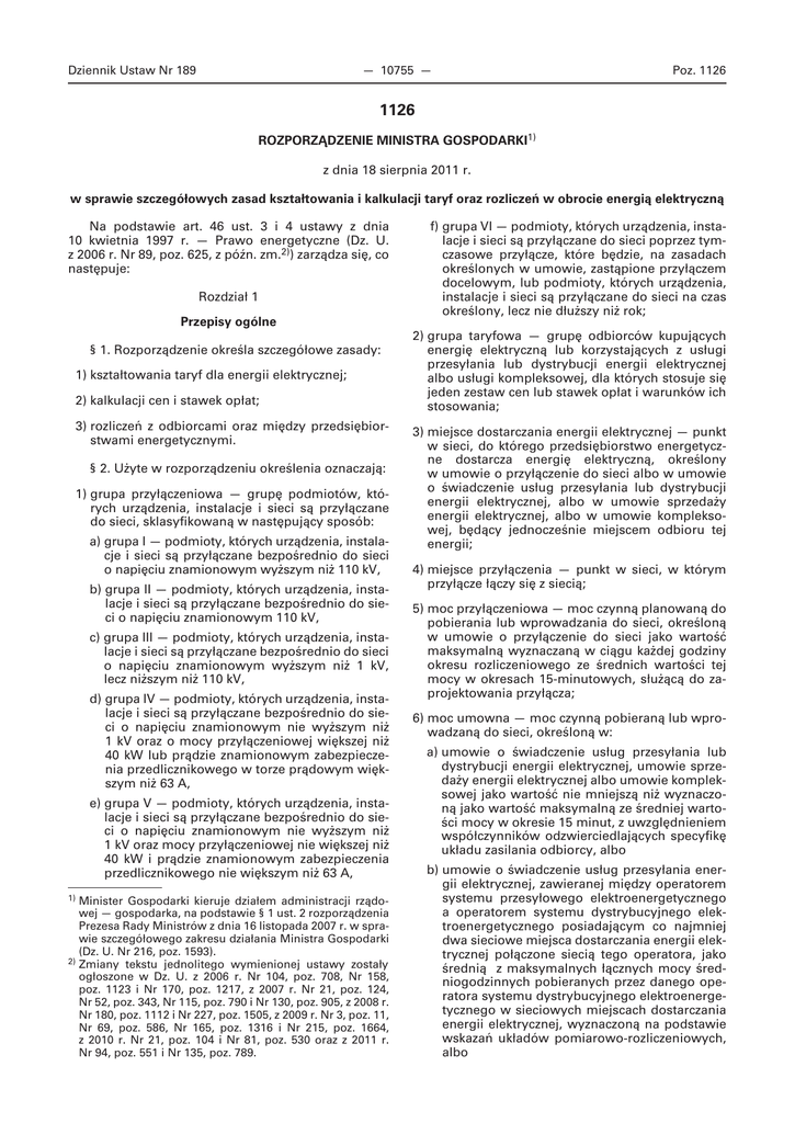 Dziennik Ustaw Nr 189 — 10755 — Poz. 1126 1126 ROZPORZĄDZENIE MINISTRA GOSPODARKI1) z dnia 18 sierpnia 2011 r. w sprawie szczegółowych zasad kształtowania i kalkulacji taryf oraz rozliczeń w obrocie energią elektryczną Na podstawie art. 46 ust. 3 i 4 ustawy z dnia 10 kwietnia 1997 r. — Prawo energetyczne (Dz. U. z 2006 r. Nr 89, poz. 625, z późn. zm.2)) zarządza się, co następuje: Rozdział 1 Przepisy ogólne § 1. Rozporządzenie określa szczegółowe zasady: 1) kształtowania taryf dla energii elektrycznej; 2) kalkulacji cen i stawek opłat; 3) rozliczeń z odbiorcami oraz między przedsiębiorstwami energetycznymi. § 2. Użyte w rozporządzeniu określenia oznaczają: 1) grupa przyłączeniowa — grupę podmiotów, których urządzenia, instalacje i sieci są przyłączane do sieci, sklasyfikowaną w następujący sposób: a) grupa I — podmioty, których urządzenia, instalacje i sieci są przyłączane bezpośrednio do sieci o napięciu znamionowym wyższym niż 110 kV, b) grupa II — podmioty, których urządzenia, instalacje i sieci są przyłączane bezpośrednio do sieci o napięciu znamionowym 110 kV, c) grupa III — podmioty, których urządzenia, instalacje i sieci są przyłączane bezpośrednio do sieci o napięciu znamionowym wyższym niż 1 kV, lecz niższym niż 110 kV, d) grupa IV — podmioty, których urządzenia, instalacje i sieci są przyłączane bezpośrednio do sieci o napięciu znamionowym nie wyższym niż 1 kV oraz o mocy przyłączeniowej większej niż 40 kW lub prądzie znamionowym zabezpieczenia przedlicznikowego w torze prądowym większym niż 63 A, e) grupa V — podmioty, których urządzenia, instalacje i sieci są przyłączane bezpośrednio do sieci o napięciu znamionowym nie wyższym niż 1 kV oraz mocy przyłączeniowej nie większej niż 40 kW i prądzie znamionowym zabezpieczenia przedlicznikowego nie większym niż 63 A, 1) Minister Gospodarki kieruje działem administracji rządowej — gospodarka, na podstawie § 1 ust. 2 rozporządzenia Prezesa Rady Ministrów z dnia 16 listopada 2007 r. w sprawie szczegółowego zakresu działania Ministra Gospodarki (Dz. U. Nr 216, poz. 1593). 2) Zmiany tekstu jednolitego wymienionej ustawy zostały ogłoszone w Dz. U. z 2006 r. Nr 104, poz. 708, Nr 158, poz. 1123 i Nr 170, poz. 1217, z 2007 r. Nr 21, poz. 124, Nr 52, poz. 343, Nr 115, poz. 790 i Nr 130, poz. 905, z 2008 r. Nr 180, poz. 1112 i Nr 227, poz. 1505, z 2009 r. Nr 3, poz. 11, Nr 69, poz. 586, Nr 165, poz. 1316 i Nr 215, poz. 1664, z 2010 r. Nr 21, poz. 104 i Nr 81, poz. 530 oraz z 2011 r. Nr 94, poz. 551 i Nr 135, poz. 789. f) grupa VI — podmioty, których urządzenia, instalacje i sieci są przyłączane do sieci poprzez tymczasowe przyłącze, które będzie, na zasadach określonych w umowie, zastąpione przyłączem docelowym, lub podmioty, których urządzenia, instalacje i sieci są przyłączane do sieci na czas określony, lecz nie dłuższy niż rok; 2) grupa taryfowa — grupę odbiorców kupujących energię elektryczną lub korzystających z usługi przesyłania lub dystrybucji energii elektrycznej albo usługi kompleksowej, dla których stosuje się jeden zestaw cen lub stawek opłat i warunków ich stosowania; 3) miejsce dostarczania energii elektrycznej — punkt w sieci, do którego przedsiębiorstwo energetyczne dostarcza energię elektryczną, określony w umowie o przyłączenie do sieci albo w umowie o świadczenie usług przesyłania lub dystrybucji energii elektrycznej, albo w umowie sprzedaży energii elektrycznej, albo w umowie kompleksowej, będący jednocześnie miejscem odbioru tej energii; 4) miejsce przyłączenia — punkt w sieci, w którym przyłącze łączy się z siecią; 5) moc przyłączeniowa — moc czynną planowaną do pobierania lub wprowadzania do sieci, określoną w umowie o przyłączenie do sieci jako wartość maksymalną wyznaczaną w ciągu każdej godziny okresu rozliczeniowego ze średnich wartości tej mocy w okresach 15-minutowych, służącą do zaprojektowania przyłącza; 6) moc umowna — moc czynną pobieraną lub wprowadzaną do sieci, określoną w: a) umowie o świadczenie usług przesyłania lub dystrybucji energii elektrycznej, umowie sprzedaży energii elektrycznej albo umowie kompleksowej jako wartość nie mniejszą niż wyznaczoną jako wartość maksymalną ze średniej wartości mocy w okresie 15 minut, z uwzględnieniem współczynników odzwierciedlających specyfikę układu zasilania odbiorcy, albo b) umowie o świadczenie usług przesyłania energii elektrycznej, zawieranej między operatorem systemu przesyłowego elektroenergetycznego a operatorem systemu dystrybucyjnego elektroenergetycznego posiadającym co najmniej dwa sieciowe miejsca dostarczania energii elektrycznej połączone siecią tego operatora, jako średnią z maksymalnych łącznych mocy średniogodzinnych pobieranych przez danego operatora systemu dystrybucyjnego elektroenergetycznego w sieciowych miejscach dostarczania energii elektrycznej, wyznaczoną na podstawie wskazań układów pomiarowo-rozliczeniowych, albo Dziennik Ustaw Nr 189 — 10756 — c) umowie o świadczenie usług dystrybucji energii elektrycznej, zawieranej między operatorami systemu dystrybucyjnego elektroenergetycznego posiadającymi co najmniej dwa sieciowe miejsca dostarczania energii elektrycznej połączone siecią tego operatora, jako średnią z maksymalnych łącznych mocy średniogodzinnych pobieranych w miejscach połączeń sieci operatorów systemów dystrybucyjnych, wyznaczoną na podstawie wskazań układów pomiarowo-rozliczeniowych; 7) okres regulacji — okres, na jaki zostały ustalone wartości współczynników korekcyjnych, o których mowa w § 21; 8) przyłącze — odcinek lub element sieci służący do połączenia urządzeń, instalacji lub sieci podmiotu, o wymaganej przez niego mocy przyłączeniowej, z pozostałą częścią sieci przedsiębiorstwa energetycznego świadczącego