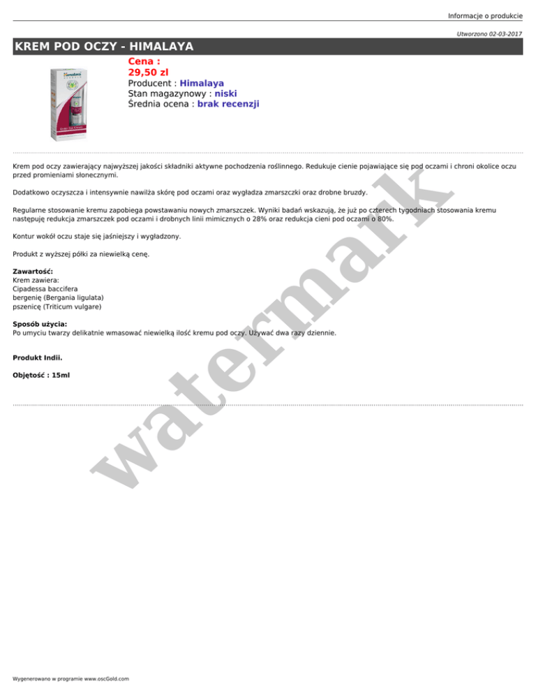 Informacje o produkcie Utworzono 02-03-2017 KREM POD OCZY - HIMALAYA Cena : 29,50 zl Producent : Himalaya Stan magazynowy : niski Średnia ocena : brak recenzji Krem pod oczy zawierający najwyższej jakości składniki aktywne pochodzenia roślinnego. Redukuje cienie pojawiające się pod oczami i chroni okolice oczu przed promieniami słonecznymi. er m ar k Dodatkowo oczyszcza i intensywnie nawilża skórę pod oczami oraz wygładza zmarszczki oraz drobne bruzdy. Regularne stosowanie kremu zapobiega powstawaniu nowych zmarszczek. Wyniki badań wskazują, że już po czterech tygodniach stosowania kremu następuję redukcja zmarszczek pod oczami i drobnych linii mimicznych o 28% oraz redukcja cieni pod oczami o 80%. Kontur wokół oczu staje się jaśniejszy i wygładzony. Produkt z wyższej półki za niewielką cenę. Zawartość: Krem zawiera: Cipadessa baccifera bergenię (Bergania ligulata) pszenicę (Triticum vulgare) Sposób użycia: Po umyciu twarzy delikatnie wmasować niewielką ilość kremu pod oczy. Używać dwa razy dziennie. Produkt Indii. w at Objętość : 15ml Wygenerowano w programie www.oscGold.com