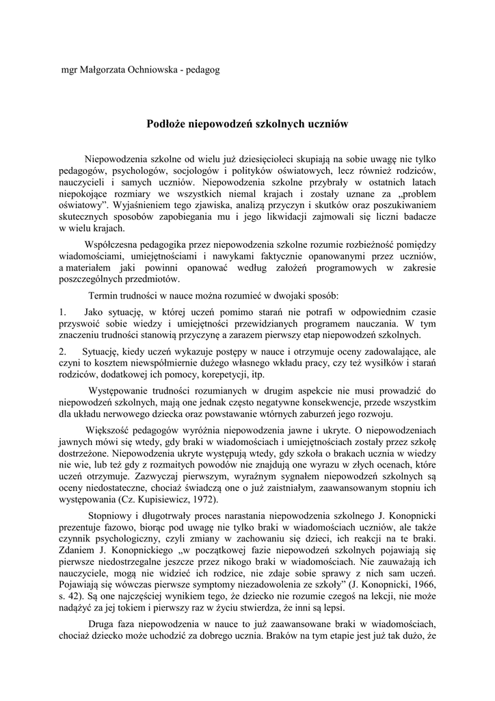 mgr Małgorzata Ochniowska - pedagog Podłoże niepowodzeń szkolnych uczniów Niepowodzenia szkolne od wielu już dziesięcioleci skupiają na sobie uwagę nie tylko pedagogów, psychologów, socjologów i polityków oświatowych, lecz również rodziców, nauczycieli i samych uczniów. Niepowodzenia szkolne przybrały w ostatnich latach niepokojące rozmiary we wszystkich niemal krajach i zostały uznane za „problem oświatowy”. Wyjaśnieniem tego zjawiska, analizą przyczyn i skutków oraz poszukiwaniem skutecznych sposobów zapobiegania mu i jego likwidacji zajmowali się liczni badacze w wielu krajach. Współczesna pedagogika przez niepowodzenia szkolne rozumie rozbieżność pomiędzy wiadomościami, umiejętnościami i nawykami faktycznie opanowanymi przez uczniów, a materiałem jaki powinni opanować według założeń programowych w zakresie poszczególnych przedmiotów. Termin trudności w nauce można rozumieć w dwojaki sposób: 1. Jako sytuację, w której uczeń pomimo starań nie potrafi w odpowiednim czasie przyswoić sobie wiedzy i umiejętności przewidzianych programem nauczania. W tym znaczeniu trudności stanowią przyczynę a zarazem pierwszy etap niepowodzeń szkolnych. 2. Sytuację, kiedy uczeń wykazuje postępy w nauce i otrzymuje oceny zadowalające, ale czyni to kosztem niewspółmiernie dużego własnego wkładu pracy, czy też wysiłków i starań rodziców, dodatkowej ich pomocy, korepetycji, itp. Występowanie trudności rozumianych w drugim aspekcie nie musi prowadzić do niepowodzeń szkolnych, mają one jednak często negatywne konsekwencje, przede wszystkim dla układu nerwowego dziecka oraz powstawanie wtórnych zaburzeń jego rozwoju. Większość pedagogów wyróżnia niepowodzenia jawne i ukryte. O niepowodzeniach jawnych mówi się wtedy, gdy braki w wiadomościach i umiejętnościach zostały przez szkołę dostrzeżone. Niepowodzenia ukryte występują wtedy, gdy szkoła o brakach ucznia w wiedzy nie wie, lub też gdy z rozmaitych powodów nie znajdują one wyrazu w złych ocenach, które uczeń otrzymuje. Zazwyczaj pierwszym, wyraźnym sygnałem niepowodzeń szkolnych są oceny niedostateczne, chociaż świadczą one o już zaistniałym, zaawansowanym stopniu ich występowania (Cz. Kupisiewicz, 1972). Stopniowy i długotrwały proces narastania niepowodzenia szkolnego J. Konopnicki prezentuje fazowo, biorąc pod uwagę nie tylko braki w wiadomościach uczniów, ale także czynnik psychologiczny, czyli zmiany w zachowaniu się dzieci, ich reakcji na te braki. Zdaniem J. Konopnickiego „w początkowej fazie niepowodzeń szkolnych pojawiają się pierwsze niedostrzegalne jeszcze przez nikogo braki w wiadomościach. Nie zauważają ich nauczyciele, mogą nie widzieć ich rodzice, nie zdaje sobie sprawy z nich sam uczeń. Pojawiają się wówczas pierwsze symptomy niezadowolenia ze szkoły” (J. Konopnicki, 1966, s. 42). Są one najczęściej wynikiem tego, że dziecko nie rozumie czegoś na lekcji, nie może nadążyć za jej tokiem i pierwszy raz w życiu stwierdza, że inni są lepsi. Druga faza niepowodzenia w nauce to już zaawansowane braki w wiadomościach, chociaż dziecko może uchodzić za dobrego ucznia. Braków na tym etapie jest już tak dużo, że nawet przy najlepszej woli, dziecko nie może korzystać w normalny sposób z nauki szkolnej. Zaczyna więc uciekać się do różnych sposobów oszustwa, jak np. odpisywanie zadań domowych czy klasowych. Trzecia faza charakteryzuje się sporadycznym występowaniem ocen niedostatecznych. Na tym etapie rozwoju niepowodzenia w nauce, wszyscy dostrzegają, że z danym uczniem „nie jest najlepiej”. Jest to moment, w którym najczęściej rozpoczyna się walkę z niepowodzeniem szkolnym. Jeśli formy tej walki nie są właściwe, niepowodzenie pogłębia się i znowu pojawiają się pewne symptomy psychologiczne, tym razem bardziej już zaawansowane. Z punktu widzenia stosunku dziecka do otoczenia symptomy te są pozytywne i negatywne. Pozytywne są wówczas, gdy dziecko ujawnia na zewnątrz swoje konflikty wewnętrzne pewnymi formami walki. Natomiast negatywne będą wówczas, gdy dziecko w wyniku ustawicznych braków powodzenia w nauce wycofa się z aktywnego udziału w życiu klasy, zamknie się w sobie. Wyraża się to całkowitą niechęcią do szkoły, często graniczącą z nienawiścią, co nierzadko prowadzi do wagarowania. Czwarta faza niepowodzenia szkolnego to drugoroczność, a więc oficjalne stwierdzenie niepowodzenia ucznia w nauce. Pozostawienie ucznia w tej samej klasie często bywa początkiem jego wykolejenia się, a w każdym przypadku jest to wyraźne zachwianie równowagi życiowej dziecka. Niepowodzenia ucznia są więc wynikiem długofalowego procesu, którego początek jest trudno wykrywalny. Objawia się on spadkiem przystosowania szkolnego wychowanka wskutek narastania jego niewydolności szkolnej. Niepowodzenia w nauce oprócz aspektu obiektywnego mają również aspekt subiektywny. Dziecko swój brak sukcesów w nauce może w różny sposób oceniać i przeżywać. Nie zawsze też subiektywna ocena własnych osiągnięć jest adekwatna do stopni, które uczeń otrzymuje w szkole i może w niepełny sposób odzwierciedlać faktyczne rozmiary niepowodzeń szkolnych. Wielu badaczy zajmujących się ustaleniem przyczyn i trudności niepowodzeń szkolnych uważa, iż duży wpływ na nie ma zły stan zdrowia uczniów. Wszelkie zaburzenia somatyczne mają niekorzystny wpływ na układ nerwowy dziecka, jego ogólną wydolność umysłową i pracę szkolną. Długotrwałe zakłócenia w funkcjonowaniu całego organizmu dziecka, jak i zaburzenia w czynnościach poszczególnych układów i narządów wywierają ujemny wpływ na rozwój psychiczny dziecka. Również absencja chorobowa, wynikająca z częstych zachorowań, ma negatywny wpływ na postępy w nauce. Liczna grupa badaczy zwraca uwagę na nieprawidłowe właściwości rozwoju umysłowego i aktywności pozn