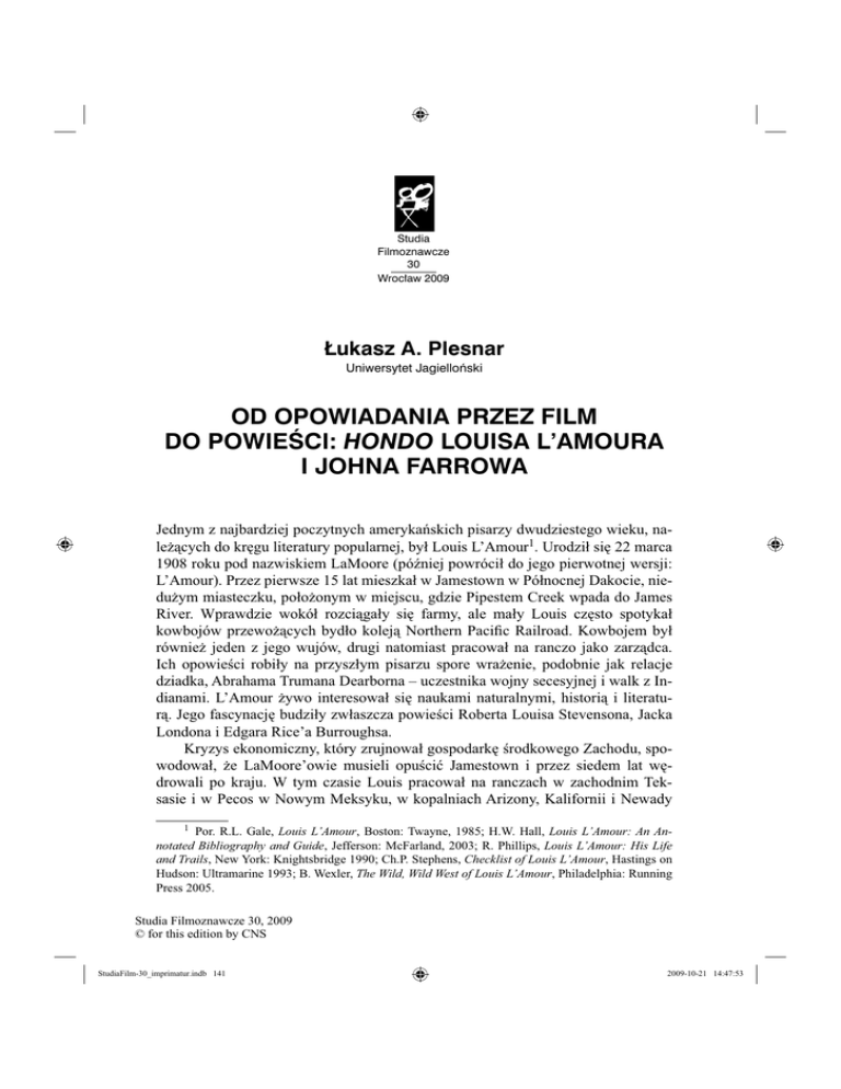 Studia Filmoznawcze 30 Wroc³aw 2009 £ukasz A. Plesnar Uniwersytet Jagielloñski OD OPOWIADANIA PRZEZ FILM DO POWIEŒCI: HONDO LOUISA L’AMOURA I JOHNA FARROWA Jednym z najbardziej poczytnych amerykańskich pisarzy dwudziestego wieku, należących do kręgu literatury popularnej, był Louis L’Amour1. Urodził się 22 marca 1908 roku pod nazwiskiem LaMoore (później powrócił do jego pierwotnej wersji: L’Amour). Przez pierwsze 15 lat mieszkał w Jamestown w Północnej Dakocie, niedużym miasteczku, położonym w miejscu, gdzie Pipestem Creek wpada do James River. Wprawdzie wokół rozciągały się farmy, ale mały Louis często spotykał kowbojów przewożących bydło koleją Northern Pacific Railroad. Kowbojem był również jeden z jego wujów, drugi natomiast pracował na ranczo jako zarządca. Ich opowieści robiły na przyszłym pisarzu spore wrażenie, podobnie jak relacje dziadka, Abrahama Trumana Dearborna – uczestnika wojny secesyjnej i walk z Indianami. L’Amour żywo interesował się naukami naturalnymi, historią i literaturą. Jego fascynację budziły zwłaszcza powieści Roberta Louisa Stevensona, Jacka Londona i Edgara Rice’a Burroughsa. Kryzys ekonomiczny, który zrujnował gospodarkę środkowego Zachodu, spowodował, że LaMoore’owie musieli opuścić Jamestown i przez siedem lat wędrowali po kraju. W tym czasie Louis pracował na ranczach w zachodnim Teksasie i w Pecos w Nowym Meksyku, w kopalniach Arizony, Kalifornii i Newady 1 Por. R.L. Gale, Louis L’Amour, Boston: Twayne, 1985; H.W. Hall, Louis L’Amour: An Annotated Bibliography and Guide, Jefferson: McFarland, 2003; R. Phillips, Louis L’Amour: His Life and Trails, New York: Knightsbridge 1990; Ch.P. Stephens, Checklist of Louis L’Amour, Hastings on Hudson: Ultramarine 1993; B. Wexler, The Wild, Wild West of Louis L’Amour, Philadelphia: Running Press 2005. Studia Filmoznawcze 30, 2009 © for this edition by CNS StudiaFilm-30_imprimatur.indb 141 2009-10-21 14:47:53 142 | £ukasz A. Plesnar oraz w tartakach i składach drewna w Oregonie i Waszyngtonie. To właśnie wtedy spotkał wiele osób, które później stały się prototypami jego literackich bohaterów: Billa Tilghmana – byłego szeryfa w Dodge City, Chrisa Madsena – stróża prawa i sierżanta w 5. Pułku Kawalerii Stanów Zjednoczonych, Emmetta Daltona ze słynnego gangu braci Daltonów, Toma Picketta – uczestnika krwawego konfliktu między ranczerami w Nowym Meksyku w latach 1877–1878, nazwanego później wojną w okręgu Lincoln, Toma Threepersona – konnego policjanta na Północnym Zachodzie i Strażnika Teksasu, Jima Robertsa – szeryfa w Jerome, George’a Coe’a i Deluvina Maxwella – znajomych Billy’ego Kida – najsłynniejszego, obok braci Jamesów, bandyty na Dzikim Zachodzie oraz wielu innych2. Podróżując po Ameryce, L’Amour poznał miejsca i krajobrazy, w których toczyć się będzie akcja jego przyszłych utworów. Największym sentymentem darzył przy tym Arizonę i Nowy Meksyk, obszary piękne i dzikie, będące ojczyzną najbitniejszego ze szczepów indiańskich południowego Zachodu Stanów Zjednoczonych – Apaczów. Swoją przygodę z pisarstwem L’Amour rozpoczął od poezji. Pierwszy wiersz, The Chap Worth While, opublikował w 1926 roku w czasopiśmie „Jamestown Sun”. Pierwsze opowiadanie, Anything for Pal, zamieścił w 1935 roku w „True Gang Life”. Pierwsza książka, Smoke from This Altar (1939)3 była zbiorem wierszy i miała dobre recenzje. W 1950 roku ukazał się pierwszy western L’Amoura, Westward the Tide.4 Potem przyszły następne powieści o Dzikim Zachodzie: Kilkenny (1954)5, To Tame a Land (1955)6, Srebrny kanion (Silver Canyon – 1956)7, The First Fast Draw (1959)8, Kiowa Trail (1964), Down the Long Hills (1968), Under the Sweetwater Rim (1971), Where the Long Grass Blows (1976), Comstock Lode (1981), The Cherokee Trail (1982), The Haunted Mesa (1987) i wiele, wiele innych. Wśród krytyków największe uznanie zdobył 18-tomową sagą o fikcyjnej rodzinie Sackettów, którą rozpoczynał opublikowany w 1960 roku tom The Daybreakers, a kończyła wydana w 1985 roku powieść Jubal Sackett 9. L’Amour był autorem niezwykle płodnym i pracowitym; pisał każdego dnia, łącznie z niedzielami i świętami, zazwyczaj pięć stron. Za życia opublikował 101 książek: powieści, zbiorów opowiadań, zbiorów wierszy i esejów, o łącznym nakładzie ponad 225 milionów egzemplarzy. Był pierwszym pisarzem odznaczonym 2 Przez pewien czas L’Amour zarobkował również jako zawodowy bokser, sekundant i trener. Był też marynarzem; podczas rejsów odwiedził Anglię, Japonię, Chiny, Borneo, holenderskie Indie Wschodnie, Arabię, Egipt i Panamę. 3 Oklahoma City: Lusk Pub. 4 London: Corgi Books. 5 New York: Ace Books. 6 Robbinsdale: Fawcett. 7 New York: Avalon. Wydanie polskie – Szczecin: Przygoda, 1991. 8 Ta i następne wymienione powieści wydane w: New York: Bantam. 9 Obie powieści ukazały się również nakładem wydawnictwa Bantam. Studia Filmoznawcze 30, 2009 © for this edition by CNS StudiaFilm-30_imprimatur.indb 142 2009-10-21 14:47:54 Hondo Louisa L’Amoura i Johna Farrowa | 143 Złotym Medalem Kongresu, a w 1984 roku odebrał z rąk prezydenta Ronalda Raegana Medal Wolności. Zmarł 10 czerwca 1988 roku. L’Amour cieszył się nie tylko ogromną popularnością wśród czytelników, ale również producentów i scenarzystów filmowych. Na podstawie jego powieści i opowiadań zrealizowano 18 filmów kinowych, 10 filmów telewizyjnych i 2 seriale (rekord w tym względzie dzierży żyjący w latach 1872–1939 Zane Grey, którego utwory doczekały się 105 ekranizacji). Najgłośniejszą filmową adaptacją prozy L’Amoura był zapewne Hondo Johna Farrowa. W numerze „Collier’s Weekly” z lipca 1952 roku Louis L’Amour opublikował opowiadanie The Gift of Cochise. Jeszcze tego samego roku prawo do jego sfilmowania nabyli producent Robert Fell
