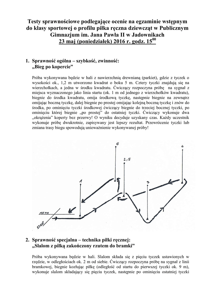 Testy sprawnościowe podlegające ocenie na egzaminie wstępnym do klasy sportowej o profilu piłka ręczna dziewcząt w Publicznym Gimnazjum im. Jana Pawła II w Jadownikach 23 maj (poniedziałek) 2016 r. godz. 1500 1. Sprawność ogólna – szybkość, zwinność: „Bieg po kopercie” Próba wykonywana będzie w hali z nawierzchnią drewnianą (parkiet), gdzie z tyczek o wysokości ok., 1,2 m utworzono kwadrat o boku 5 m. Cztery tyczki znajdują się na wierzchołkach, a jedna w środku kwadratu. Ćwiczący rozpoczyna próbę na sygnał z miejsca wyznaczonego jako linia startu (ok. 1 m od jednego z wierzchołków kwadratu), biegnie do środka kwadratu, omija środkową tyczkę, następnie biegnie na zewnątrz omijając boczną tyczkę, dalej biegnie po prostej omijając kolejną boczną tyczkę i znów do środka, po ominięciu tyczki środkowej ćwiczący biegnie do trzeciej bocznej tyczki, po ominięciu której biegnie „po prostej” do ostatniej tyczki. Ćwiczący wykonuje dwa „okrążenia” koperty bez przerwy! O wyniku decyduje uzyskany czas. Każdy uczestnik wykonuje próbę dwukrotnie, zapisywany jest lepszy rezultat. Przewrócenie tyczki lub zmiana trasy biegu spowodują unieważnienie wykonywanej próby! 2. Sprawność specjalna – technika piłki ręcznej: „Slalom z piłką zakończony rzutem do bramki” Próba wykonywana będzie w hali. Slalom składa się z pięciu tyczek ustawionych w rzędzie, w odległościach ok. 2 m od siebie. Ćwiczący rozpoczyna próbę na sygnał z linii bramkowej, biegnie kozłując piłkę (odległość od startu do pierwszej tyczki ok. 9 m), wykonuje slalom składający się pięciu tyczek, następnie po ominięciu ostatniej tyczki wraca z powrotem również wykonując slalom między tyczkami, po ominięciu tyczki znajdującej się najbliżej bramki oddaje celny rzut na bramkę o wymiarach 3 m / 2 m. Czas jest zatrzymywany w momencie, gdy piłka przekracza linię bramkową. Próba wykonywana będzie piłką ręczną nr 1. Niecelny rzut powoduje dodanie 10 sekund „karnych” do czasu w jakim uczestnik wykonał próbę. Przekroczenie linii pola bramkowego przed rzutem powoduje dodanie 5 sekund „karnych” do czasu końcowego. Przewrócenie tyczki lub pominięcie jej podczas wykonywania próby spowoduje dodanie 5 sekund „karnych” (za każdą tyczkę) do czasu końcowego próby. Próba będzie wykonywana dwukrotnie, zapisywany będzie lepszy rezultat. Wynikiem egzaminu sprawnościowego będzie suma czasów (lepszych) uzyskanych w obu próbach tzn. biegu po kopercie + slalomu z piłką! Przed przystąpieniem do egzaminów sprawnościowych każdy uczestnik winien wykonać niezbędne ćwiczenia rozgrzewające (we własnym zakresie)! Egzaminowanych obowiązuje strój sportowy i obuwie sportowe zmienne na jasnym spodzie!!! Decyzje Komisji Rekrutacyjnej są niepodważalne!!! Powodzenia !!! Komisja Rekrutacyjna