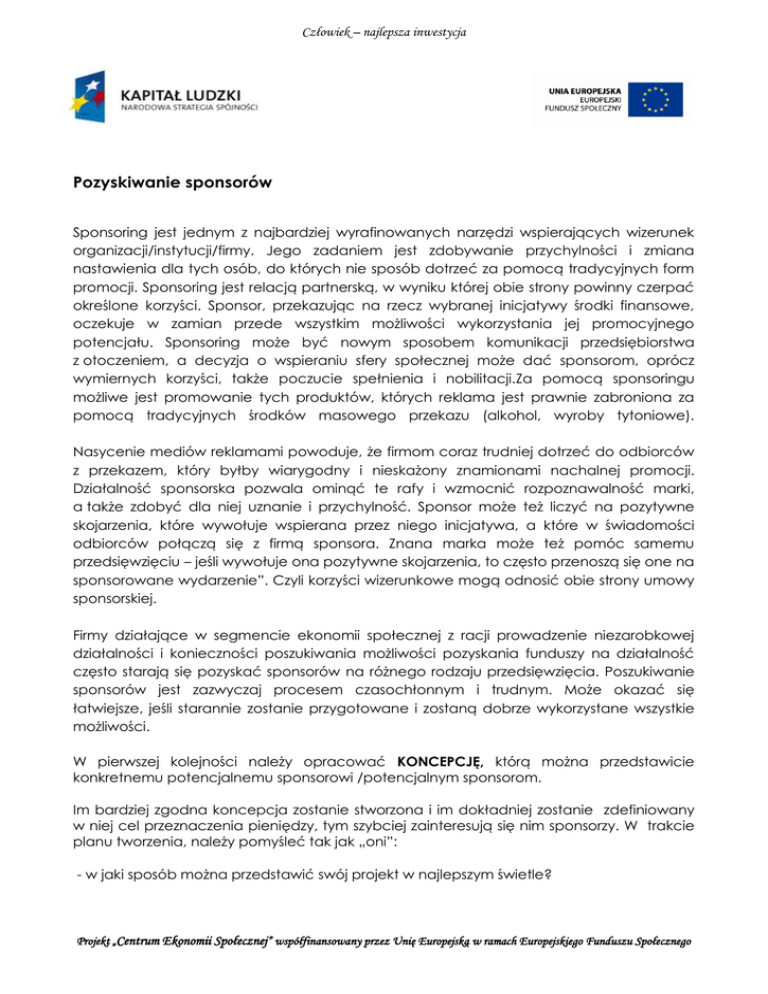 Człowiek – najlepsza inwestycja Pozyskiwanie sponsorów Sponsoring jest jednym z najbardziej wyrafinowanych narzędzi wspierających wizerunek organizacji/instytucji/firmy. Jego zadaniem jest zdobywanie przychylności i zmiana nastawienia dla tych osób, do których nie sposób dotrzeć za pomocą tradycyjnych form promocji. Sponsoring jest relacją partnerską, w wyniku której obie strony powinny czerpać określone korzyści. Sponsor, przekazując na rzecz wybranej inicjatywy środki finansowe, oczekuje w zamian przede wszystkim możliwości wykorzystania jej promocyjnego potencjału. Sponsoring może być nowym sposobem komunikacji przedsiębiorstwa z otoczeniem, a decyzja o wspieraniu sfery społecznej może dać sponsorom, oprócz wymiernych korzyści, także poczucie spełnienia i nobilitacji.Za pomocą sponsoringu możliwe jest promowanie tych produktów, których reklama jest prawnie zabroniona za pomocą tradycyjnych środków masowego przekazu (alkohol, wyroby tytoniowe). Nasycenie mediów reklamami powoduje, że firmom coraz trudniej dotrzeć do odbiorców z przekazem, który byłby wiarygodny i nieskażony znamionami nachalnej promocji. Działalność sponsorska pozwala ominąć te rafy i wzmocnić rozpoznawalność marki, a także zdobyć dla niej uznanie i przychylność. Sponsor może też liczyć na pozytywne skojarzenia, które wywołuje wspierana przez niego inicjatywa, a które w świadomości odbiorców połączą się z firmą sponsora. Znana marka może też pomóc samemu przedsięwzięciu – jeśli wywołuje ona pozytywne skojarzenia, to często przenoszą się one na sponsorowane wydarzenie”. Czyli korzyści wizerunkowe mogą odnosić obie strony umowy sponsorskiej. Firmy działające w segmencie ekonomii społecznej z racji prowadzenie niezarobkowej działalności i konieczności poszukiwania możliwości pozyskania funduszy na działalność często starają się pozyskać sponsorów na różnego rodzaju przedsięwzięcia. Poszukiwanie sponsorów jest zazwyczaj procesem czasochłonnym i trudnym. Może okazać się łatwiejsze, jeśli starannie zostanie przygotowane i zostaną dobrze wykorzystane wszystkie możliwości. W pierwszej kolejności należy opracować KONCEPCJĘ, którą można przedstawicie konkretnemu potencjalnemu sponsorowi /potencjalnym sponsorom. Im bardziej zgodna koncepcja zostanie stworzona i im dokładniej zostanie zdefiniowany w niej cel przeznaczenia pieniędzy, tym szybciej zainteresują się nim sponsorzy. W trakcie planu tworzenia, należy pomyśleć tak jak „oni”: - w jaki sposób można przedstawić swój projekt w najlepszym świetle? Projekt „Centrum Ekonomii Społecznej” współfinansowany przez Unię Europejską w ramach Europejskiego Funduszu Społecznego Człowiek – najlepsza inwestycja - jakie korzyści mógłby osiągnąć sponsor? Koncepcja powinna zawierać następujące treści: 1. Szkic projektu: pomysł, opis grupy docelowej, działanie PR, korzyści dla sponsora. 2. Terminy, obowiązki, ewentualnie osoby kontaktowe w Twojej organizacji 3. Co oferujemy, a czego chcemy w zamian? W szkicu projektu należy opisać czego dotyczy oferta sponsoringu ale w taki sposób, aby jego lektura nie była nużąca. Poza ogólnym opisem, ze szkicu powinno wynikać, czy szukasz jednego czy więcej sponsorów. Opis grupy docelowej powinien potencjalnym sponsorom wyjaśnić, że dzięki swemu udziałowi doskonale do niej przemówi, lub że dzięki swoim działaniom będzie w stanie pozyskać nowe grupy klientów. Opisz grupę docelową tak dokładnie, jak tylko się da tak, aby sponsor miał przed oczyma konkretny obraz. W planowaniu terminów nie chodzi o samo wydarzenie, lecz o rzetelne rozplanowanie towarzyszącym jemu prac. Sponsor może z niego wyczytać, na kiedy zaplanowane są np. akcje prasowe, kiedy i jakich mediach pojawią się zapowiedzi, gdzie i w jaki sposób będzie on mógł się zaprezentować na imprezie, o której godzinie odbędzie się konferencja prasowa i kto jest dla niego osobą kontaktową. W punkcie usługi sponsora i twoje usługi w zamian za sponsorowanie należy jeszcze raz dokładnie określić korzyść, którą będzie miał sponsor dzięki swojemu wsparciu w twój projekt. W przypadku, gdy chcesz pozyskać większą ilość sponsorów (sponsor główny oraz mniejsi sponsorzy),wymień wszystkie poszczególne usługi. Warto zaprezentować indywidualną listę usług oraz korzyści z nich wynikających dla konkretnego sponsora. Wówczas sponsor będzie miał większe pole do popisu, a tym samym wzrośnie prawdopodobieństwo, uzyskania wsparcia. Ważne jest, aby w liście usług oraz korzyści dokładnie wszystko obliczyć, gdyż zmiana kalkulacji po przyjęciu projektu w większości przypadków nie jest możliwa. Lista potencjalnych sponsorów może nie mieć końca, gdyż musimy się liczyć z wieloma odmowami. Lista powinna zawierać około stu adresów. Żelazna zasada powiada, że musisz dopytać się 40 razy, aby otrzymać akceptację. Przeprowadź poszukiwania w Internecie, skorzystaj z żółtych Stron, zbuduj jak największą siatkę kontaktów, aby dojść do adresów potencjalnych sponsorów. Pierwszy kontakt ze sponsorami z reguły nawiązujemy TELEFONICZNIE, aby się upewnić, czy są wstępnie zainteresowani udziałem w projekcie. Następnie wysyłamy listem poleconym nasz koncept sponsorowania i dzwonimy ponownie, o ile adresat sam się do nas nie odezwie. Gdy mamy osobisty kontakt z pracownikiem jakiejś firmy, nie wahajmy się go wykorzystać! Projekt „Centrum Ekonomii Społecznej” współfinansowany przez Unię Europejską w ramach Europejskiego Funduszu Społecznego Człowiek – najlepsza inwestycja Na SPOTKANIE ze sponsorem, która będzie wynikiem wysłanej oferty, należy się starannie przygotować, gdyż „chemia“ panująca podczas spotkania może zadecydować o udziale sponsora w twoim przedsięwzięciu. Rozmowa ze sponsorem ma podobny charakter, jak podczas spr