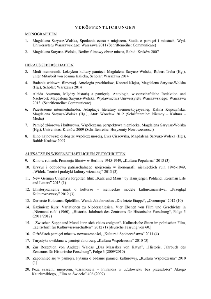 VERÖFFENTLICHUNGEN MONOGRAPHIEN 1. Magdalena Saryusz-Wolska, Spotkania czasu z miejscem. Studia o pamięci i miastach, Wyd. Uniwersytetu Warszawskiego: Warszawa 2011 (Schriftenreihe: Communicare) 2. Magdalena Saryusz-Wolska, Berlin: filmowy obraz miasta, Rabid: Kraków 2007 HERAUSGEBERSCHAFTEN 3. Modi memorandi. Leksykon kultury pamięci, Magdalena Saryusz-Wolska, Robert Traba (Hg.), unter Mitarbeit von Joanna Kalicka, Scholar: Warszawa 2014 4. Badanie widowni filmowej. Antologia przekładów, Konrad Klejsa, Magdalena Saryusz-Wolska (Hg.), Scholar: Warszawa 2014 5. Aleida Assmann, Między historią a pamięcią. Antologia, wissenschaftliche Redaktion und Nachwort: Magdalena Saryusz-Wolska, Wydawnictwa Uniwersytetu Warszawskiego: Warszawa 2013 (Schriftenreihe: Communicare) 6. Przestrzenie intermedialności. Adaptacje literatury niemieckojęzycznej, Kalina Kupczyńska, Magdalena Saryusz-Wolska (Hg.), Atut: Wrocław 2012 (Schriftenreihe: Niemcy – Kultura – Media) 7. Pamięć zbiorowa i kulturowa. Współczesna perspektywa niemiecka, Magdalena Saryusz-Wolska (Hg.), Universitas: Kraków 2009 (Schriftenreihe: Horyzonty Nowoczesności) 8. Kino najnowsze: dialog ze współczesnością, Ewa Ciszewska, Magdalena Saryusz-Wolska (Hg.), Rabid: Kraków 2007 AUFSÄTZE IN WISSENSCHAFTLICHEN ZEITSCHRIFTEN 9. Kino w ruinach. Promocja filmów w Berlinie 1945-1949, „Kultura Popularna” 2013 (3). 10. Kryzys i odbudowa patriarchalnego spojrzenia w ikonografii niemieckich ruin 1945-1949, „Widok. Teorie i praktyki kultury wizualnej” 2013 (3). 11. New German Cinema’s forgotten film: „Katz und Maus” by Hansjürgen Pohland, „German Life and Letters” 2013 (1) 12. Uhistorycznienie nauk o kulturze Kulturoznawczy” 2012 (3) – niemieckie modele kulturoznawstwa, „Przegląd 13. Der erste Holocaust-Spielfilm. Wanda Jakubowskas „Die letzte Etappe“, „Osteuropa“ 2012 (10) 14. Kazimierz Kutz’ Variationen zu Niederschlesien. Vier Ebenen von Film und Geschichte in „Niemand ruft“ (1960), „Historie. Jahrbuch des Zentrums für Historische Forschung“, Folge 5 (2011/2012) 15. „Zwischen Suppe und Mund kann sich vieles ereignen“. Kulinarische Sitten im polnischen Film, „Zeitschrift für Kulturwissenschaften“ 2012 (1) [deutsche Fassung von 60.] 16. O źródłach pamięci miast w nowoczesności, „Kultura i Społeczeństwo” 2011 (4) 17. Turystyka uwikłana w pamięć zbiorową, „Kultura Współczesna” 2010 (3) 18. Zur Rezeption von Andrzej Wajdas „Das Massaker von Katyn”, „Historie. Jahrbuch des Zentrums für Historische Forschung”, Folge 3 (2009/2010) 19. Zapomnieć się w pamięci. Pytania o badanie pamięci kulturowej, „Kultura Współczesna” 2010 (1) 20. Poza czasem, miejscem, tożsamością – Finlandia w „Człowieku bez przeszłości” Akiego Kaurismäkiego, „Film na Świecie” 406 (2009) 21. Jak politycy mówią o równouprawnieniu płci. Debata nad projektem ustawy o równym statusie kobiet i mężczyzn, „Kultura i Społeczeństwo” 2008 (3) 22. Filmowe obrazy pamięci – perspektywa teoretyczna, „Kultura Współczesna” 2006 (4) 23. Ostalgia, „Tygiel kultury” 2005 (7-9) 24. Filmowy obraz Berlina, „Tygiel kultury” 2005 (7-9) 25. Obszary nieobecności. Filmowa przestrzeń Berlina, „Kwadratura Koła. Ogólnopolski rocznik kół naukowych”, Katowice 2005 26. Berlin wczoraj i dziś. Reprezentacje filmowe, „Kultura Współczesna” 2004 (1) 27. „Triumf woli” Leni Riefenstahl – dokument i propaganda, „Ha.art“, Dezember 2001 [Abdruck von 68.] AUFSÄTZE IN SAMMELBÄNDEN 28. Wprowadzenie, in: Modi memorandi. Leksykon kultury pamięci, Magdalena Saryusz-Wolska, Robert Traba (Hg.), unter Mitarbeit von Joanna Kalicka, Scholar: Warszawa 2014 (zusammen mit Robert Traba) 29. Badanie widowni filmowej: historia i metody, in: Badanie widowni filmowej. Antologia przekładów, Konrad Klejsa, Magdalena Saryusz-Wolska (Hg.), Scholar: Warszawa 2014 (zusammen mit Konrad Klejsa) 30. Posłowie. Teorie pamięci Aleidy Assmann, in: Między historią a pamięcią. Antologia, Magdalena Saryusz-Wolska, (Hg.), Wyd. Uniwersytetu Warszawskiego: Warszawa 2013. 31. Prasa o „Katyniu” Andrzeja Wajdy, in: Polskie piśmiennictwo filmowe, Piotr Zwierzchowski, Barbara Giza (Hg.), Academia, Wyd. UKW: Warszawa, Bydgoszcz 2013 [ergänzte, polnische Fassung von 18.] 32. Trwałe obrazy, nietrwali bohaterowie. „Ostatni etap” (1948) Wandy Jakubowskiej, in: Gefilte film IV. Wątki żydowskie w kinie, Joanna Preizner (Hg.), Austeria: Kraków 2013 [ergänzte Fassung von 43.] 33. „Katyń” – niemiecka recepcja filmu Andrzeja Wajdy, in: Kino polskie i niemieckie między kulturami, Andrzej Dębski, Andrzej Gwóźdź (red), Atut: Wrocław 2013 [polnische Fassung von 18.] 34. Starke Frauen und schwache Männer oder die Paradoxien der Rollenverteilung, in: Der polnische Film. Von seinen Anfängen bis zur Gegenwart, Konrad Klejsa, Schamma Schahadat, Margarethe Wach, (Hg.), Schüren Verlag: Marburg 2012 35. Niemieckojęzyczne obsesje intermedialności: wprowadzenie, in: Przestrzenie intermedialności. Adaptacje literatury niemieckojęzycznej, Kalina Kupczyńska, Magdalena Saryusz-Wolska (Hg.), Atut: Wrocław 2012 (zusammen mit Kalina Kupczyńska) 36. Sensacja polityczna i nuda filmowa. Adaptacja „Kota i myszy” w reżyserii Hansjürgena Pohlanda, in: Przestrzenie intermedialności. Adaptacje literatury niemieckojęzycznej, Kalina Kupczyńska, Magdalena Saryusz-Wolska (Hg.), Atut: Wrocław 2012 [polnische Fassung von 11.] 37. W ruinach i w odbudowie – kinematografia polska i niemiecka w latach 1945-1949, in: Polacy i Niemcy. Filmowe granice i sąsiedztwa, Konrad Klejsa (Hg.), Atut: Wrocław 2012 38. Wolfgang Staudte. Sumienie ponad podziałami, in: Autorzy kina europejskiego VI, Alicja Helman, Andrzej Pitrus (Hg.), Rabid / Fundacja „Kino”: Warszawa 2012 39. An- und abwesend. Weiblichkeitsmodelle in der deutschen und polnischen Kultur, in: Deutschpolnische Eri