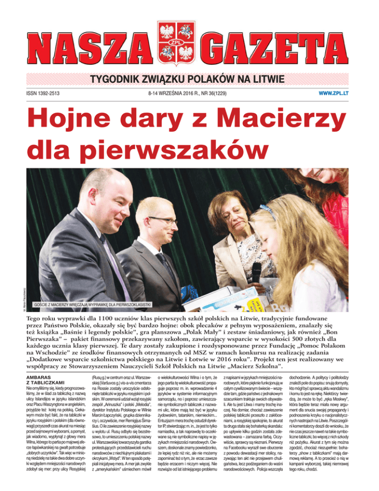 TYGODNIK ZWIĄZKU POLAKÓW NA LITWIE ISSN 1392-2513 8-14 WRZEŚNIA 2016 R., NR 36(1229) WWW.ZPL.LT fot. Marian Paluszkiewicz Hojne dary z Macierzy dla pierwszaków GOŚCIE Z MACIERZY WRĘCZAJĄ WYPRAWKĘ DLA PIERWSZOKLASISTKI Tego roku wyprawki dla 1100 uczniów klas pierwszych szkół polskich na Litwie, tradycyjnie fundowane przez Państwo Polskie, okazały się być bardzo hojne: obok plecaków z pełnym wyposażeniem, znalazły się też książka „Baśnie i legendy polskie”, gra planszowa „Polak Mały” i zestaw śniadaniowy, jak również „Bon Pierwszaka” – pakiet finansowy przekazywany szkołom, zawierający wsparcie w wysokości 500 złotych dla każdego ucznia klasy pierwszej. Te dary zostały zakupione i rozdysponowane przez Fundację „Pomoc Polakom na Wschodzie” ze środków finansowych otrzymanych od MSZ w ramach konkursu na realizację zadania „Dodatkowe wsparcie szkolnictwa polskiego na Litwie i Łotwie w 2016 roku”. Projekt ten jest realizowany we współpracy ze Stowarzyszeniem Nauczycieli Szkół Polskich na Litwie „Macierz Szkolna”. AMBARAS Z TABLICZKAMI Nie omyliliśmy się, kiedy prognozowaliśmy, że w ślad za tabliczką z nazwą ulicy Islandijos w języku islandzkim oraz Placu Waszyngtona w angielskim, przyjdzie też kolej na polską. Ciekawym może być fakt, że na tabliczki w języku rosyjskim i polskim (dla równowagi) przyszedł czas akurat na miesiąc przed sejmowymi wyborami, a pomysł, jak wiadomo, wypłynął z głowy mera Wilna, którego to partia po majowej aferze łapówkarskiej na gwałt potrzebuje „dobrych uczynków”. Tak więc w minioną niedzielę na takie dwa dobre uczynki względem mniejszości narodowych zdobył się mer: przy ulicy Rosyjskiej (Rusų g.) w centrum oraz ul. Warszawskiej (Varšuvos g.) vis-a-vis cmentarza na Rossie zostały uroczyście odsłonięte tabliczki w języku rosyjskim i polskim. W ceremonii udział wziął rosyjski zespół „Arinuszka” i polski „Melodia”, dyrektor Instytutu Polskiego w Wilnie Marcin Łapczyński, grupka dziennikarzy i, oczywiście, mer Remigijus Šimašius. O ile zawieszenie rosyjskiej nazwy u wylotu ul. Rusų odbyło się bezstresowo, to umieszczeniu polskiej nazwy ul. Warszawskiej towarzyszyła garstka protestujących przedstawicieli ruchu narodowców z niechlujnymi plakatami i okrzykami „Wstyd”. W ten sposób potępiali inicjatywę mera. A mer jak zwykle z „amerykańskim” uśmiechem mówił o wielokulturowości Wilna i o tym, że jego partia tę wielokulturowość propaguje poprzez m. in. wprowadzenie 4 języków w systemie informacyjnym samorządu, no i poprzez umieszczanie symbolicznych tabliczek z nazwami ulic, które mają też być w języku żydowskim, tatarskim, niemieckim... Entuzjazm mera trochę ostudził dyrektor IP, stwierdzając m. in., że jest to tylko namiastka, a tak naprawdę to oczekiwane są nie symboliczne napisy w językach mniejszości narodowych. Owszem, doskonale znamy powiedzonko, że lepiej rydz niż nic, ale nie możemy zapominać też o tym, że erzac zawsze będzie erzacem i niczym więcej. Nie rozwiąże od lat istniejącego problemu z napisami w językach mniejszości narodowych, które pięknie funkcjonują w całym cywilizowanym świecie – wszędzie tam, gdzie państwo z jednakowym szacunkiem traktuje swoich obywateli. Ale tu jest Litwa i mamy trochę inaczej. Na domiar, chociaż zawieszenie polskiej tabliczki przeszło z zakłóceniami, a rosyjskiej spokojnie, to akurat ta druga stała się bohaterką skandalu: po upływie kilku godzin została zdewastowana – zamazana farbą. Oczywiście, sprawcy są nieznani. Pierwszy na Facebooku wyraził swe oburzenie z powodu dewastacji mer stolicy, nazywając ten akt nie przejawem chuligaństwa, lecz podżeganiem do waśni narodowościowych. Policja wszczęła dochodzenie. A politycy i politolodzy znaleźli pole do popisu: snują domysły, kto mógł być sprawcą aktu wandalizmu i komu to jest na rękę. Niektórzy twierdzą, że może to być „ręka Moskwy”, która będzie teraz miała nowy argument dla snucia swojej propagandy i podnoszenia krzyku o nacjonalistycznych nastrojach na Litwie. Poszczególni komentatorzy doszli do wniosku, że nie czas jeszcze nawet na takie symboliczne tabliczki, bo więcej z nich szkody niż pożytku. Akurat z tym się można zgodzić, chociaż niezupełnie: bohaterzy „show z tabliczkami” mają darmową reklamę. A to przecież o nią w kampanii wyborczej, takiej niemrawej tego roku, chodzi. 2 8-14 Września 2016 r., nr 36(1229) www.zpl.lt Hojne dary z Macierzy dla pierwszaków 3 września w Domu Polskim w Wilnie oraz w Solecznikach odbyło się uroczyste przekazanie wyprawek szkolnych i „Bonu Pierwszaka” przez przedstawicieli MSZ Rzeczypospolitej Polskiej oraz Fundacji „Pomoc Polakom na Wschodzie” dla pierwszoklasistów szkół polskich na Litwie. Zebranych na sali Domu Polskiego w Wilnie przedstawicieli szkół polskich z Wilna i rejonu wileńskiego oraz wysokich gości z Macierzy: wiceministra spraw zagranicznych RP Jana Dziedziczaka, dyrektora Departamentu Współpracy z Polonią i Polakami za Granicą Mateusza Stąsieka, asystenta ministra spraw zagranicznych Jana Wadowskiego, a także ambasadora RP w Republice Litewskiej Jarosława Czubińskiego, konsula generalnego Stanisława Cygnarowskiego, prezesa Fundacji „Pomoc Polakom na Wschodzie” Mikołaja Falkowskiego i wiceprezes Ewę Ziółkowską wraz z pracownikami Fundacji witał prezes Stowarzyszenia Nauczycieli Szkół Polskich na Litwie „Macierz Szkolna” Józef Kwiatkowski. Zagajając uroczystość prezes odnotował, że pomimo niżu demograficznego i emigracji, liczba uczniów w szkołach polskich się ustabilizowała, a pierwszoklasistów tego roku się zwiększyła. Formuła nauczania wszystkich przedmiotów w języku ojczystym się sprawdziła i dziś szkoła z polskim językiem nauczania ma swoje godne miejsce w systemie oświaty Litwy. O tym świadczą wyniki pr