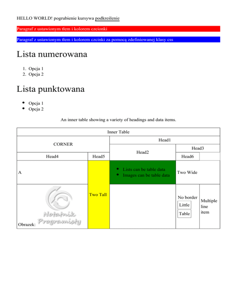 HELLO WORLD! pogrubienie kursywa podkreślenie Paragraf z ustawionym tłem i kolorem czcionki Paragraf z ustawionym tłem i kolorem czcinki za pomocą zdefiniowanej klasy css Lista numerowana 1. Opcja 1 2. Opcja 2 Lista punktowana Opcja 1 Opcja 2 An inner table showing a variety of headings and data items. Inner Table Head1 CORNER Head3 Head2 Head4 Head5 Head6 Lists can be table data Images can be table data A Two Tall Two Wide No border Little Table Obrazek: Multiple line item