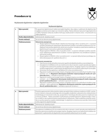 Procedura nr 15 Wydawanie dyplomów i odpisów dyplomów Wydawanie dyplomu 1. Opis czynności Po egzaminie dyplomowym należy sporządzić dyplom, dwa odpisy i suplement do dyplomu bez względu na dostarczenie zdjęć czy wniesienie opłaty. Należy dokonać wpisu do księgi dyplomów w USOS. Pamiętać należy by studenci kończący studia przed 17 sierpnia 2005 r. otrzymywali trzy odpisy dyplomu. Osoba odpowiedzialna Sekretariat ds. dydaktycznych Termin realizacji do 30 dni po obronie pracy dyplomowej Podstawa prawna Dokumenty zewnętrzne: ʘʘ Rozporządzenie Ministra Nauki i Szkolnictwa Wyższego z dnia 1 września 2011 r. w sprawie tytułów zawodowych nadawanych absolwentom studiów, warunków wydawania oraz niezbędnych elementów dyplomów ukończenia studiów i świadectw ukończenia studiów podyplomowych oraz wzoru suplementu do dyplomu ʘʘ Rozporządzenie MNiSW z dnia 19 grudnia 2008 r. w sprawie rodzajów tytułów zawodowych nadawanych absolwentom studiów i wzorów dyplomów oraz świadectw wydawanych przez uczelnie ʘʘ Rozporządzenie MNiSW z dnia 14 września 2011 r. w sprawie dokumentacji przebiegu studiów (obowiązuje od 1 października 2011 r.) Dokumenty wewnętrzne: ʘʘ http://www.uj.edu.pl/web/uniwersytet-jagiellonski/dydaktyka/akty-prawne/dyplomy ʘʘ Zarządzenie nr 98 Rektora UJ z 25 września 2013 roku w sprawie: zasad i sposobu sporządzania dyplomów ukończenia studiów pierwszego stopnia, drugiego stopnia oraz jednolitych studiów magisterskich, suplementów do dyplomów oraz wysokości pobieranych za nie opłat. ʘʘ Komentarz do Zarządzenia nr 98 Rektora UJ z dnia 25 września 2013 r. ʘʘ Regulamin studiów pierwszego stopnia, drugiego stopnia oraz jednolitych studiów magisterskich, art. IV (Regulamin obowiązuje studentów rozpoczynających studia od 1 października 2012 r. – wchodzi w życie od 1.10.2012 r.) ʘʘ Regulamin studiów pierwszego stopnia, drugiego stopnia oraz jednolitych studiów magisterskich – art. IV (Regulamin obowiązuje studentów kontynuujących studia rozpoczęte przed 1 października 2012 r. – wchodzi w życie od 1.10.2012 r.) ʘʘ Regulamin studiów pierwszego stopnia, drugiego stopnia oraz jednolitych studiów magisterskich – tekst ujednolicony (Regulamin obowiązuje studentów rozpoczynających studia od 1 października 2012 r. – wchodzi w życie od 1.10.2014 r.) 2. Opis czynności Przed przygotowaniem dokumentów należy sprawdzić dane osobowe studenta w USOS i porównać je z danymi z dowodu osobistego lub w przypadku studentów cudzoziemców z dokumentem stwierdzającym tożsamość osoby (np. paszportem). Kserokopia dowodu powinna znajdować się w teczce studenta. Należy sprawdzić wydrukowany protokół egzaminu dyplomowego z danymi w USOS w celu wyeliminowania ewentualnych rozbieżności. Jeżeli studentka zmieniła nazwisko w wyniku zawarcia związku małżeńskiego, na dyplomie umieszcza się nazwisko, które nosiła w dniu egzaminu dyplomowego. Osoba odpowiedzialna Sekretariat ds. dydaktycznych Termin realizacji do 30 dni po obronie pracy dyplomowej Podstawa prawna Zarządzenie nr 98 Rektora UJ z 25 września 2013 roku w sprawie: zasad i sposobu sporządzania dyplomów ukończenia studiów pierwszego stopnia, drugiego stopnia oraz jednolitych studiów magisterskich, suplementów do dyplomów oraz wysokości pobieranych za nie opłat Procedura nr 15 255 3. 4. 5. 6. 256 Opis czynności Należy sprawdzić miejsce urodzenia studenta urodzonego poza granicami Polski wg Komisji Standaryzacji Nazw Geograficznych. W szczególnie trudnych przypadkach (np. w sytuacji, kiedy w przedłożonym dokumencie tożsamości w miejscu urodzenia wpisany jest tylko kraj lub np. obwód, dzielnica) należy wymagać dostarczenia skróconego odpisu aktu urodzenia wraz z jego uwierzytelnionym tłumaczeniem na język polski. Tłumaczenia dokonuje tłumacz przysięgły. W przypadku alfabetu innego niż łaciński należy dokonać transliteracji wg Komisji Standaryzacji Nazw Geograficznych. Należy pamiętać, że w przypadku wspomnianych absolwentów nazwa miejscowości winna być wpisana do dyplomu w oryginalnym brzmieniu lub w tłumaczeniu na język, w którym wydawany jest odpis. Osoba odpowiedzialna Sekretariat ds. dydaktycznych Termin realizacji do 30 dni po obronie pracy dyplomowej Podstawa prawna Zarządzenie nr 98 Rektora UJ z 25 września 2013 roku w sprawie: zasad i sposobu sporządzania dyplomów ukończenia studiów pierwszego stopnia, drugiego stopnia oraz jednolitych studiów magisterskich, suplementów do dyplomów oraz wysokości pobieranych za nie opłat (Afryka, Ameryka, Australia i Oceania, Antarktyka, Azja Południowa, Azja Południowo-Wschodnia, Azja Środkowa i Zakaukazie, Azja Wschodnia, Białoruś, Rosja, Ukraina, Bliski Wschód, Europa, cz. 1, Europa, cz. 2, Nazwy państw – język angielski) Opis czynności Student powinien dostarczyć identyczne zdjęcia w określonym formacie i uiścić opłatę. Czynności te powinny zostać dokonane przez studenta przed egzaminem dyplomowym. W wypadku niespełnienia tych wymogów należy przygotować dyplom i przechować go w aktach studenta (bez podpisów dziekana i rektora) do czasu dopełnienia formalności. Jeśli student nie dostarczył zdjęć w wymaganym terminie, powinien złożyć oświadczenie o późniejszym ich dostarczeniu w momencie dopełnienia formalności. Osoba odpowiedzialna Sekretariat ds. dydaktycznych Termin realizacji 30 dni po obronie pracy dyplomowej Podstawa prawna ʘʘ Rozporządzenie MNiSW z dnia 14 września 2011 r. w sprawie dokumentacji przebiegu studiów (obowiązuje od 1 października 2011 r.) ʘʘ Zarządzenie nr 98 Rektora UJ z 25 września 2013 roku w sprawie: zasad i sposobu sporządzania dyplomów ukończenia studiów pierwszego stopnia, drugiego stopnia oraz jednolitych studiów magisterskich, suplementów do dyplomów oraz wysokości pobieranych za nie opłat ʘʘ Oświadczenie absolwenta – brak zdjęć Opis czynności Za wy