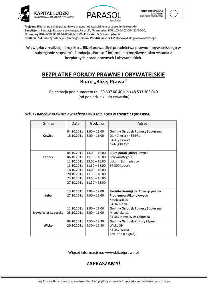 Projekt:: Bliżej prawa. Sieć poradnictwa prawno- obywatelskiego w subregionie słupskim Beneficjent: Fundacja Rozwoju Lokalnego „Parasol”; Nr wniosku: POKL.05.04.02-00-421/10-00, Nr umowy UDA-POKL.05.04.02-00-421/10-00; Priorytet: V Dobre rządzenie Działanie 5.4 Rozwój potencjału trzeciego sektora; Poddziałanie 5.4.2. Rozwój dialogu obywatelskiego W związku z realizacją projektu ,, Bliżej prawa. Sieć poradnictwa prawno- obywatelskiego w subregionie słupskim”, Fundacja ,,Parasol” informuje o możliwości skorzystania z bezpłatnych porad prawnych i obywatelskich. BEZPŁATNE PORADY PRAWNE I OBYWATELSKIE Biuro „Bliżej Prawa” Rejestracja pod numerem tel. 59 307 00 40 lub +48 533 305 040 (od poniedziałku do czwartku) DYŻURY RADCÓW PRAWNYCH W PAŹDZIERNIKU 2011 ROKU W POWIECIE LĘBORSKIM: Gmina Data Cewice 04.10.2011 18.10.2011 8.00 – 11.00 8.00 – 11.00 Gminny Ośrodek Pomocy Społecznej Oś. 40-lecia nr 35 PRL 84-312 Cewice Club „CHECZ” 04.10.2011 06.10.2011 11.10.2011 13.10.2011 18.10.2011 20.10.2011 25.10.2011 27.10.2011 13.00 – 16.00 11.30 – 18.00 13.00 – 16.00 11.30 – 18.00 13.00 – 16.00 11.30 – 18.00 13.00 – 16.00 11.30 – 18.00 Biuro porad „Bliżej Prawa” Krzywoustego 1 pok. nr 114 (I piętro) 84-300 Lębork Łeba 13.10.2011 27.10.2011 9.00 – 12.00 9.00 – 12.00 Nowa Wieś Lęborska 11.10.2011 25.10.2011 8.00 – 11.00 8.00 – 11.00 Wicko 06.10.2011 20.10.2011 9.30 – 12.30 9.30 – 12.30 Siedziba Komisji ds. Rozwiązywania Problemów Alkoholowych Kościuszki 90 84-360 Łeba Gminny Ośrodek Pomocy Społecznej Młynarska 11 84-351 Nowa Wieś Lęborska Gminny Ośrodek Kultury i Sportu Wicko 39 84-352 Wicko pok. nr 2 (I piętro) Lębork Godzina Adres Więcej informacji na: www.blizejprawa.pl ZAPRASZAMY! Projekt współfinansowany ze środków Unii Europejskiej w ramach Europejskiego Funduszu Społecznego.