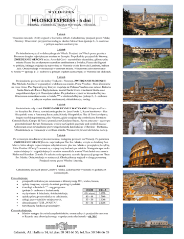 WYCIECZKA WŁOSKI EXPRESS - 6 dni WERONA – FLORENCJA – RZYM I WATYKAN – WENECJA 1 dzień Wcześnie rano (ok. 05:00) wyjazd w kierunku Włoch. Całodzienny przejazd przez Polskę i Niemcy. Wieczorem przyjazd na nocleg w okolice Monachium (pokoje 2-, 3- osobowe z pełnym węzłem sanitarnym). 2 dzień Po śniadaniu wyjazd w dalszą drogę do Włoch. Przejazd do Włoch przez przełęcz Brennero drugim największym mostem w Europie. Po południu przyjazd do Werony, ZWIEDZANIE WERONY m.in.: Arco dei Gavi - rzymski łuk triumfalny, główny plac miasta Piazza Bra ze słynnym rzymskim amfiteatrem z I wieku, Piazza dei Signori w pobliżu, którego znajduje się najwyższa w Weronie wieża Torre dei Lamberti, balkon Julii. Obiadokolacja w restauracji w centrum miasta. Wieczorem zakwaterowanie w hotelu *** (pokoje 2-, 3- osobowe z pełnym węzłem sanitarnym) w Weronie lub ololicach. 3 dzień Po śniadaniu przejazd do stolicy Toskanii - Florencji, ZWIEDZANIE FLORENCJI: Plac Michała Anioła ze wspaniałym widokiem na miasto, Ponte Vecchio - Most Złotników na rzece Arno, Plac Signorii przy którym znajdują się Palazzo Vecchio oraz ratusz, Katedra Santa Maria del Fiore i Baptysterium, kościół Santa Croce z freskami Giotta oraz nagrobkami słynnych Florentyńczyków. Po południu wyjazd w kierunku Rzymu. Wieczorem zakwaterowanie w hotelu *** w okolicach Rzymu (pokoje 2-, 3- osobowe z pełnym węzłem sanitarnym), obiadokolacja, nocleg. 4 dzień Po śniadaniu cały dzień ZWIEDZANIE RZYMU I WATYKANU: Wizyta na Placu i w Bazylice Św. Piotra, nawiedzenie grobu św. Jana Pawła II, Rzym barokowy - Plac Hiszpański wraz z Fontanną Baraccacia; Schody Hiszpańskie; Plac di Trevi ze słynną bogato rzeźbioną fontanną; plac Navona, gdzie znajduje się symboliczna Fontanna Czterech Rzek; Campo di Fiori z pomnikiem Giordano Bruno. Rzym antyczny - spacer po pozostałościach Forum Romanum; wejście na Capitol; przejście pod symbol miasta Colosseum oraz odwiedzenie pierwszego kościoła katolickiego w Rzymie - Panteonu. Obiadokolacja w restauracji w centrum miasta. Wieczorem powrót do hotelu, nocleg. 5 dzień Po wczesnym śniadaniu wykwaterowanie, następnie przejazd do Wenecji. Po południu ZWIEDZANIE WENECJI m.in.: rejs barką na Plac Św. Marka; wizyta w dzielnicy San Marco, która skupia najważniejsze zabytki miasta: plac św. Marka z przepiękną bazyliką, Pałac Dożów i Wieżę Dzwonniczą – najwyższą budowlą w mieście. Następnie spacer do najważniejszych i najpiękniejszych mostów weneckich: mostu Westchnień oraz mostu Rialto nad Kanałem Grande. Po zakończeniu spaceru, czas do dyspozycji grupy na Placu Św. Marka. Obiadokolacja w restauracji. Około północy wyjazd w drogę powrotną. Przejazd nocny przez Włochy i Austrię. 6 dzień Całodzienny przejazd przez Czechy i Polskę. Zakończenie wycieczki w godzinach wieczornych. Cena obejmuje: przejazd komfortowym autokarem z klimatyzacją, WC, wideo, barem, opłaty drogowe, wjazdy do miast, parkingi i podatki, 4 noclegi w hotelach *** - wg programu OSÓB CENA (pokoje 2- osobowe z łazienkami), 45 i więcej 1.670, wyżywienie: 4 śniadania, 4 obiadokolacje, 40 – 44 1.780, opieka pilota/przewodnika na całej trasie, 35 – 39 1.930, usługi przewodników miejscowych, ubezpieczenie TUiR „WARTA”. 30 – 34 2.120, turystyczny fundusz gwarancyjny. Cena nie obejmuje: biletów wstępu do zwiedzanych obiektów, ewentualnych przejazdów metrem w Rzymie oraz obowiązkowego wypożyczenia słuchawek – ok. 50 € Gdańsk, Al. Hallera 14, tel./fax 58 341 66 55, tel./fax 58 344 66 55
