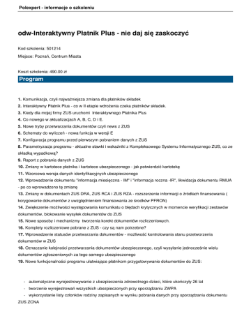 Polexpert - informacje o szkoleniu odw-Interaktywny Płatnik Plus - nie daj się zaskoczyć Kod szkolenia: 501214 Miejsce: Poznań, Centrum Miasta Koszt szkolenia: 490.00 zł Program 1. Komunikacja, czyli najważniejsza zmiana dla płatników składek 2. Interaktywny Płatnik Plus - co w II etapie wdrożenia czeka płatników składek. 3. Kiedy dla mojej firmy ZUS uruchomi Interaktywnego Płatnika Plus 4. Co nowego w aktualizacjach A, B, C, D i E. 5. Nowe tryby przetwarzania dokumentów czyli news z ZUS 6. Schematy do wyliczeń - nowa funkcja w wersji E 7. Konfiguracja programu przed pierwszym pobraniem danych z ZUS 8. Parametryzacja programu - aktualne stawki i wskaźniki z Kompleksowego Systemu Informatycznego ZUS, co ze składką wypadkową? 9. Raport z pobrania danych z ZUS 10. Zmiany w kartotece płatnika i kartotece ubezpieczonego - jak potwierdzić kartotekę 11. Wzorcowa wersja danych identyfikacyjnych ubezpieczonego 12. Wprowadzenie dokumentu "informacja miesięczna - IM" i "informacja roczna -IR", likwidacja dokumentu RMUA - po co wprowadzono tę zmianę 13. Zmiany w dokumentach ZUS DRA, ZUS RCA i ZUS RZA - rozszerzenie informacji o źródłach finansowania ( korygowanie dokumentów z uwzględnieniem finansowania ze środków PFRON) 14. Zwiększenie możliwości występowania komunikatu o błędach krytycznych w momencie weryfikacji zestawów dokumentów, blokowanie wysyłek dokumentów do ZUS 15. Nowe sposoby i mechanizmy tworzenia korekt dokumentów rozliczeniowych. 16. Komplety rozliczeniowe pobrane z ZUS - czy są nam potrzebne? 17. Wprowadzenie statusów przetwarzania dokumentów - możliwość kontrolowania stanu przetworzenia dokumentów w ZUS 18. Oznaczanie kolejności przetwarzania dokumentów ubezpieczonego, czyli wysyłanie jednocześnie wielu dokumentów zgłoszeniowych za tego samego ubezpieczonego 19. Nowe funkcjonalności programu ułatwiające płatnikom przygotowywanie dokumentów do ZUS: - automatyczne wyrejestrowywanie z ubezpieczenia zdrowotnego dzieci, które ukończyły 26 lat - tworzenie wyrejestrowań wszystkich ubezpieczonych przy sporządzaniu ZWPA - wykorzystanie listy członków rodziny zapisanych w wyniku pobrania danych przy sporządzaniu dokumentu ZUS ZCNA Polexpert - informacje o szkoleniu 20. Najważniejsze problemy po wprowadzeniu Interaktywnego Płatnika Plus: - co z przetwarzaniem danych identyfikacyjnych ubezpieczonych - opóźnienie w przetwarzaniu ZIUA, jak sobie radzić - dane płatnika po pobraniu danych z ZUS uległy zmianie, jak to skorygować - rozbieżności w danych ubezpieczonych między bazą programu Płatnik a systemem kadrowo-płacowym - dane ubezpieczonego pobrane z jego konta w ZUS a nieprawidłowości w zakresie historii kodu tytułu ubezpieczenia Szkolenie zostanie przeprowadzone w formie prezentacji multimedialnej. - Wszystkie istotne zmiany wprowadzane przez program zostaną omówione na konkretnych przykładach, które umożliwią uczestnikom szkolenia dokładne zrozumienie przygotowanych zmian. - Każdy z uczestników szkolenia otrzyma materiały, które już po ukończeniu szkolenia pomogą w pracy z nową wersją programu. Prowadzący