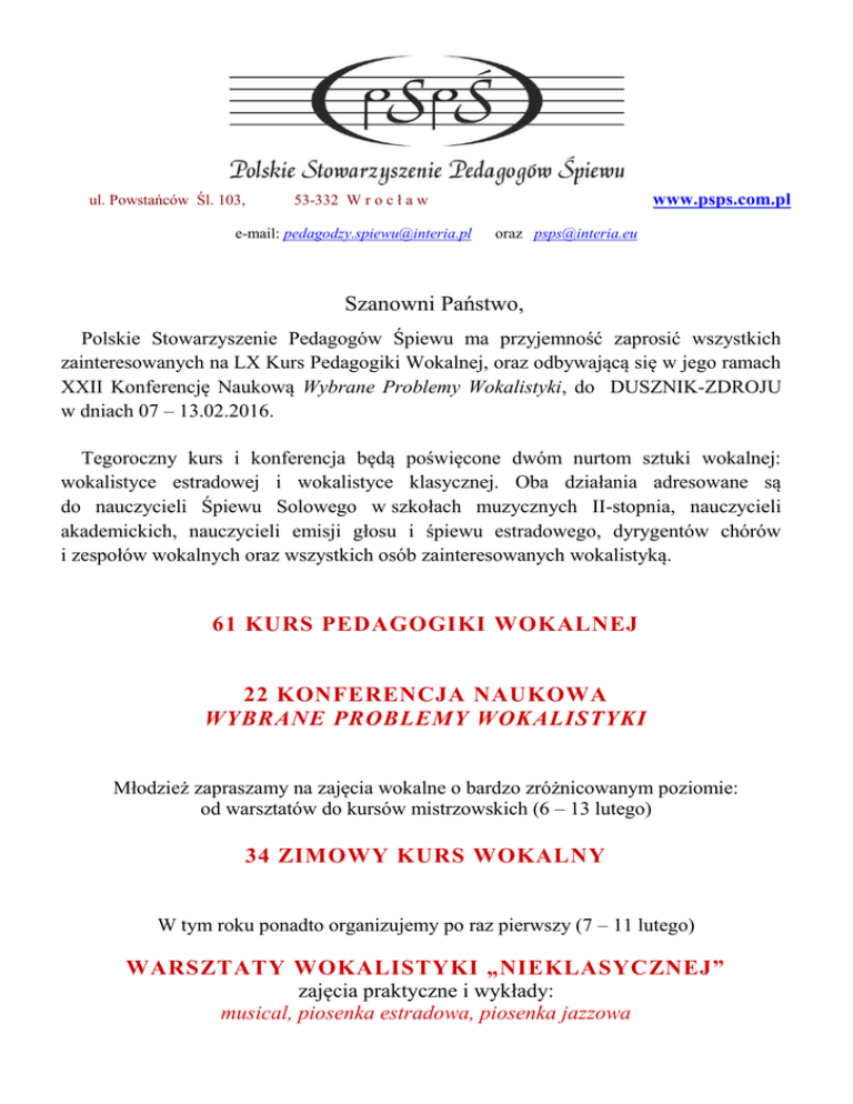 ul. Powstańców Śl. 103, 53-332 W r o c ł a w e-mail: [email protected] www.psps.com.pl oraz [email protected] Szanowni Państwo, Polskie Stowarzyszenie Pedagogów Śpiewu ma przyjemność zaprosić wszystkich zainteresowanych na LX Kurs Pedagogiki Wokalnej, oraz odbywającą się w jego ramach XXII Konferencję Naukową Wybrane Problemy Wokalistyki, do DUSZNIK-ZDROJU w dniach 07 – 13.02.2016. Tegoroczny kurs i konferencja będą poświęcone dwóm nurtom sztuki wokalnej: wokalistyce estradowej i wokalistyce klasycznej. Oba działania adresowane są do nauczycieli Śpiewu Solowego w szkołach muzycznych II-stopnia, nauczycieli akademickich, nauczycieli emisji głosu i śpiewu estradowego, dyrygentów chórów i zespołów wokalnych oraz wszystkich osób zainteresowanych wokalistyką. 61 KURS PEDAGOGIKI WOKALNEJ 22 KONFERENCJA NAUKOWA WYBRANE PROBLEMY WOKALISTYKI Młodzież zapraszamy na zajęcia wokalne o bardzo zróżnicowanym poziomie: od warsztatów do kursów mistrzowskich (6 – 13 lutego) 34 ZIMOWY KURS WOKALNY W tym roku ponadto organizujemy po raz pierwszy (7 – 11 lutego) WARSZTATY WOKALISTYKI „NIEKLASYCZNEJ” zajęcia praktyczne i wykłady: musical, piosenka estradowa, piosenka jazzowa 61 KURS PEDAGOGIKI WOKALNEJ (KURS METODYCZNY DLA NAUCZYCIELI ŚPIEWU SOLOWEGO) kierownictwo: prof. Barbara Ewa Werner sekretariat artystyczny: prof. Jerzy Knetig, dr hab. Monika Kolasa-Hladikova zajęcia w Sali Konferencyjnej Willi Wolność II Niedziela, 07.02.2016 r. DZIEŃ ESTRADOWY godz. 16.00 – o t w a r c i e k u r s u – prof. Eugeniusz Sąsiadek Panel dyskusyjny: Od klasyki do musicalu – prowadzenie prof. Barbara Ewa Werner Tematyka panelu: piosenka, jazz, musical, klasyka, opera, czym jest zawód śpiewaka artysty, czym jest zawód śpiewaka estradowego. Uczestnicy i dyskutanci panelu: prof. E. Sąsiadek, prof. B. E. Werner, prof. A. Nanowski, prof. J. Knetig, mgr M. Kustosz-Piątosa Poniedziałek, 08.02.2016 r. DZIEŃ MUSICALOWY godz. 9.45 – wykład: Od klasyki do musicalu – cechy wspólne i różnice emisji klasycznej i estradowej – prof. Andrzej Nanowski godz. 11.30 – Pokaz praktyczny pracy z uczniem – prowadzenie prof. Andrzej Nanowski, czynny udział uczestników warsztatów/pedagogów Po południu Warsztaty Wokalistyki „Nieklasycznej” – Musical Po południu obserwacja zajęć Kursu Wokalnego Wtorek, 09.02.2016 r. DZIEŃ WOKALISTYKI ESTRADOWEJ i JAZZOWEJ godz. 9.45 – wykład: Emisja piosenkarska czyli od mowy do śpiewu. Przyjemność bez granic – prowadzenie mgr Małgorzata Kustosz-Piątosa godz. 11.30 – wykład: Wszystko można zaśpiewać inaczej –specyfika i możliwości wykorzystania głosu w wokalistyce jazzowej – prowadzenie mgr Izabela Zając Po południu Warsztaty Wokalistyki „Nieklasycznej” – Jazz Po południu obserwacja zajęć Zimowego Kursu Wokalnego Środa, 10.02.2016 r. DZIEŃ PSYCHOLOGICZNY godz. 9.45 – Warsztaty Psychologii pozytywnej – prowadzenie dr Jolanta Welbel czynny udział uczestników warsztatów/pedagogów godz. 11.30 – Warsztaty pracy z ciałem i dźwięki lecznicze – metody chińskie i tybetańskie – prowadzenie dr hab. Monika Kolasa-Hladikova czynny udział uczestników warsztatów/pedagogów Po południu Warsztaty Wokalistyki „Nieklasycznej” – Piosenka Po południu obserwacja zajęć Zimowego Kursu Wokalnego Wieczorem KONCERT uczestników Warsztatów Wokalistyki „Nieklasycznej” 22 KONFERENCJA NAUKOWA WYBRANE PROBLEMY WOKALISTYKI kierownictwo: prof. Barbara Ewa Werner sekretariat artystyczny: prof. Jerzy Knetig, dr hab. Monika Kolasa-Hladikova Czwartek, 11.02.2016 r. godz. 9.45 – Wprowadzenie: prof. E. Sąsiadek, prof. B. E. Werner, prof. J. Knetig godz. 10.00 – Mix singing-bel canto współczesnych technik wykonawczych mgr Dominika Płonka/mgr Grażyna Dzwonowska godz. 10.45 – Najczęstsze schorzenia wokalistów i metody zapobiegania im (temat roboczy) dr Maria Łyszczak (lekarz-foniatra) godz. 12.00 – Psychika i fizyczność artysty jako uzupełnienie wykonawstwa wokalnego dr Agnieszka Piekaroś-Padzińska godz. 12.45 – Opera polska – źródła, tradycje, współczesność dr hab. Eugenia Mirosława Rezler-Rozlach Po południu obserwacja zajęć Kursu Wokalnego. Piątek, 12.02.2016 r. godz. 9.45 – Wracamy do klasyki, jak nie uronić talentu na egzaminach wstępnych prof. Piotr Kusiewicz godz. 10.45 – Pieśni Claude Debussy’ego (temat roboczy) prof. Barbara Ewa Werner godz. 12.00 – Raul Koczalski i jego liryka wokalna prof. Wojciech Maciejowski godz. 12.45 – Krótki zarys barokowej teorii afektów dr hab. Maria Seremet Po południu obserwacja zajęć Kursu Wokalnego. Sobota, 13.02.2016 r. godz. 9.45 – Współczesne gwiazdy polskiej wokalistyki operowej prof. Piotr Kusiewicz godz. 10.45– Maria Fołtyn – wybitna osobowość (temat roboczy) dr Andrzej Szypuła godz. 12.00 – Historia konferencji dusznickich prof. Eugeniusz Sąsiadek godz. 12.45 – Pomost estrada-klasyka (robocze „hasło” tematyki wykładu) dr hab. Izabela Jeżowska, prof. PWST godz. 13.30 – Zakończenie: prof. E. Sąsiadek, prof. B. E. Werner oraz Zarząd PSPŚ Organizatorzy zastrzegają sobie prawo do zmian programu Kursu i Konferencji z przyczyn od nich niezależnych. INFORMACJE ORGANIZACYJNE Organizatorem Kursu i Konferencji jest Polskie Stowarzyszenie Pedagogów Śpiewu, przy tradycyjnej współpracy Katedry Wokalistyki Wydziału Wokalnego Akademii Muzycznej im. Karola Lipińskiego we Wrocławiu. Impreza odbędzie się w dniach 7.02–13.02.2016r. w Dusznikach Zdroju. Zajęcia Kursu odbywać się będą w sali konferencyjnej WILLI WOLNOŚĆ II (dawniej POZNANIAK). Uczestnikami Kursu i Konferencji mogą być nauczyciele akademiccy oraz nauczyciele szkół muzycznych II stopnia i szkół pomaturalnych, prowadzący naukę śpiewu solowego lub emisji głosu oraz uczestnicy 34 Zimowego Kursu Wokalnego i Warsztatów Wokalistyki „Nieklasycznej”, a także inne osoby zainteresowane tematyk
