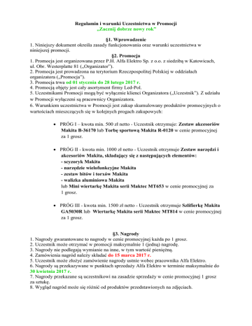 Regulamin i warunki Uczestnictwa w Promocji „Zacznij dobrze nowy rok” §1. Wprowadzenie 1. Niniejszy dokument określa zasady funkcjonowania oraz warunki uczestnictwa w niniejszej promocji. §2. Promocja 1. Promocja jest organizowana przez P.H. Alfa Elektro Sp. z o.o. z siedzibą w Katowicach, ul. Obr. Westerplatte 81 („Organizator”). 2. Promocja jest prowadzona na terytorium Rzeczpospolitej Polskiej w oddziałach organizatora („Promocja”). 3. Promocja trwa od 01 stycznia do 28 lutego 2017 r. 4. Promocją objęty jest cały asortyment firmy Led-Pol. 5. Uczestnikami Promocji mogą być wyłącznie klienci Organizatora („Uczestnik”). Z udziału w Promocji wyłączeni są pracownicy Organizatora. 6. Warunkiem uczestnictwa w Promocji jest zakup skumulowany produktów promocyjnych o wartościach mieszczących się w kolejnych progach zakupowych: PRÓG I – kwota min. 500 zł netto - Uczestnik otrzymuje: Zestaw akcesoriów Makita B-36170 lub Torbę sportową Makita R-0120 w cenie promocyjnej za 1 grosz. PRÓG II - kwota min. 1000 zł netto - Uczestnik otrzymuje Zestaw narzędzi i akcesoriów Makita, składający się z następujących elementów: - scyzoryk Makita - narzędzie wielofunkcyjne Makita - zestaw bitów i torxów Makita - walizka aluminiowa Makita lub Mini wiertarkę Makita serii Maktec MT653 w cenie promocyjnej za 1 grosz. PRÓG III - kwota min. 1500 zł netto - Uczestnik otrzymuje Szlifierkę Makita GA5030R lub Wiertarkę Makita serii Maktec MT814 w cenie promocyjnej za 1 grosz. §3. Nagrody 1. Nagrody gwarantowane to nagrody w cenie promocyjnej każda po 1 grosz. 2. Uczestnik może otrzymać w promocji maksymalnie 1 (jedną) nagrodę. 3. Nagrody nie podlegają wymianie na inne, w tym wartość pieniężną. 4. Zamówienia nagród należy składać do 15 marca 2017 r. 5. Uczestnik może złożyć zamówienie nagrody ustnie wobec pracownika Alfa Elektro. 6. Nagrody są przekazywane w punktach sprzedaży Alfa Elektro w terminie maksymalnie do 30 kwietnia 2017 r. 7. Nagrody przekazane są uczestnikowi na zasadzie sprzedaży w cenie promocyjnej 1 grosz za sztukę. 8. Wygląd nagród może się różnić od produktów przedstawionych na zdjęciach. 9. W przypadku braku dostępności wymienionych w regulaminie nagród Organizator zastrzega sobie prawo do zamiany nagrody na dostępny na rynku model o podobnych parametrach technicznych i wartości rynkowej. 10. Zaległości płatnicze Uczestnika wobec Organizatora oraz zwroty towarów promocyjnych mogą być podstawą do anulowania prawa do nagrody. O anulowaniu prawa do nagrody Organizator poinformuje Uczestnika. §5. Reklamacje 1. Wszelkie reklamacje dotyczące sposobu przeprowadzenia Promocji, mogą być zgłaszane po zakończeniu Promocji, nie później jednak niż w terminie do dnia 31 maja 2017 r. (decyduje data stempla pocztowego). 2. Reklamacje należy zgłaszać na piśmie i przesyłać listem poleconym na adres organizatora z dopiskiem „Zacznij dobrze nowy rok” 3. Forma pisemna reklamacji zastrzeżona jest pod rygorem nieważności. 4. Reklamacje rozpatrywane będą w terminie 14 dni od ich otrzymania. 5. Przy rozpoznawaniu reklamacji organizator opiera się na przepisach Kodeksu Cywilnego oraz treści niniejszego regulaminu i opisie sytuacji zawartym w reklamacji. O wyniku rozpatrzenia reklamacji Organizator zawiadamia osobę wnoszącą reklamację, listem poleconym wysłanym w terminie 7 dni roboczych od dnia rozpatrzenia reklamacji. W przypadku uwzględnienia reklamacji reklamujący zostanie powiadomiony o sposobie zadośćuczynienia. §6. Odpowiedzialność Organizatora 1. Odpowiedzialność finansowa Organizatora wobec Uczestnika ograniczona jest do wartości i liczby Nagród określonych w Regulaminie. 2. Organizator nie ponosi odpowiedzialności za wady fizyczne Nagród. 3. Reklamacje złożone po terminie określonym w regulaminie nie będą rozpatrywane. §7. Postanowienia końcowe 1. Wszelkie spory wynikłe z tytułu wykonania zobowiązań związanych z niniejszą Promocją będą rozstrzygane przez sąd miejscowo właściwy dla siedziby Organizatora. Skierowanie przez Uczestnika sprawy na drogę postępowania sądowego jest dopuszczalne po wyczerpaniu procedury reklamacyjnej. 2. W kwestiach nieuregulowanych niniejszymi Warunkami Uczestnictwa stosuje się przepisy Kodeksu Cywilnego. 3. Tekst niniejszego Regulaminu dostępny jest w siedzibie Organizatora. 4. Postanowienia niniejszych Warunków Uczestnictwa stanowią wyłączną podstawę do prowadzenia Promocji, a ich wykładnia i interpretacja zależy wyłącznie od Organizatora. Wszelkie materiały promocyjno-reklamowe mają wyłącznie charakter informacyjny. Ewentualnie prezentowany wizerunek Nagród przedstawiony w materiałach reklamowych może odbiegać od ich rzeczywistego wyglądu. 5. Jakiekolwiek uprawnienia Uczestnika wynikające z niniejszego Regulaminu nie podlegają przeniesieniu na osoby trzecie. ORGANIZATOR