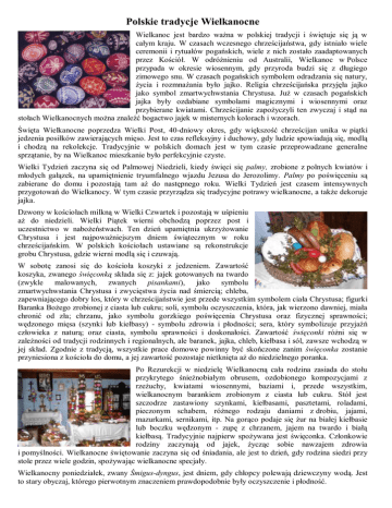 Polskie tradycje Wielkanocne Wielkanoc jest bardzo ważna w polskiej tradycji i świętuje się ją w całym kraju. W czasach wczesnego chrześcijaństwa, gdy istniało wiele ceremonii i rytuałów pogańskich, wiele z nich zostało zaadaptowanych przez Kościół. W odróżnieniu od Australii, Wielkanoc w Polsce przypada w okresie wiosennym, gdy przyroda budzi się z długiego zimowego snu. W czasach pogańskich symbolem odradzania się natury, życia i rozmnażania było jajko. Religia chrześcijańska przyjęła jajko jako symbol zmartwychwstania Chrystusa. Już w czasach pogańskich jajka były ozdabiane symbolami magicznymi i wiosennymi oraz przybierane kwiatami. Chrześcijanie zapożyczyli ten zwyczaj i stąd na stołach Wielkanocnych można znaleźć bogactwo jajek w misternych kolorach i wzorach. Święta Wielkanocne poprzedza Wielki Post, 40-dniowy okres, gdy większość chrześcijan unika w piątki jedzenia posiłków zawierających mięso. Jest to czas refleksyjny i duchowy, gdy ludzie spowiadają się, modlą i chodzą na rekolekcje. Tradycyjnie w polskich domach jest w tym czasie przeprowadzane generalne sprzątanie, by na Wielkanoc mieszkanie było perfekcyjnie czyste. Wielki Tydzień zaczyna się od Palmowej Niedzieli, kiedy święci się palmy, zrobione z polnych kwiatów i młodych gałązek, na upamiętnienie tryumfalnego wjazdu Jezusa do Jerozolimy. Palmy po poświęceniu są zabierane do domu i pozostają tam aż do następnego roku. Wielki Tydzień jest czasem intensywnych przygotowań do Wielkanocy. W tym czasie przyrządza się tradycyjne potrawy wielkanocne, a także dekoruje jajka. Dzwony w kościołach milkną w Wielki Czwartek i pozostają w uśpieniu aż do niedzieli. Wielki Piątek wierni obchodzą poprzez post i uczestnictwo w nabożeństwach. Ten dzień upamiętnia ukrzyżowanie Chrystusa i jest najpoważniejszym dniem świątecznym w roku chrześcijańskim. W polskich kościołach ustawiane są rekonstrukcje grobu Chrystusa, gdzie wierni modlą się i czuwają. W sobotę zanosi się do kościoła koszyki z jedzeniem. Zawartość koszyka, zwanego święconką składa się z: jajek gotowanych na twardo (zwykle malowanych, zwanych pisankami), jako symbolu zmartwychwstania Chrystusa i zwycięstwa życia nad śmiercią; chleba, zapewniającego dobry los, który w chrześcijaństwie jest przede wszystkim symbolem ciała Chrystusa; figurki Baranka Bożego zrobionej z ciasta lub cukru; soli, symbolu oczyszczenia, która, jak wierzono dawniej, miała chronić od zła; chrzanu, jako symbolu gorzkiego poświęcenia Chrystusa oraz fizycznej sprawności; wędzonego mięsa (szynki lub kiełbasy) - symbolu zdrowia i płodności; sera, który symbolizuje przyjaźń człowieka z naturą; oraz ciasta, symbolu sprawności i doskonałości. Zawartość święconki różni się w zależności od tradycji rodzinnych i regionalnych, ale baranek, jajka, chleb, kiełbasa i sól, zawsze wchodzą w jej skład. Zgodnie z tradycją, wszystkie prace domowe powinny być skończone zanim święconka zostanie przyniesiona z kościoła do domu, a jej zawartość pozostaje nietknięta aż do niedzielnego poranka. Po Rezurekcji w niedzielę Wielkanocną cała rodzina zasiada do stołu przykrytego śnieżnobiałym obrusem, ozdobionego kompozycjami z rzeżuchy, kwiatami wiosennymi, baziami i, przede wszystkim, wielkanocnym barankiem zrobionym z ciasta lub cukru. Stół jest szczodrze zastawiony szynkami, kiełbasami, pasztetami, roladami, pieczonym schabem, różnego rodzaju daniami z drobiu, jajami, mazurkami, sernikami, itp. Na gorąco podaje się żur na białej kiełbasie lub boczku wędzonym - zupę z chrzanem, jajem na twardo i białą kiełbasą. Tradycyjnie najpierw spożywana jest święconka. Członkowie rodziny zaczynają od jajek, życząc sobie nawzajem zdrowia i pomyślności. Wielkanocne świętowanie zaczyna się od śniadania, ale jest to dzień, gdy rodzina siedzi przy stole przez wiele godzin, spożywając wielkanocne specjały. Wielkanocny poniedziałek, zwany Śmigus-dyngus, jest dniem, gdy chłopcy polewają dziewczyny wodą. Jest to stary obyczaj, którego pierwotnym znaczeniem prawdopodobnie były oczyszczenie i płodność.