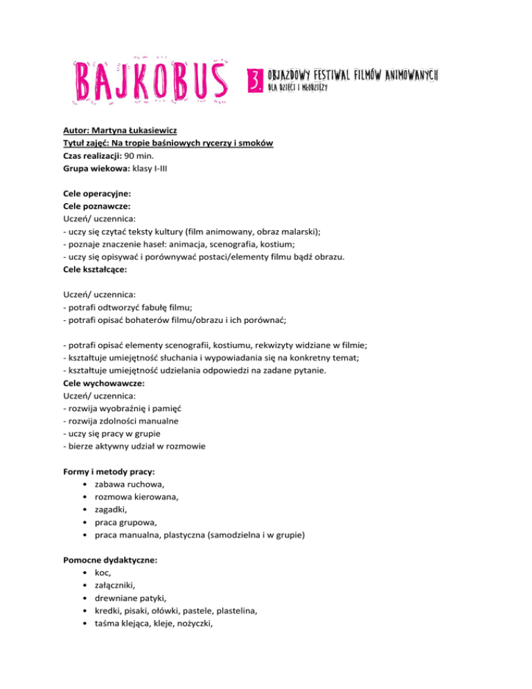 Autor: Martyna Łukasiewicz Tytuł zajęć: Na tropie baśniowych rycerzy i smoków Czas realizacji: 90 min. Grupa wiekowa: klasy I-III Cele operacyjne: Cele poznawcze: Uczeń/ uczennica: - uczy się czytać teksty kultury (film animowany, obraz malarski); - poznaje znaczenie haseł: animacja, scenografia, kostium; - uczy się opisywać i porównywać postaci/elementy filmu bądź obrazu. Cele kształcące: Uczeń/ uczennica: - potrafi odtworzyć fabułę filmu; - potrafi opisać bohaterów filmu/obrazu i ich porównać; - potrafi opisać elementy scenografii, kostiumu, rekwizyty widziane w filmie; - kształtuje umiejętność słuchania i wypowiadania się na konkretny temat; - kształtuje umiejętność udzielania odpowiedzi na zadane pytanie. Cele wychowawcze: Uczeń/ uczennica: - rozwija wyobraźnię i pamięć - rozwija zdolności manualne - uczy się pracy w grupie - bierze aktywny udział w rozmowie Formy i metody pracy: • zabawa ruchowa, • rozmowa kierowana, • zagadki, • praca grupowa, • praca manualna, plastyczna (samodzielna i w grupie) Pomocne dydaktyczne: • koc, • załączniki, • drewniane patyki, • kredki, pisaki, ołówki, pastele, plastelina, • taśma klejąca, kleje, nożyczki, • niewielkie kartki wycięte na kształt postaci smoka/rycerza/księżniczki/ czarodzieja, • pudełka po butach, • cekiny, kolorowe piórka bądź inne małe elementy dekoracyjne, możliwe do naklejenia na kartkę. Przebieg zajęć 1. Rozmowa wprowadzająca. Nauczyciel rozpoczyna zajęcia od zapytania dzieci, czy pamiętają, jakie postaci pojawiły się w obejrzanych przez nie filmach animowanych (rycerze, księżniczki, smoki, czarodziej). Nauczyciel sugeruje, że te postaci i historie dotyczą dawnych czasów, epoki średniowiecza, w której żyli rycerze i księżniczki, a podczas zajęć uczniowie będą mieli możliwość poznania wielu ich tajemnic. Nauczyciel sugeruje, że być może, gdyby tylko znali jakiegoś czarodzieja, mogliby przenieść się w czasie do średniowiecza dzięki jakiemuś zaklęciu. Następnie pyta uczniów, czy pamiętają, jak wyglądał czarodziej z filmu (miał długą szatę, długą siwą brodę, różdżkę), jaki miał problem (zbyt wiele postaci potrzebowało jego pomocy, a on nie miał czasu dla wszystkich) i kto przyszedł jemu z pomocą, i jak rozwiązał ten problem (Tymek, ankieta). Następnie nauczyciel proponuje wybranie wśród uczniów czarodzieja. 2. Zabawa ruchowa „Czarodziej” (ok. 10 min., tak by kilka osób zostało wybranych Czarodziejem). Nauczyciel zbiera grupę dzieci i wybiera jedną osobę, która będzie Czarodziejem. Ta osoba otrzymuje kocyk i nie bierze udziału w marszu po sali. Pozostałe dzieci maszerują po sali do momentu, gdy nauczyciel nie wypowie hasła „hokus-pokus”. W tym momencie wszystkie dzieci zatrzymują się bez ruchu i zamykają oczy. Dziecko będące Czarodziejem podchodzi do jednej osoby i zakrywa ją kocem. Na sygnał nauczyciela pozostałe dzieci otwierają oczy i muszą odgadnąć, kogo brakuje. Wybrana osoba zostaje nowym Czarodziejem. 3. Zabawa z obrazem i rozmowa kierowana. a. Smok. Nauczyciel pyta dzieci, w jaki sposób my dzisiaj możemy dowiedzieć się czegoś o przeszłości, np. o tym, jak wyglądały księżniczki i czym zajmowali się rycerze (filmy, bajki, książki, obrazy). Może zapytać dzieci, czy pamiętają bajkę o Bolku i Lolku, skąd oni wzięli pomysł na zabawę z kuszą? (oglądali obraz). (Nauczyciel może przy okazji pokazać zdjęcie kuszy i wytłumaczyć do czego służyła – załącznik nr 3). Nauczyciel wprowadza kolejną zabawę, tym razem każde dziecko otrzymuje fragment obrazka (bądź kilka fragmentów, w zależności od liczebności grupy) z przedstawieniem smoka (załącznik nr 1). Zadaniem dzieci jest odnalezienie wśród kolegów i koleżanek pozostałych fragmentów i wspólne ułożenie obrazków. Następnie dzieci zbierają się w grupie tak, by obrazki znalazły się w środku i były widoczne dla wszystkich. Nauczyciel pyta, jaki element jest wspólny dla wszystkich obrazów (smok), a następnie prosi, by dzieci przypomniały, jak wyglądały smoki, które widziały na filmach (Smok Wawelski; Rycerze Walecznego Smoka). Pyta również, czy dzieci pamiętają, że jeden z tych smoków był dość nietypowy, jaki miał dziwny zwyczaj i dlaczego? (nie jadł baraniny/ dzieci mogą przypomnieć krótko legendę o Smoku Wawelskim, jak został pokonany). Nauczyciel pyta następnie, czy smoki z obrazów są podobne do smoków, które widzieli na filmach? Później nauczyciel przypomina, że w bajce o Smoku Wawelskim, specjalista od bardzo dużych zwierząt stwierdził, że smok to zwierzę, które nie istnieje, jest fantastyczne i może pojawiać się tylko w baśniach, jest wytworem wyobraźni. Czy dzieci znają jeszcze inne baśniowe stworzenia? (np. jednorożec, pegaz, gryf). Następnie prosi uczniów, by przyjrzeli się obrazom i spróbowali wymienić istniejące zwierzęta, które mogą nam przypominać smoki (np. jaszczurka, krokodyl itp.). b. Rycerz. Nauczyciel kieruje uwagę uczniów na fakt, iż smoki przedstawione na obrazach są za każdym razem pokonywane przez rycerza (może przywołać tu postać św. Jerzego walczącego ze smokiem jako częsty temat obrazów) i pyta uczniów, czy pamiętają, jakie specjalne zadanie otrzymali dwaj rycerze od księżniczki w jednej z bajek (mieli sprowadzić smoka na zamek). Nauczyciel pyta, jak kiedyś wyglądali rycerze (na podstawie bajek i rysunku, który pokazuje uczniom – załącznik nr 2). Następnie odczytuje hasła – nazwy poszczególnych części stroju rycerza, które dzieci muszą przyporządkować do odpowiedniego fragmentu stroju (hełm, tarcza z herbem, miecz, trzewiki, nakolannik, naramiennik, napierśnik – dzieci przykładają wydrukowane wyrazy w odpowiednie miejsce na obrazku – załącznik nr 2). Nauczyciel pyta, jak zdaniem dzieci, wyglądałby współczesny rycerz? Jaki 