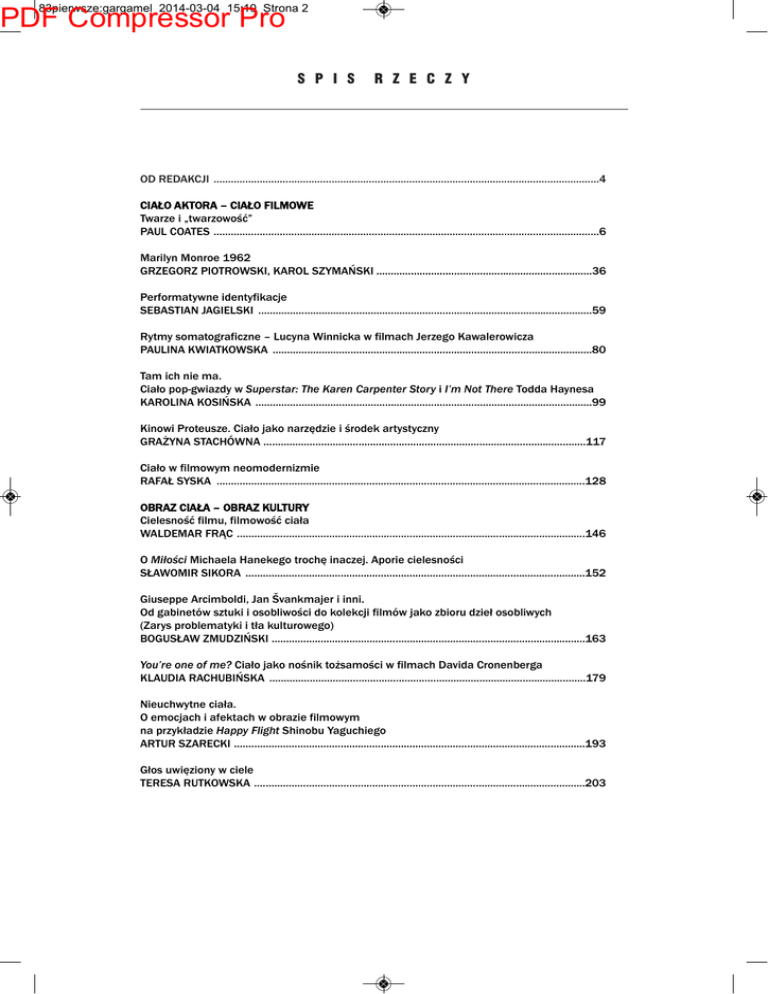 83pierwsze:gargamel 2014-03-04 15:10 Strona 2 PDF Compressor Pro S P I S R Z E C Z Y Od redakcji ......................................................................................................................................4 ciaŁO akTOra – ciaŁO FiLMOWe Twarze i „twarzowość” PaUL cOaTeS ......................................................................................................................................6 Marilyn Monroe 1962 GrZeGOrZ PiOTrOWSki, karOL SZYMaŃSki ...........................................................................36 Performatywne identyfikacje SeBaSTiaN jaGieLSki ....................................................................................................................59 rytmy somatograficzne – Lucyna Winnicka w filmach jerzego kawalerowicza PaULiNa kWiaTkOWSka ...............................................................................................................80 Tam ich nie ma. ciało pop-gwiazdy w Superstar: The Karen Carpenter Story i I’m Not There Todda Haynesa karOLiNa kOSiŃSka .....................................................................................................................99 kinowi Proteusze. ciało jako narzędzie i środek artystyczny GraŻYNa STacHÓWNa ................................................................................................................117 ciało w filmowym neomodernizmie raFaŁ SYSka ................................................................................................................................128 OBraZ ciaŁa – OBraZ kULTUrY cielesność filmu, filmowość ciała WaLdeMar FrĄc .........................................................................................................................146 O Miłości Michaela Hanekego trochę inaczej. aporie cielesności SŁaWOMir SikOra ......................................................................................................................152 Giuseppe arcimboldi, jan Švankmajer i inni. Od gabinetów sztuki i osobliwości do kolekcji filmów jako zbioru dzieł osobliwych (Zarys problematyki i tła kulturowego) BOGUSŁaW ZMUdZiŃSki .............................................................................................................163 You’re one of me? ciało jako nośnik tożsamości w filmach davida cronenberga kLaUdia racHUBiŃSka ..............................................................................................................179 Nieuchwytne ciała. O emocjach i afektach w obrazie filmowym na przykładzie Happy Flight Shinobu Yaguchiego arTUr SZarecki ..........................................................................................................................193 Głos uwięziony w ciele TereSa rUTkOWSka ...................................................................................................................203 83pierwsze:gargamel 2014-03-04 15:10 Strona 3 PDF Compressor Pro S P I S R Z E C Z Y ciaŁO POLiTYcZNe, ciaŁO SPOŁecZNe Topos ludzkiego ciała w Oblężeniu juliena Bryana Marek HeNdrYkOWSki .............................................................................................................220 Terror ciała i wstrętny stalinizm w filmie Chrustalow, samochód! aleksieja Germana starszego PaULiNa GOrLeWSka .................................................................................................................226 Przemoc w filmach gore albo o obrzydzeniu, które obnaża współczesne stosunki społeczne MarkUS LiPOWicZ ......................................................................................................................239 ciaŁO i PŁeĆ Byt i niebycie. reprezentacja kobiecego ciała w pracach anety Grzeszykowskiej aGaTa ZBOrOWSka .....................................................................................................................256 Mama naga. Nagie ciało matki we współczesnych sztukach wizualnych aNdrZej PiTrUS ..........................................................................................................................267 cielesność, intymność i seksualność w filmach Ulricha Seidla jako medium samotności i odrzucenia BeaTa kOSiŃSka-kriPPNer ......................................................................................................277 ciało niedoskonałe? Seksualny aspekt niepełnosprawności fizycznej w kinie współczesnym MaŁGOrZaTa kOZUBek ..............................................................................................................295 ciała na sprzedaż – mroczna strona globalizacji krZYSZTOF LOSka .......................................................................................................................306 OkieM i UcHeM krowa w łóżku, koń na fortepianie MarciN GiŻYcki ............................................................................................................................317 krONika (re)konstruując obraz dyscypliny. Sprawozdanie z i Zjazdu Filmoznawców i Medioznawców. kamień Śląski, 6-8 czerwca 2013 r. adaM aNdrYSek .........................................................................................................................322 kSiĄŻki O FiLMie Ostatni seans filmowy MarTa BrZeZiŃSka ....................................................................................................................326 co słychać w polskim kinie… międzywojennym WOjciecH ŚWidZiŃSki ................................................................................................................331 Balthasar, Tarkowski i theatrum mundi GrZeGOrZ NadGrOdkieWicZ ...................................................................................................335 NOTY O aUTOracH .......................................................................................................................339 SUMMarY .................................................................